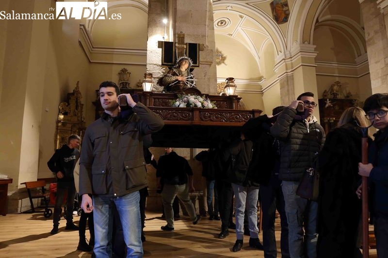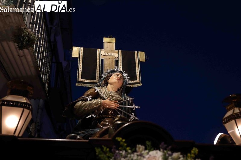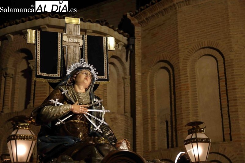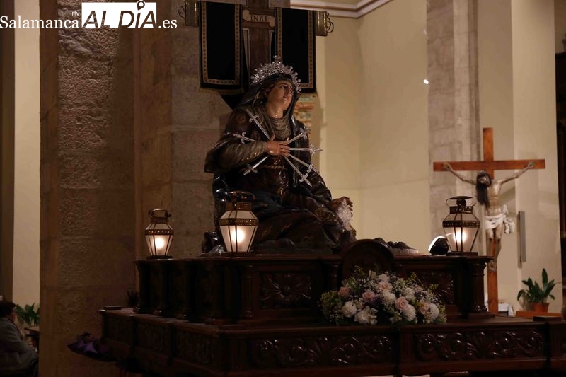 A la finalización del oficio religioso, las puertas de la iglesia de San Pedro se han abierto para dar paso a la procesión del Vía Crucis. El paso de la Virgen de los Dolores protagoniza este primer desfile procesional. La talla mariana avanza portada por los cofrades, marcando el ritmo de recogimiento que caracteriza a esta celebración religiosa.