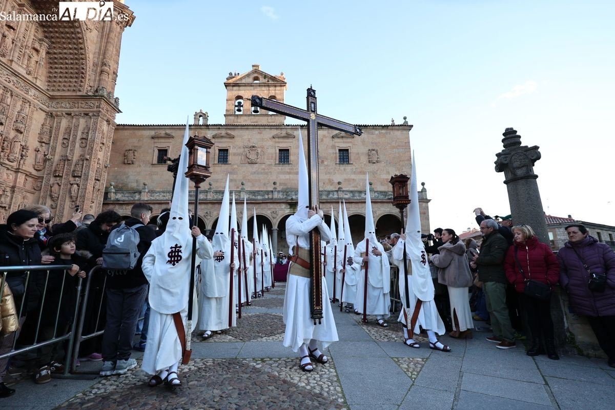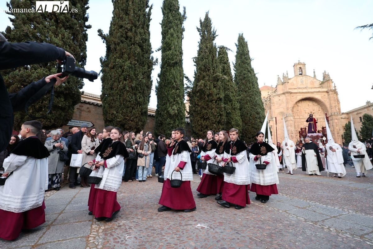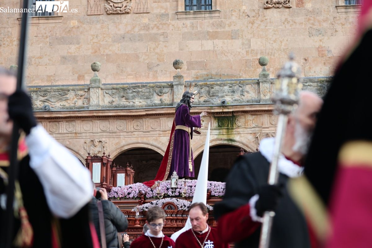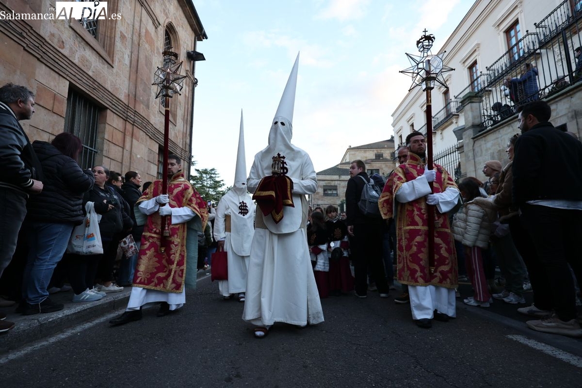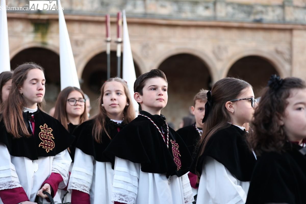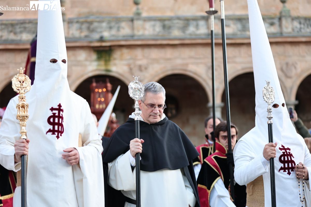 Emoción en el regreso de Jesús de la Redención a las calles de Salamanca. La Archicofradía del Rosario ha procesionado este Sábado Santo manteniendo la estructura consolidada en los últimos años. El cortejo contó nuevamente con los sones de la banda de la Santísima Trinidad de Palencia, que acompañó el caminar de los cofrades durante todo el itinerario tars su salida de la Iglesia de San Esteban.