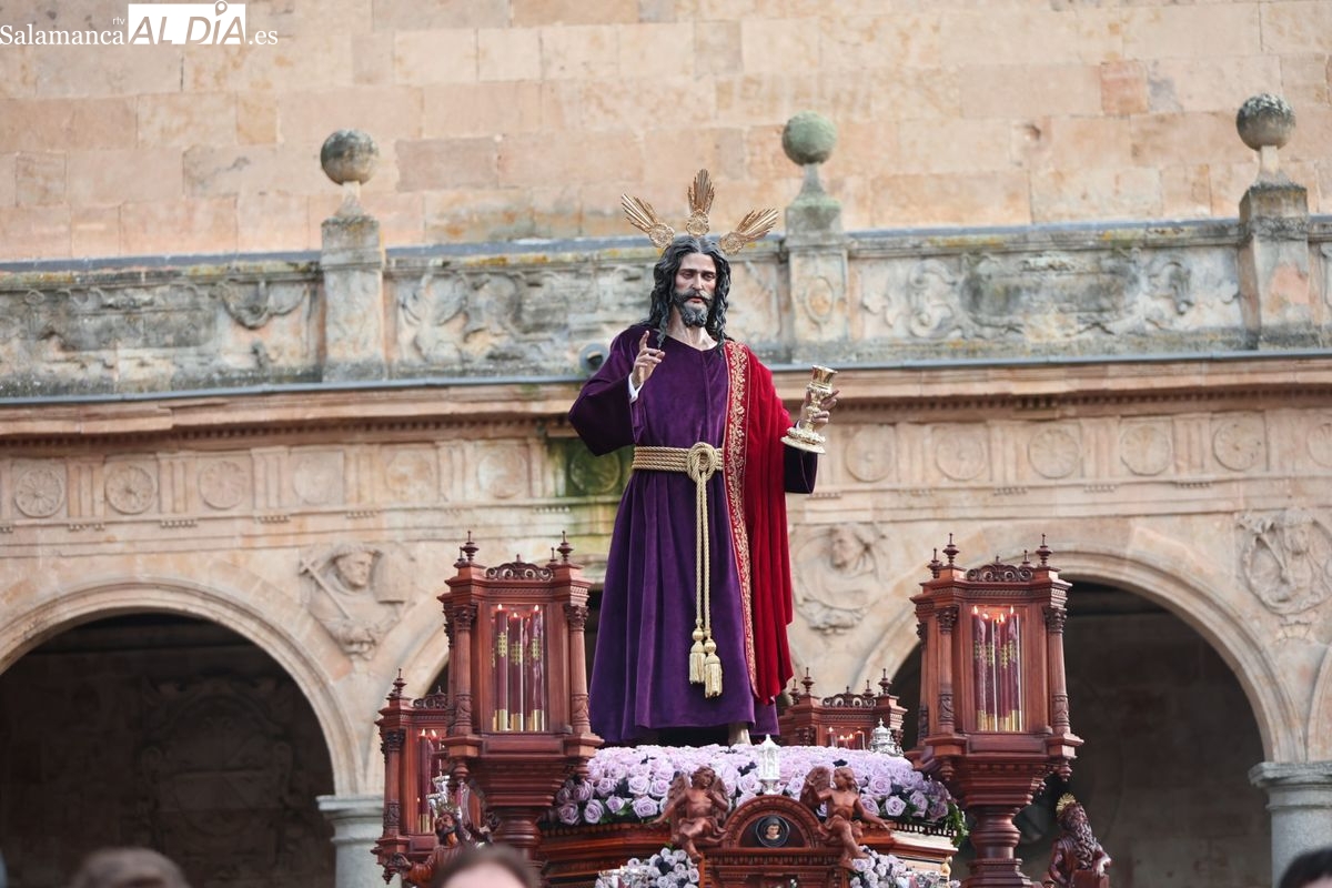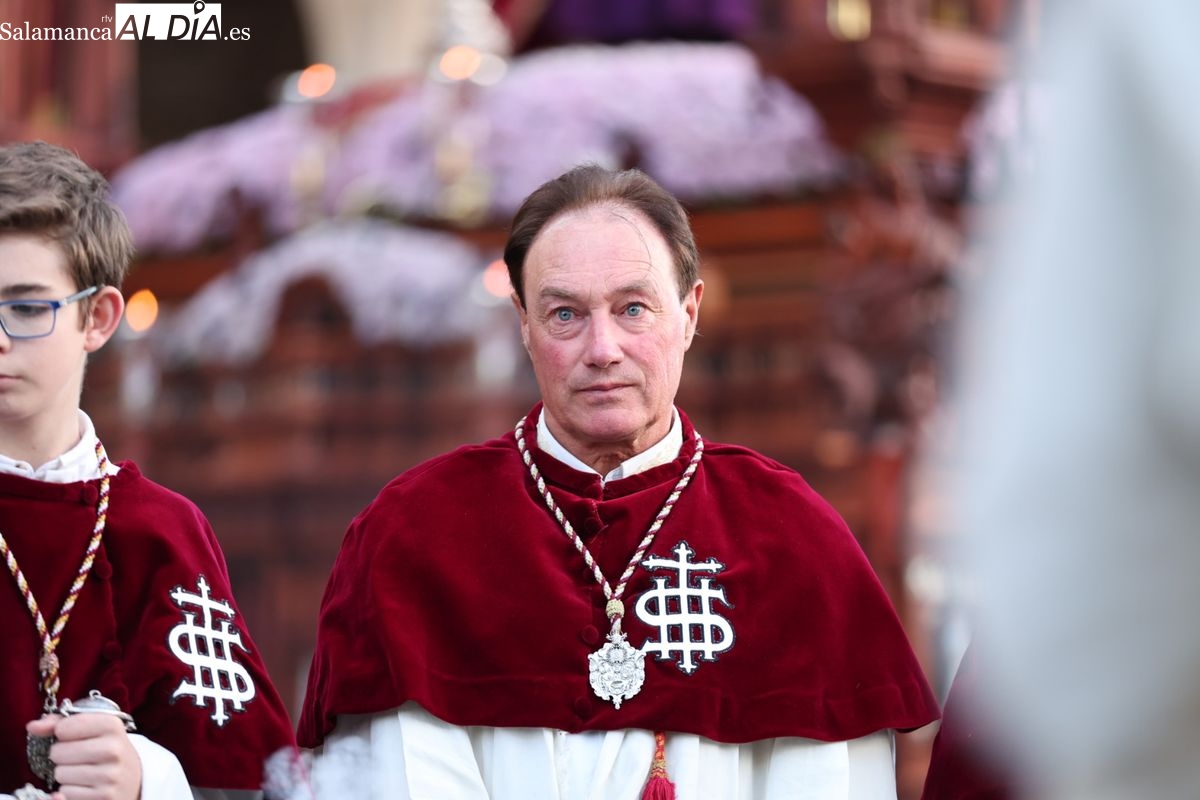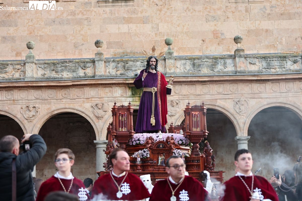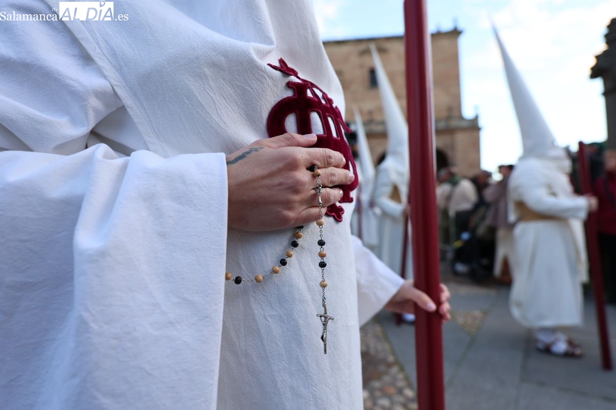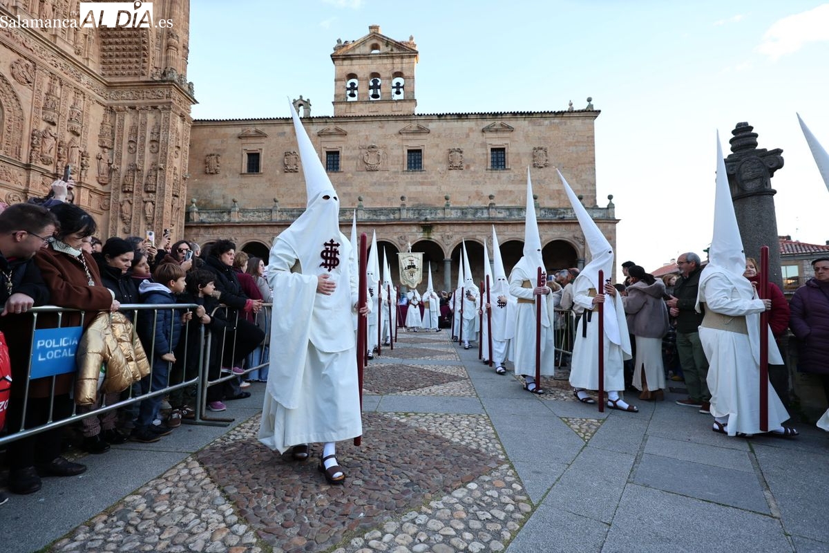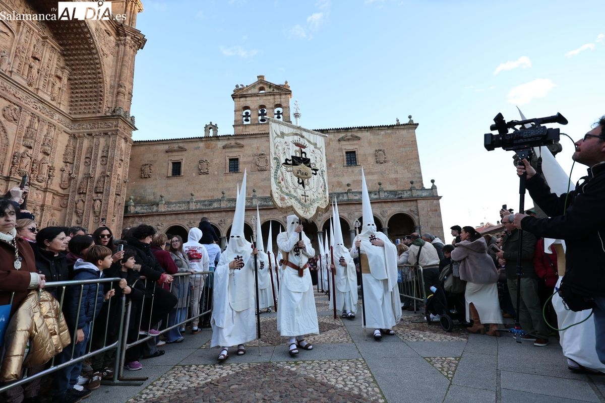 Emoción en el regreso de Jesús de la Redención a las calles de Salamanca. La Archicofradía del Rosario ha procesionado este Sábado Santo manteniendo la estructura consolidada en los últimos años. El cortejo contó nuevamente con los sones de la banda de la Santísima Trinidad de Palencia, que acompañó el caminar de los cofrades durante todo el itinerario tars su salida de la Iglesia de San Esteban.