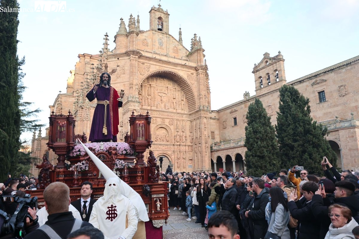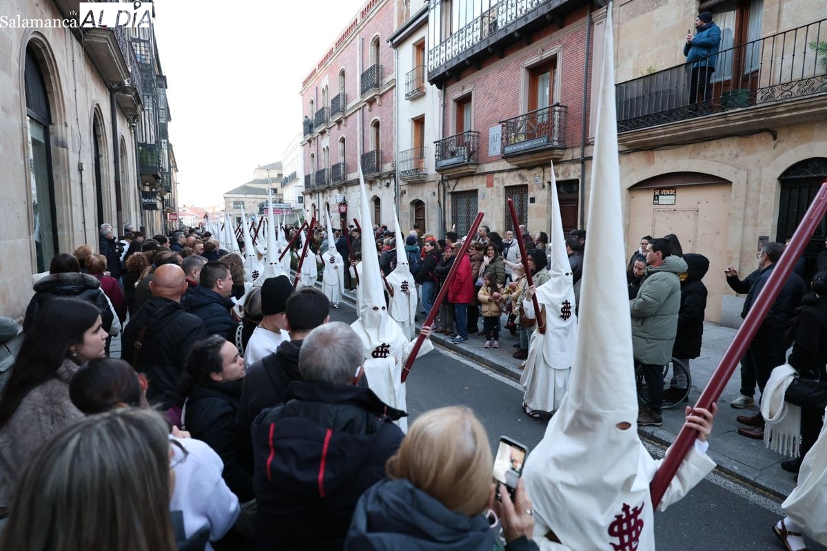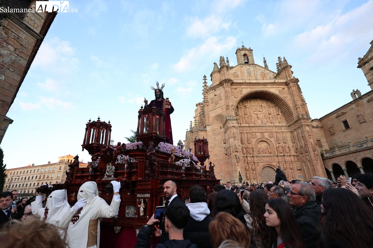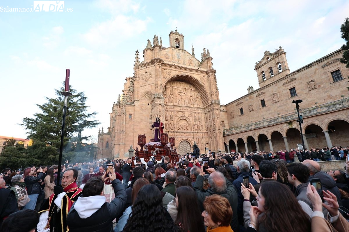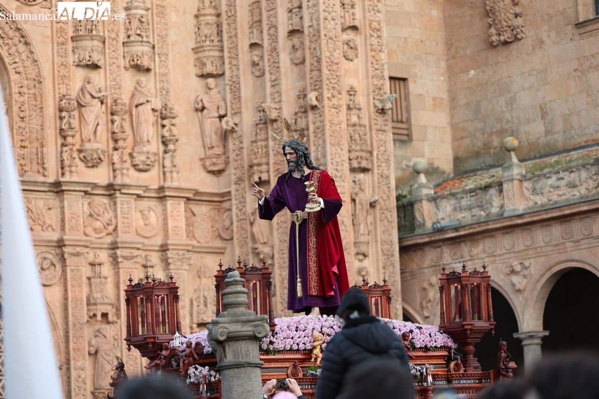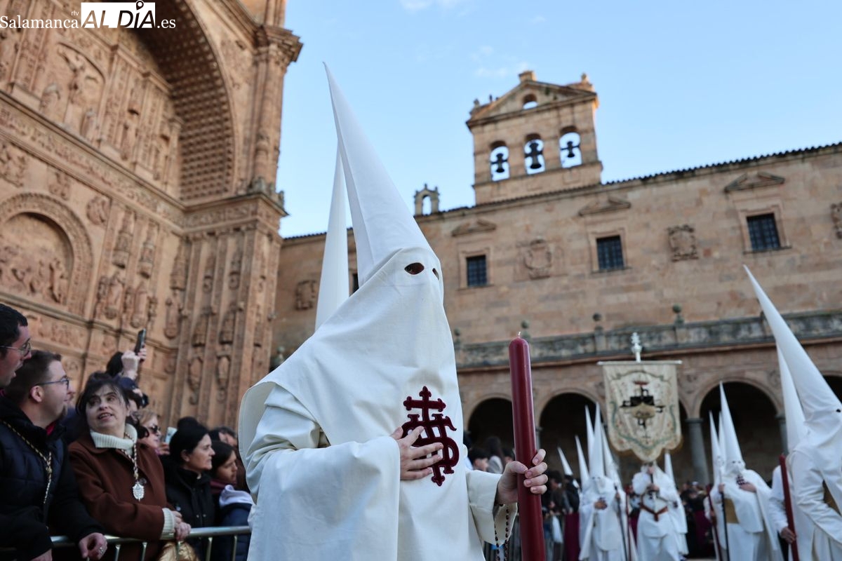 Emoción en el regreso de Jesús de la Redención a las calles de Salamanca. La Archicofradía del Rosario ha procesionado este Sábado Santo manteniendo la estructura consolidada en los últimos años. El cortejo contó nuevamente con los sones de la banda de la Santísima Trinidad de Palencia, que acompañó el caminar de los cofrades durante todo el itinerario tars su salida de la Iglesia de San Esteban.