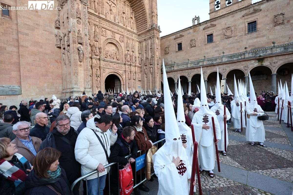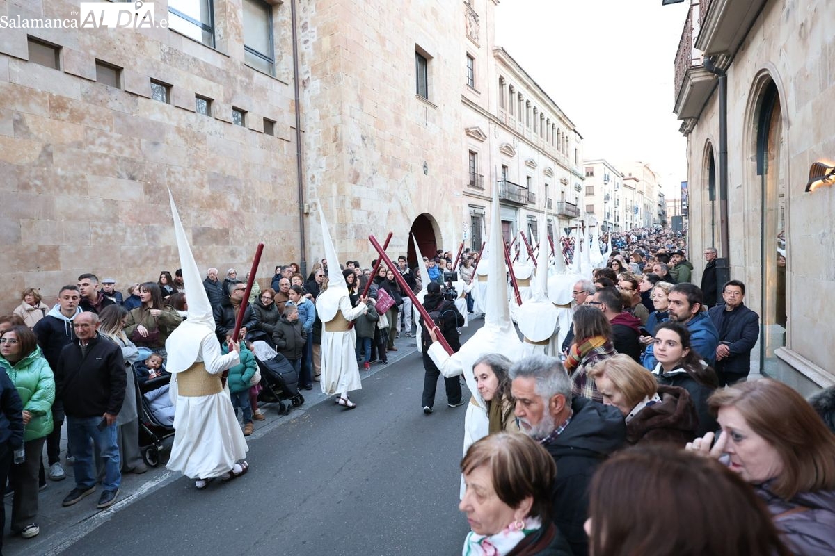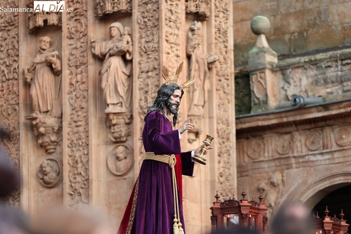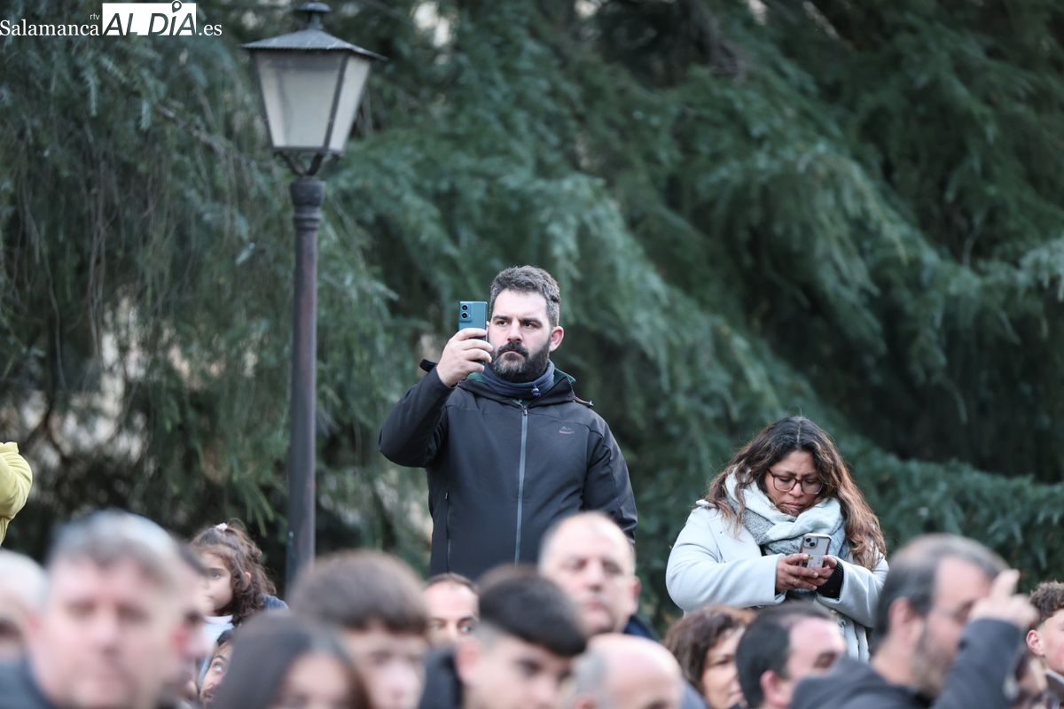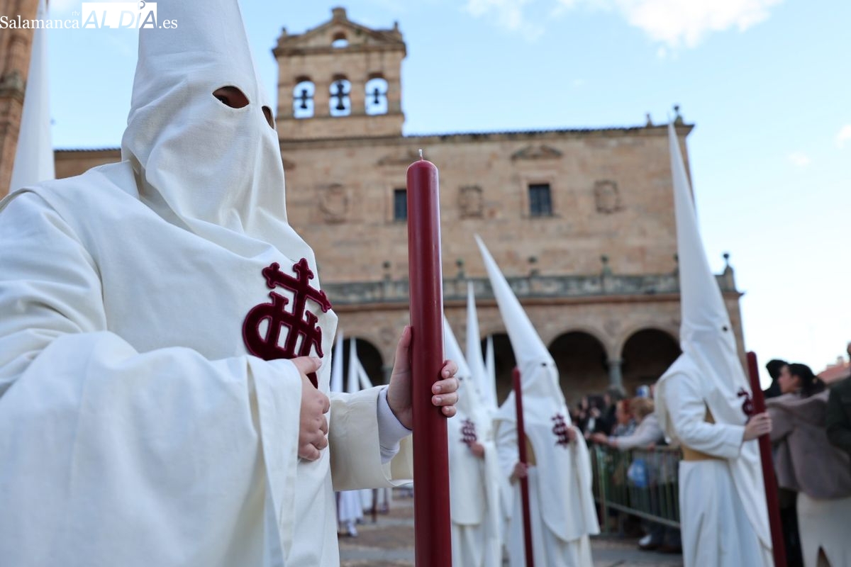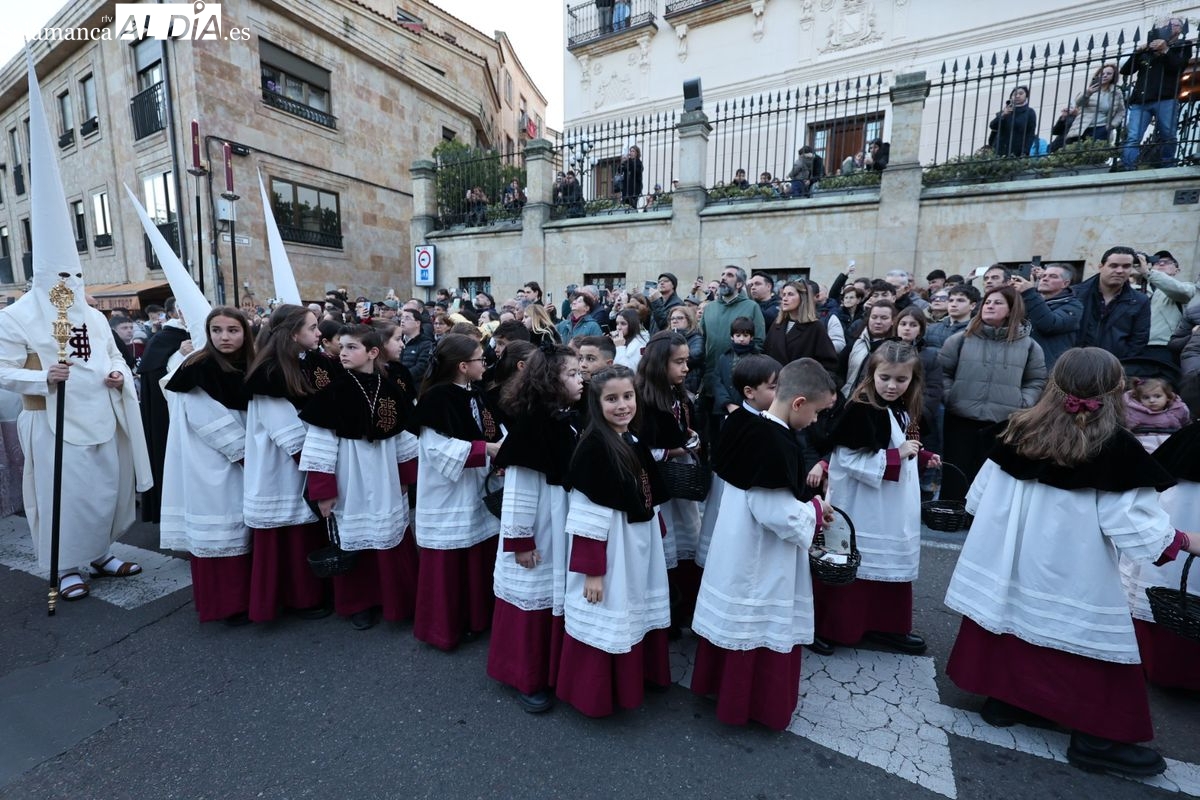 Emoción en el regreso de Jesús de la Redención a las calles de Salamanca. La Archicofradía del Rosario ha procesionado este Sábado Santo manteniendo la estructura consolidada en los últimos años. El cortejo contó nuevamente con los sones de la banda de la Santísima Trinidad de Palencia, que acompañó el caminar de los cofrades durante todo el itinerario tars su salida de la Iglesia de San Esteban.