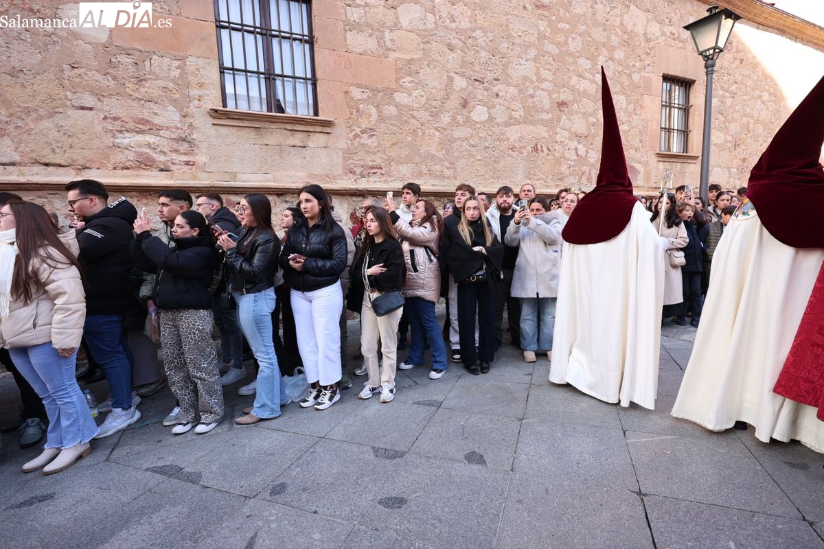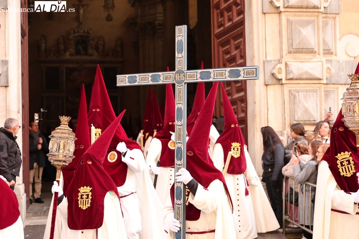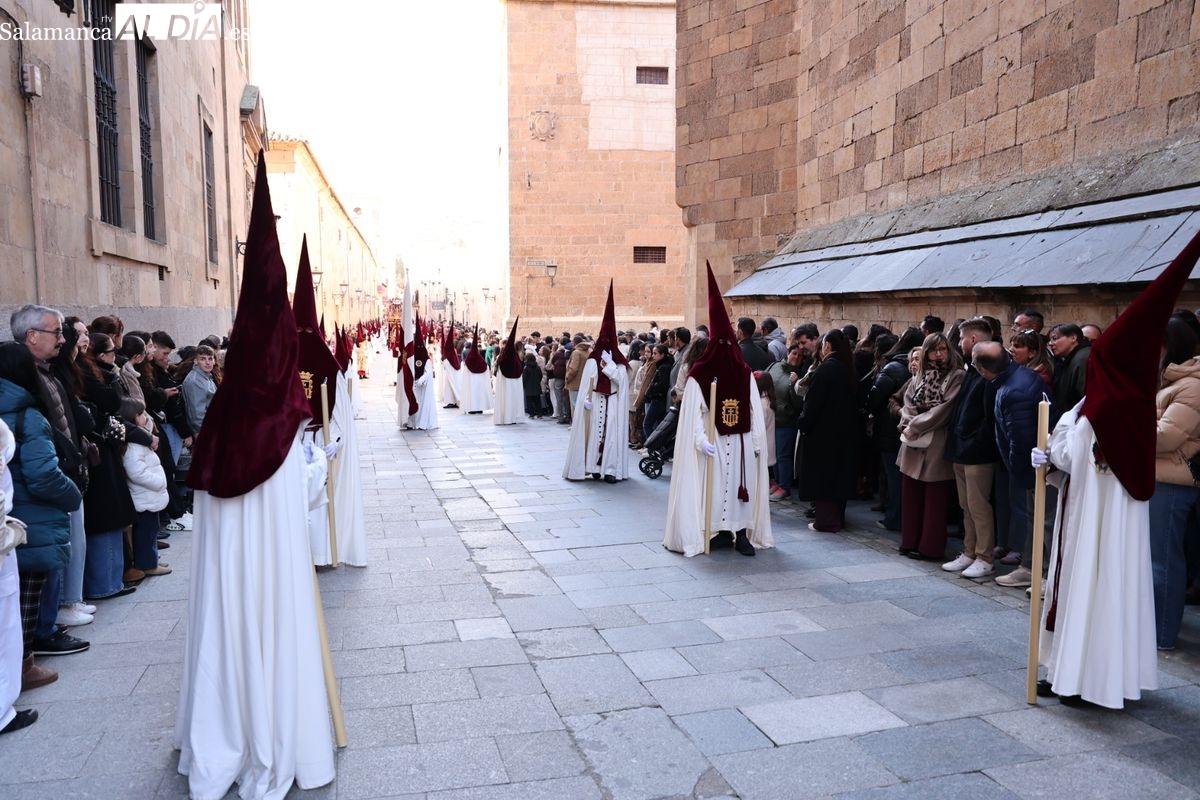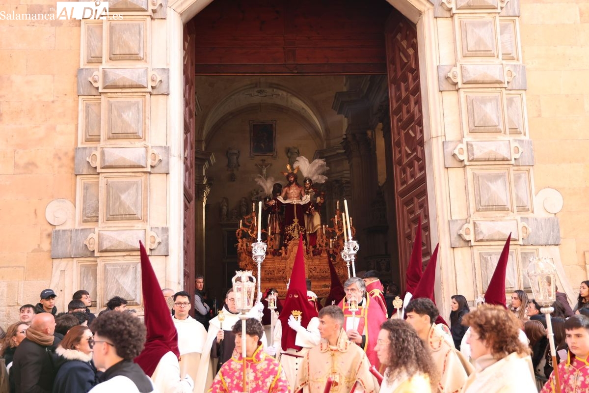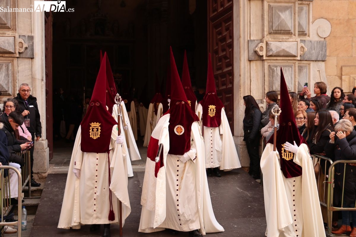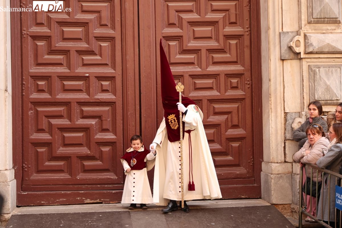 La Hermandad de Jesús Despojado de sus Vestiduras y María Santísima de la Caridad y del Consuelo ha iniciado su estación de penitencia este Domingo de Ramos desde la iglesia de La Purísima. Cientos de fieles se han congregado para presenciar la salida de una de las cofradías más numerosas de la capital salmantina, que este año presenta importantes novedades patrimoniales.