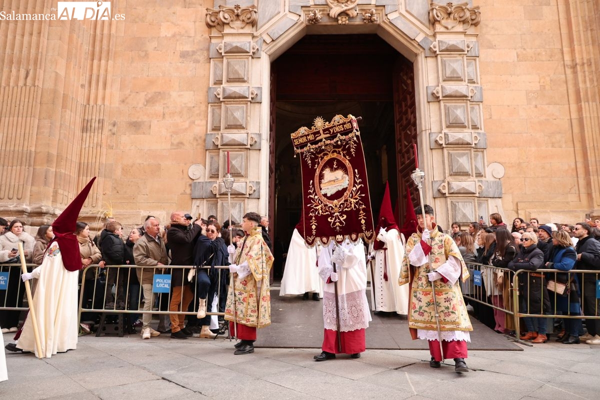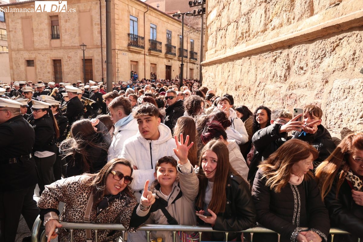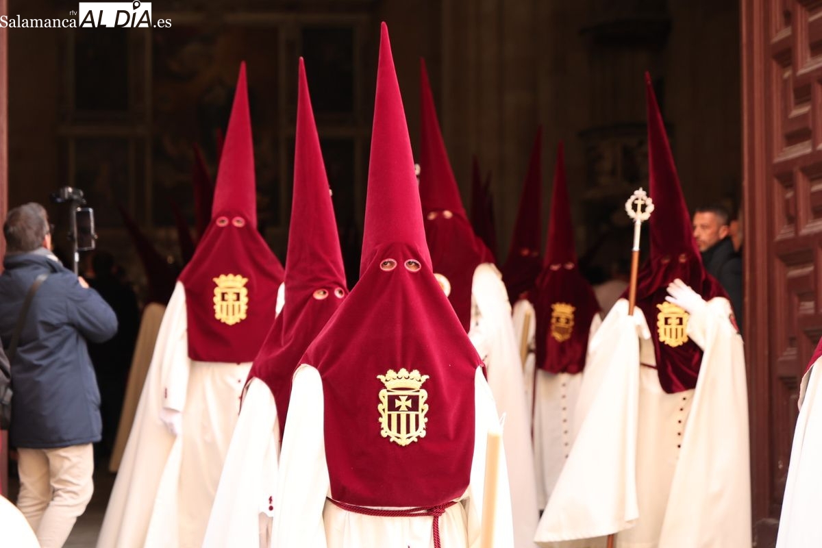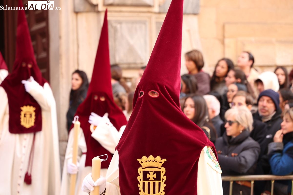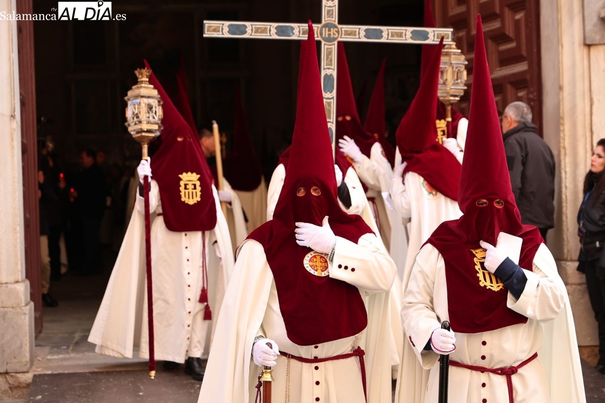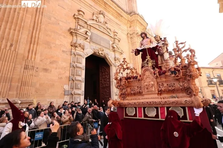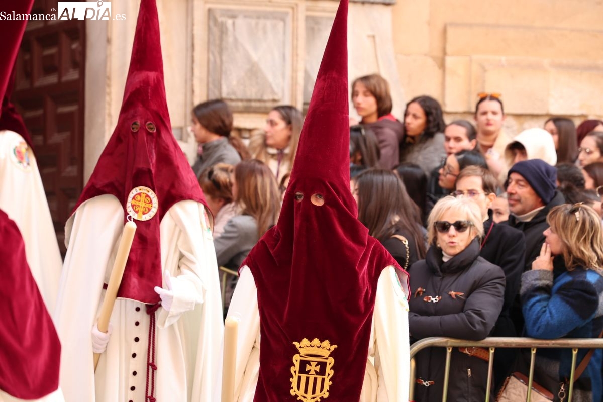 La Hermandad de Jesús Despojado de sus Vestiduras y María Santísima de la Caridad y del Consuelo ha iniciado su estación de penitencia este Domingo de Ramos desde la iglesia de La Purísima. Cientos de fieles se han congregado para presenciar la salida de una de las cofradías más numerosas de la capital salmantina, que este año presenta importantes novedades patrimoniales.
