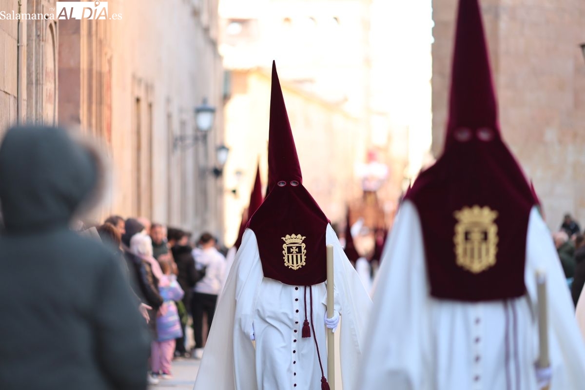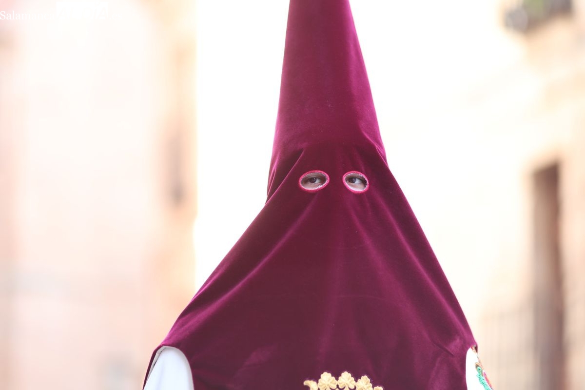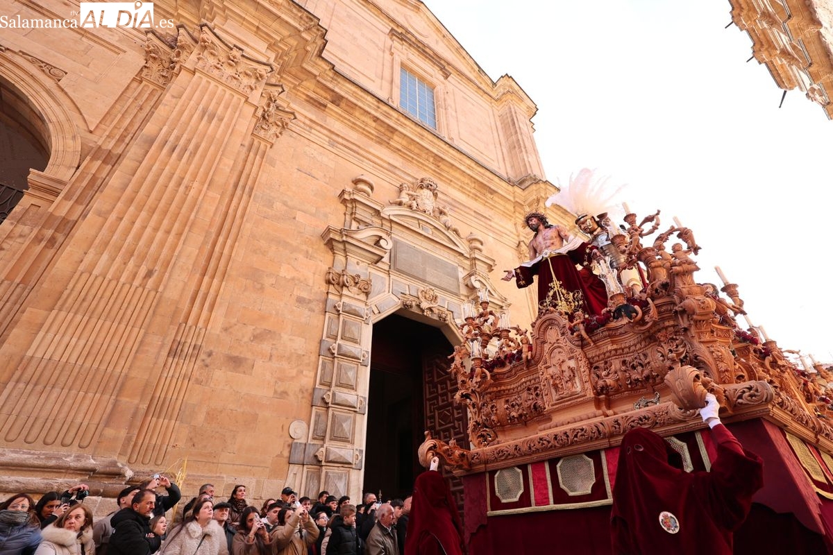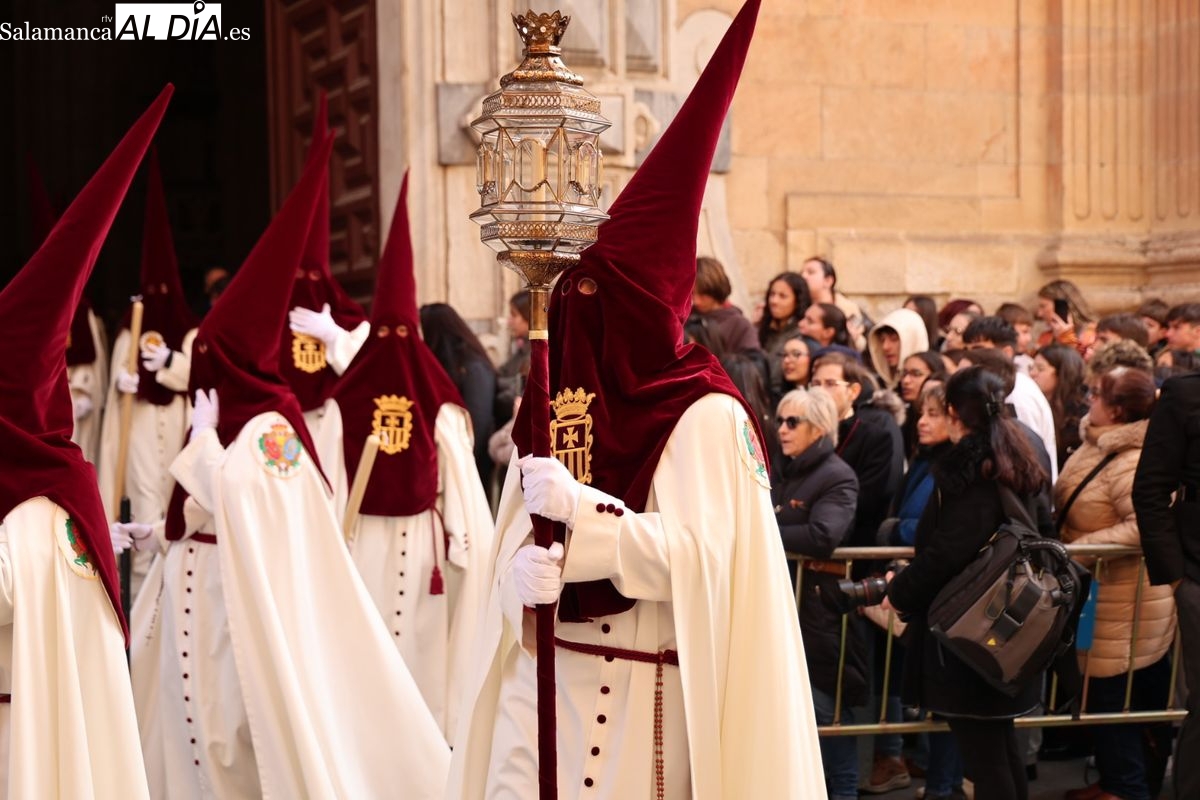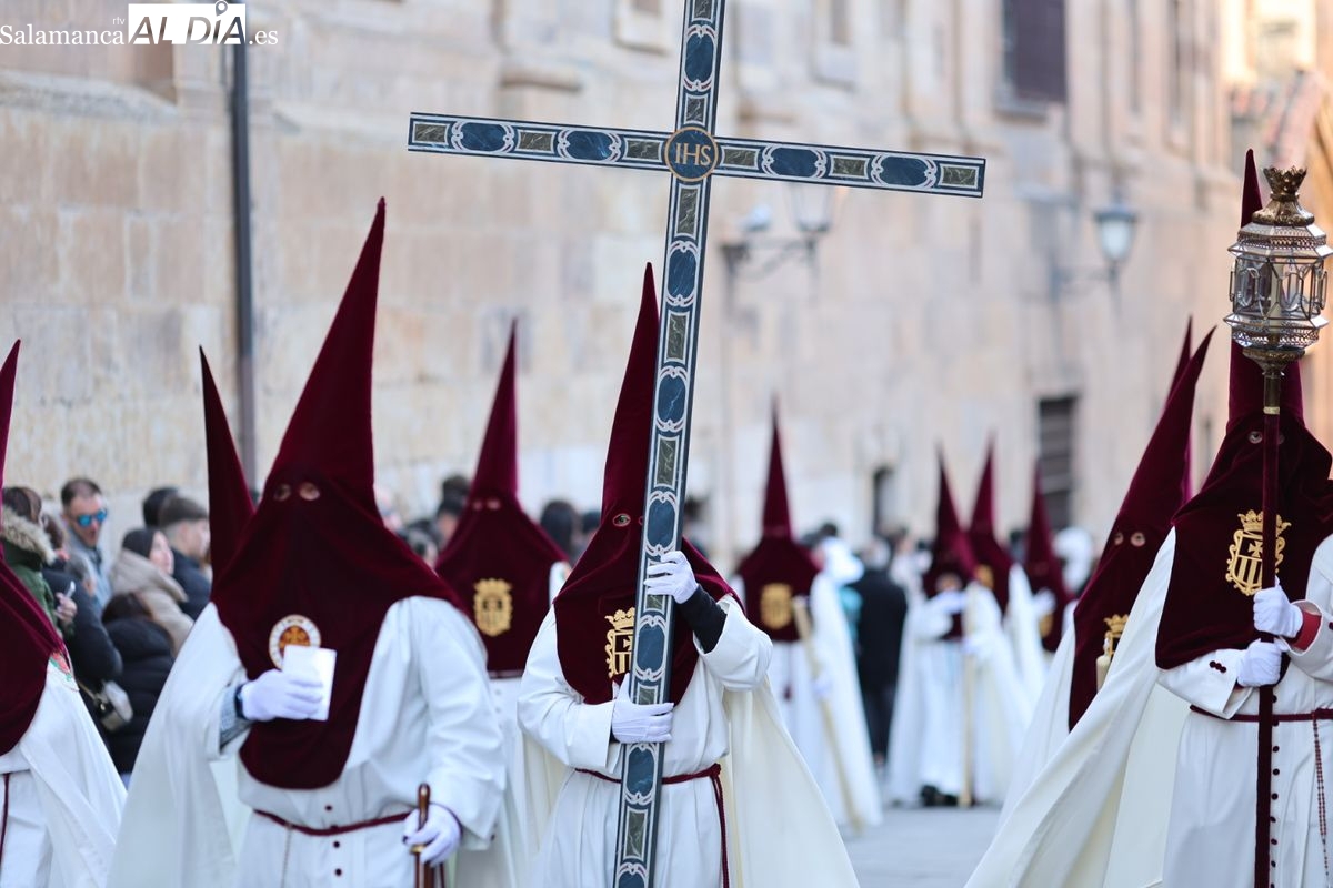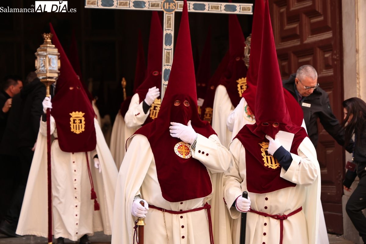 La Hermandad de Jesús Despojado de sus Vestiduras y María Santísima de la Caridad y del Consuelo ha iniciado su estación de penitencia este Domingo de Ramos desde la iglesia de La Purísima. Cientos de fieles se han congregado para presenciar la salida de una de las cofradías más numerosas de la capital salmantina, que este año presenta importantes novedades patrimoniales.