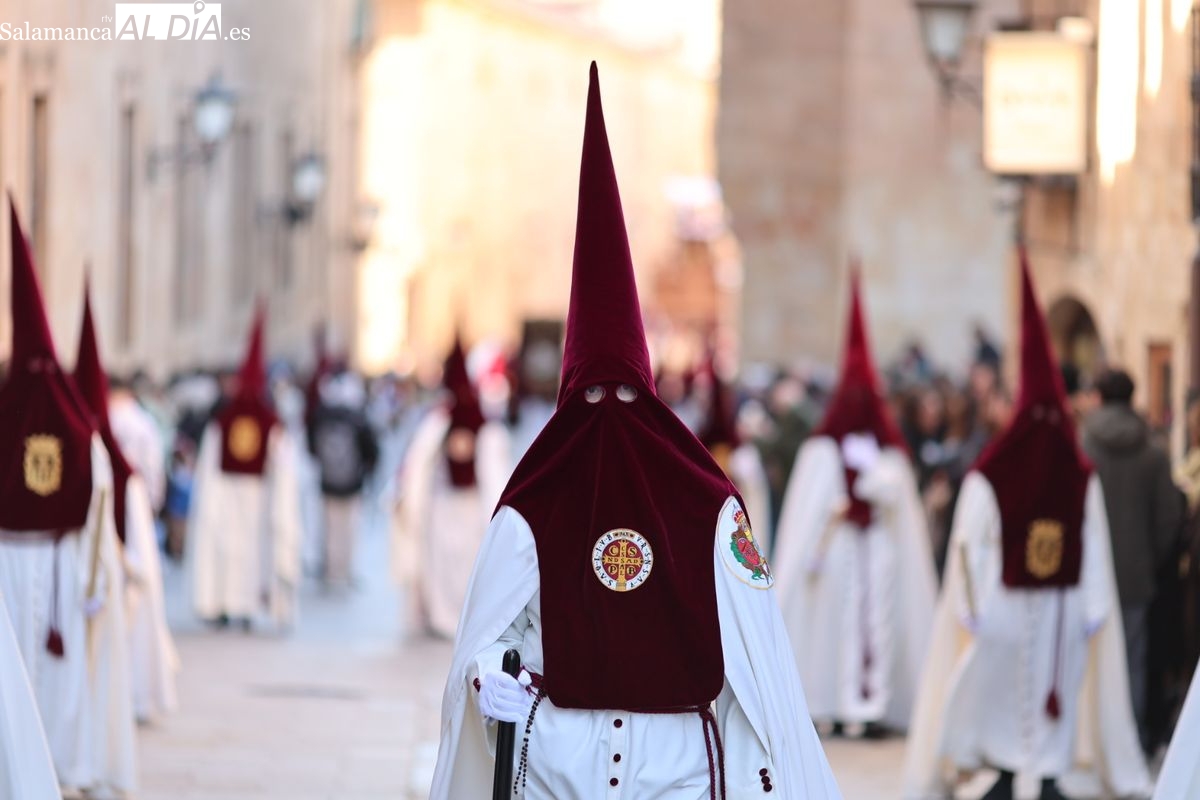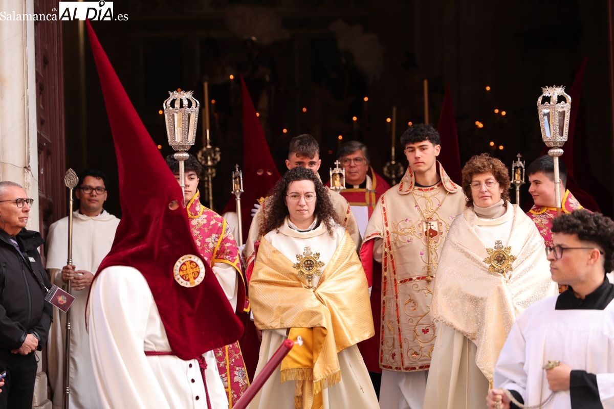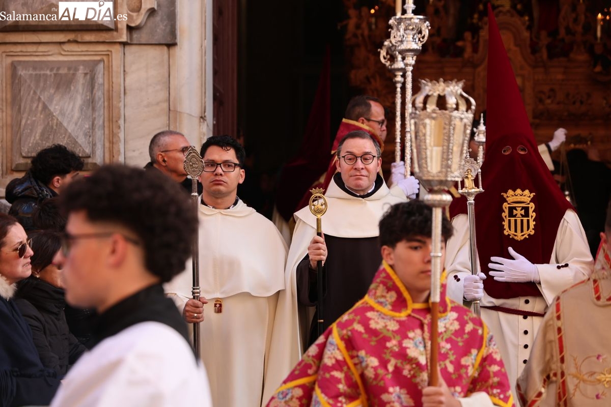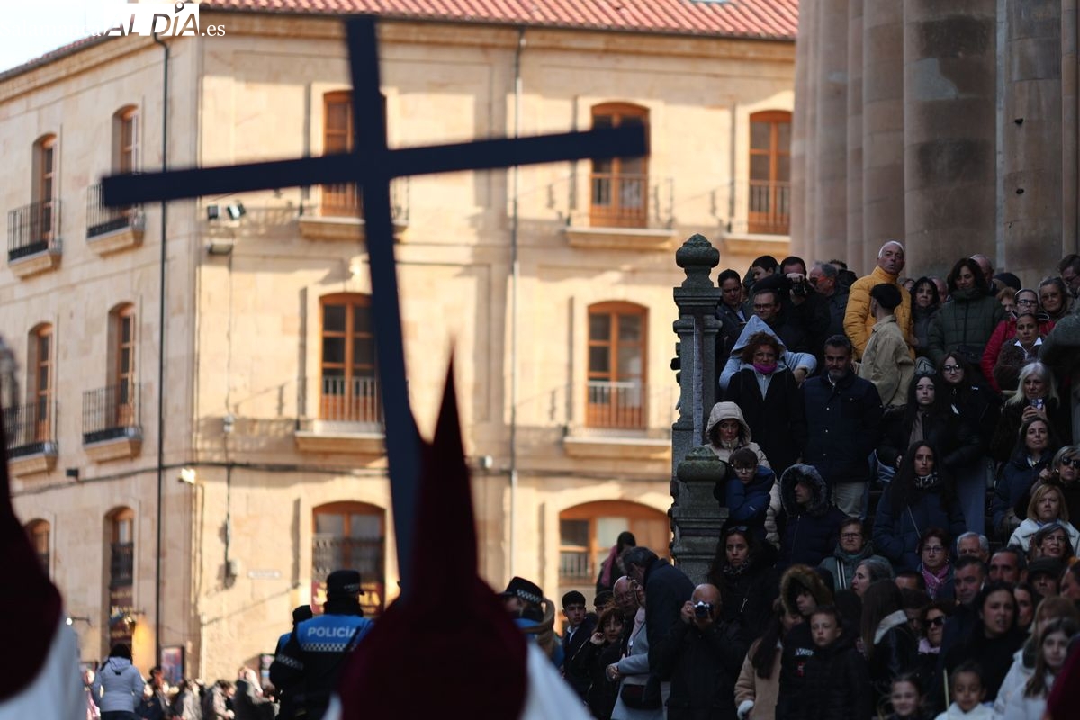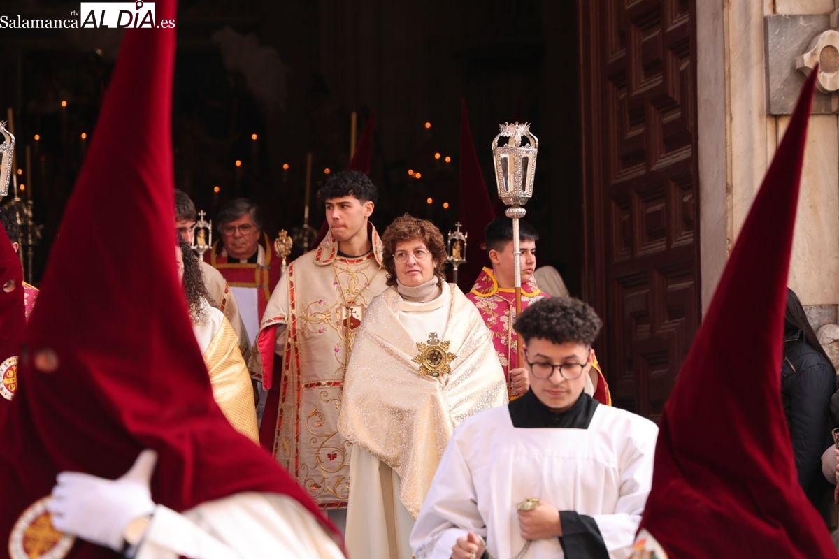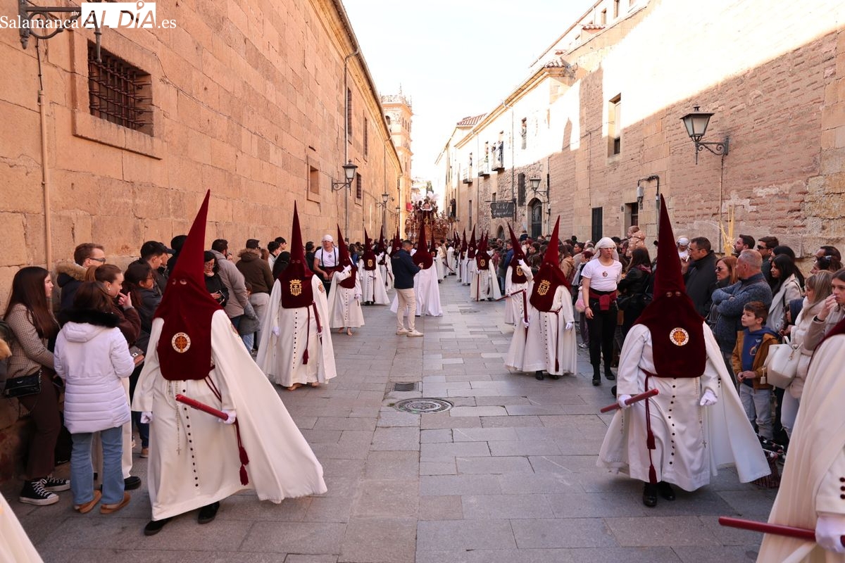 La Hermandad de Jesús Despojado de sus Vestiduras y María Santísima de la Caridad y del Consuelo ha iniciado su estación de penitencia este Domingo de Ramos desde la iglesia de La Purísima. Cientos de fieles se han congregado para presenciar la salida de una de las cofradías más numerosas de la capital salmantina, que este año presenta importantes novedades patrimoniales.
