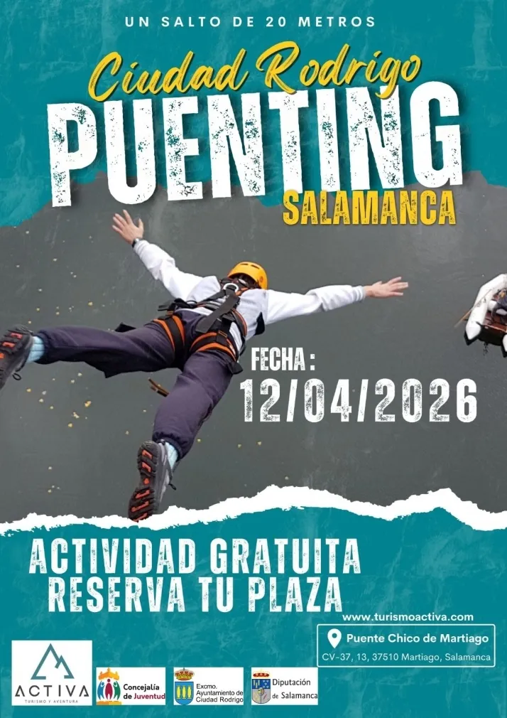 El Ayuntamiento de Ciudad Rodrigo, a través de su Concejalía de Juventud, ha organizado una jornada de puenting gratuita que se celebrará el próximo 12 de abril de 2026. La iniciativa cuenta con el respaldo de la Diputación de Salamanca y la empresa especializada Activa Turismo y Aventura.