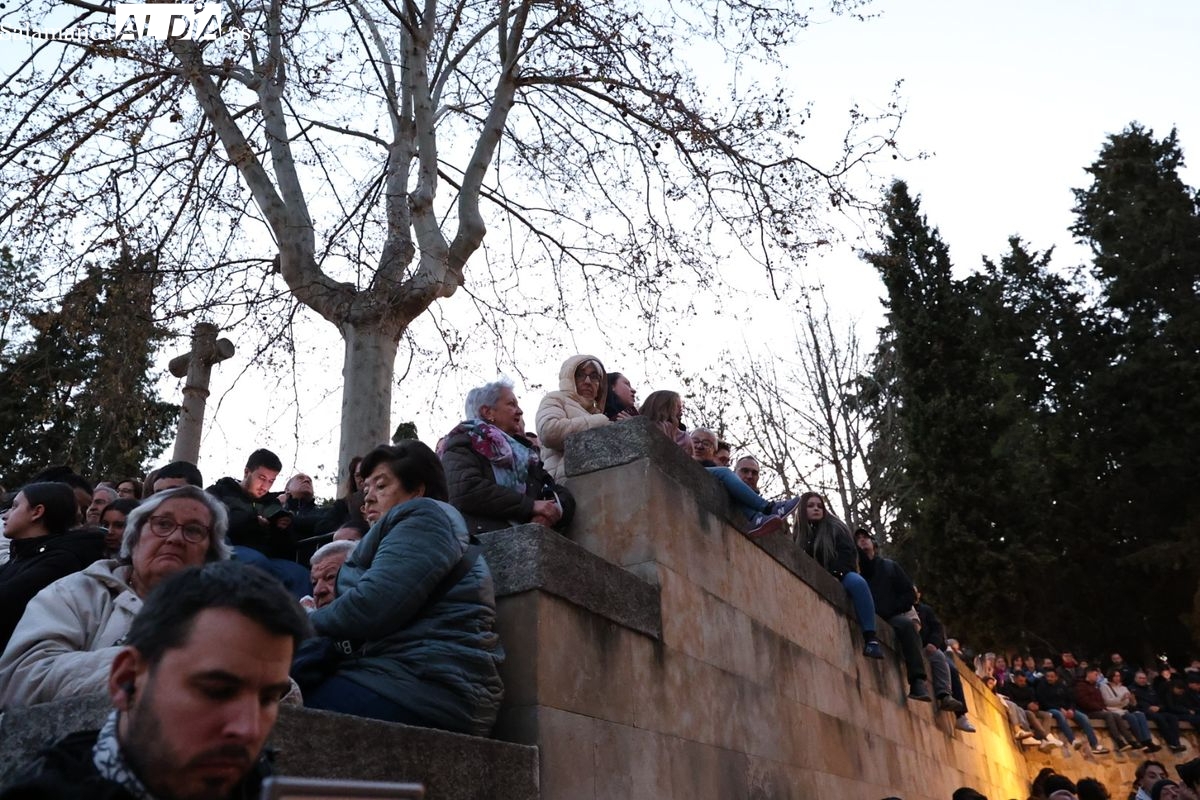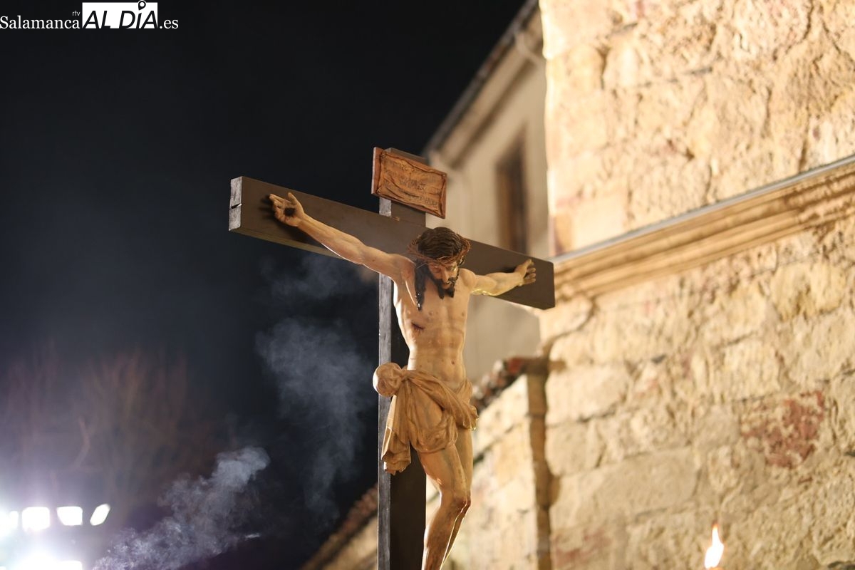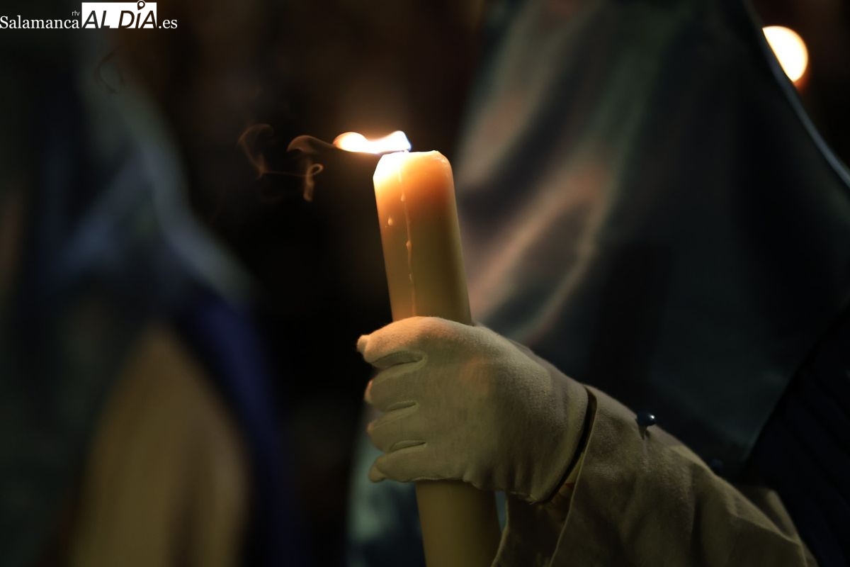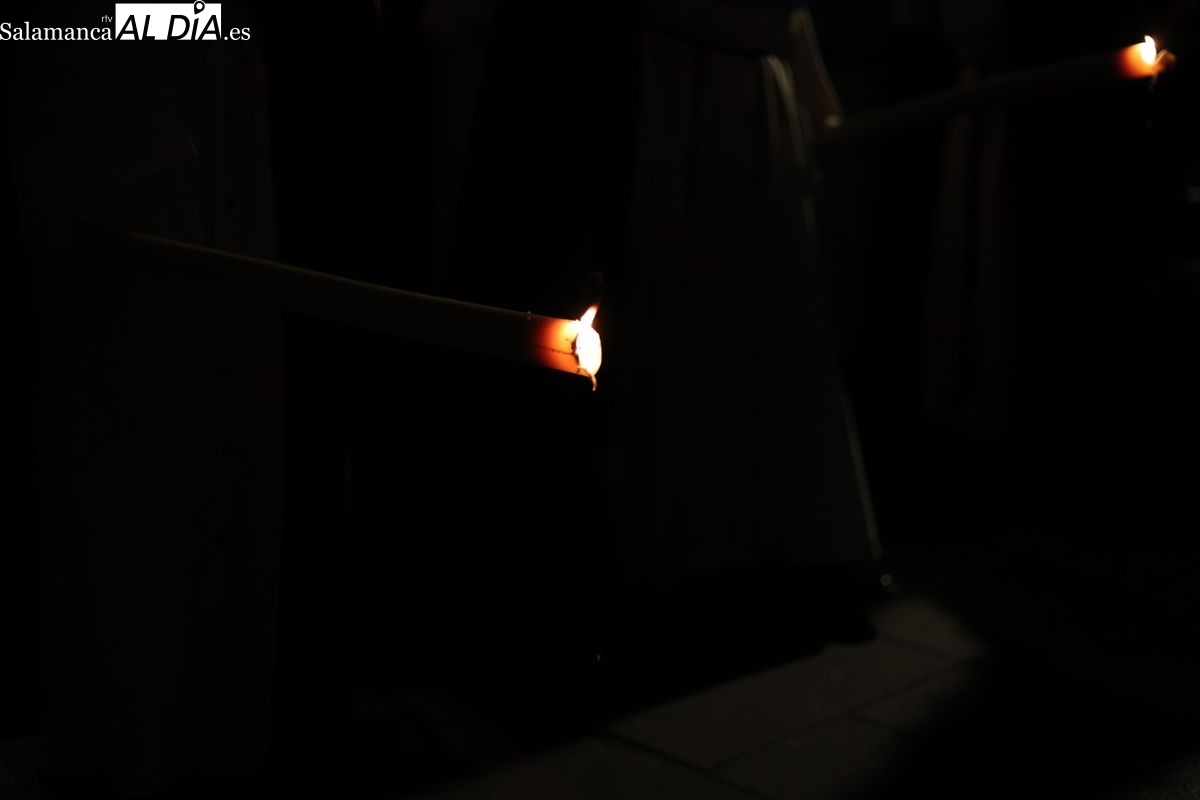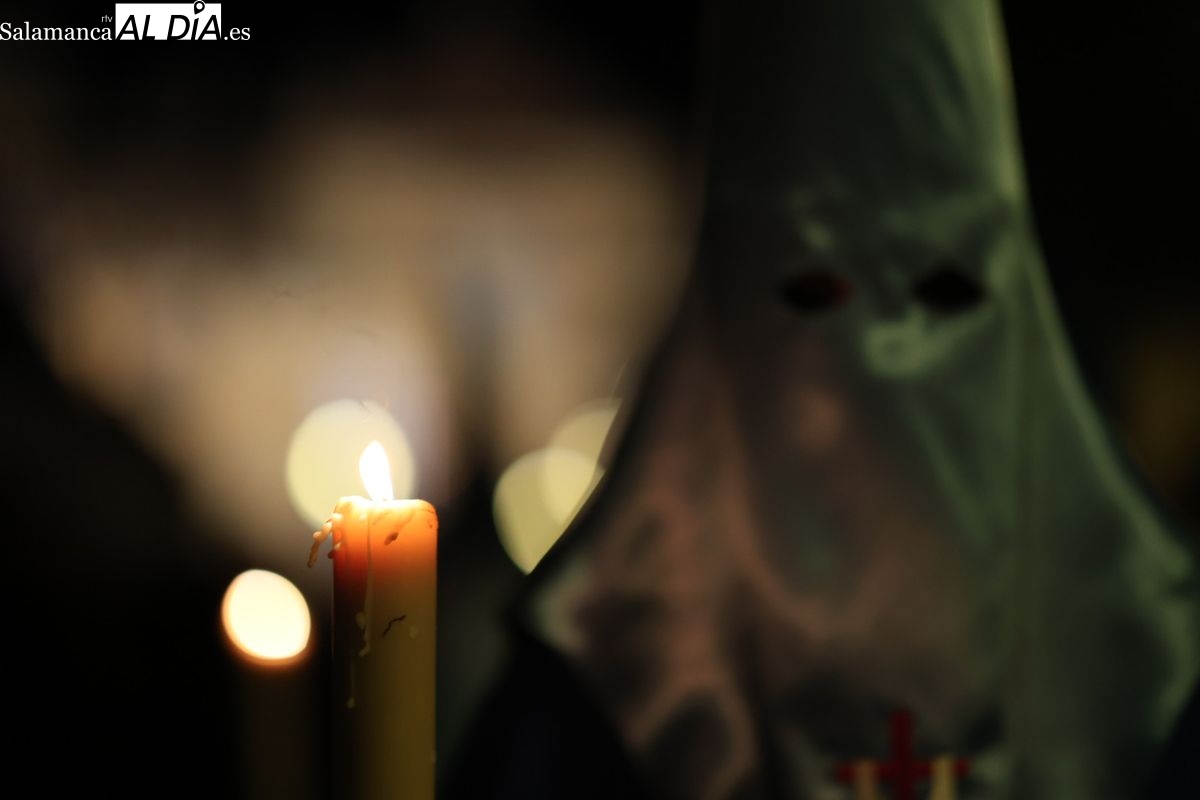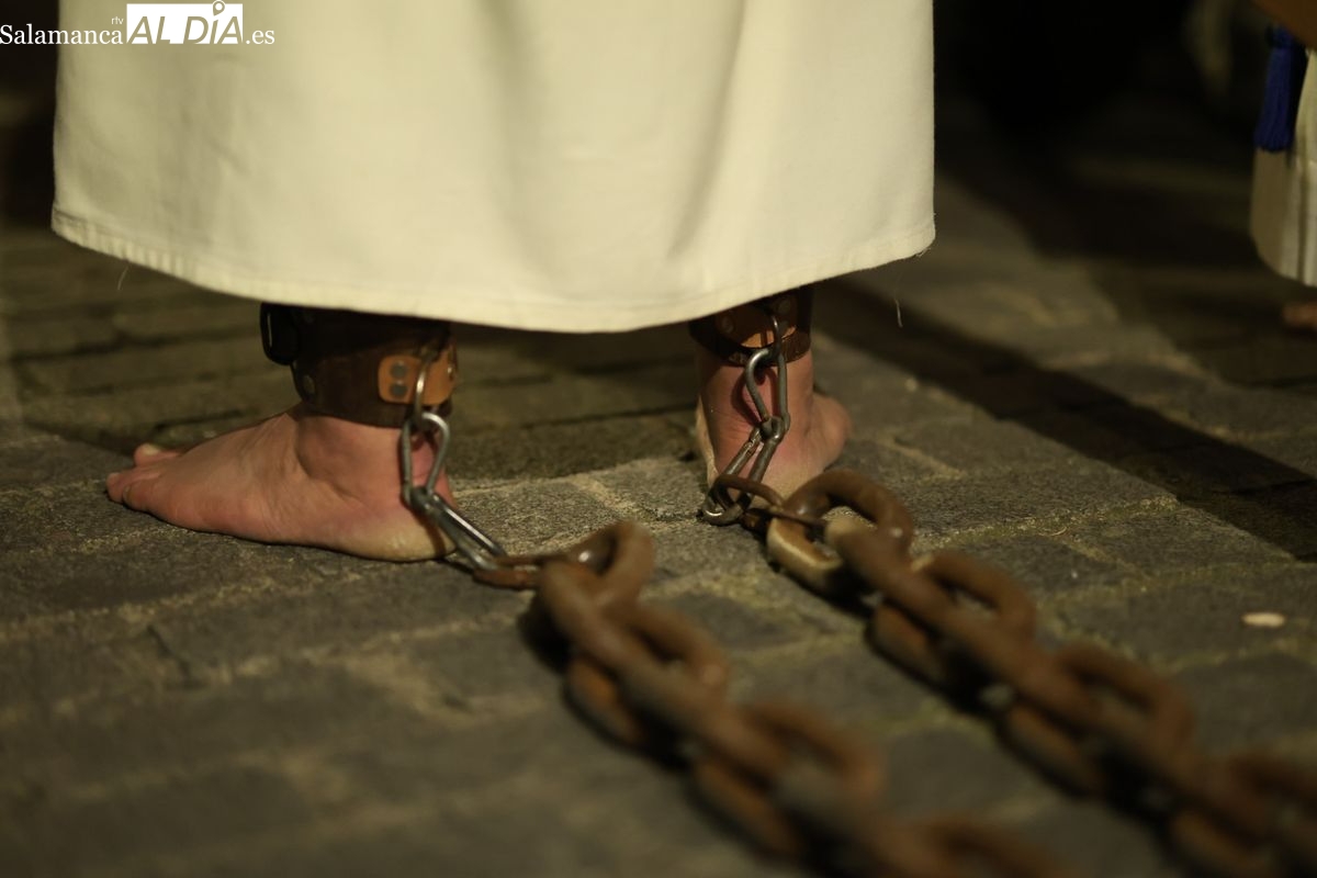 El sonido de las cadenas de los penitentes ha roto el sobrecogedor silencio que caracteriza a la procesión del Cristo de los Doctrinos. El desfile, que ha comenzado a las 21:00 horas desde la iglesia de la Vera Cruz, ha recorrido el centro histórico de la ciudad en la noche de este Lunes Santo.