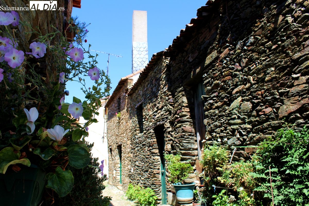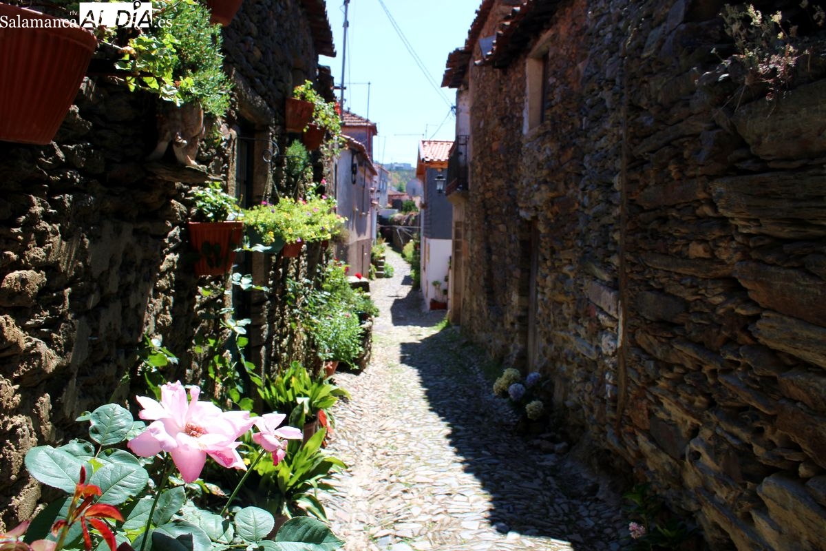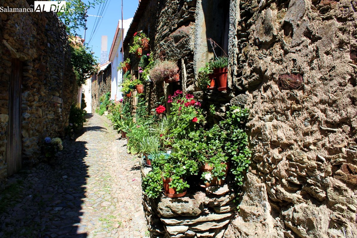 Sin saber cómo damos con una angosta calle, pavimento y muros en pizarra y granito. Una callejuela que sería oscura si no fuera porque toda ella se encuentra cubierta de flores. Son flores sencillas: geranios, petunias, hortensias o, incluso, una planta con enormes tréboles de tres y de cuatro hojas, sí, de cuatro hojas y bien distinguibles.