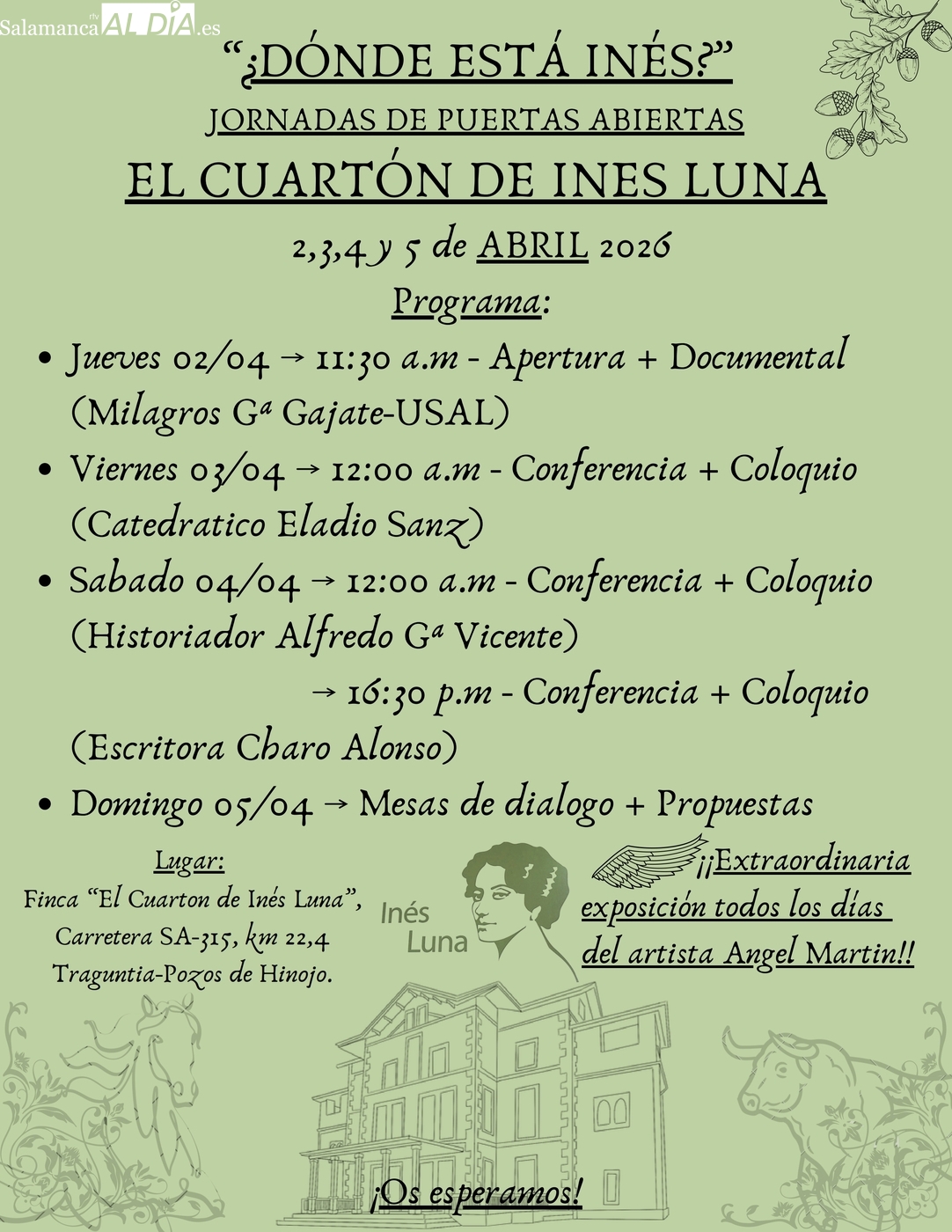 La finca El Cuartón de Inés Luna ha dado el pistoletazo de salida este jueves a sus segundas jornadas de puertas abiertas, tituladas '¿Dónde está Inés?'. El palacete situado en Traguntía abre sus puertas para celebrar la edición primaveral del proyecto Campus Convivia. La iniciativa arranca con una muestra escultórica sobre la Pasión de Cristo y la proyección de un trabajo audiovisual, reuniendo a autoridades y habitantes de la comarca en torno al legado de la conocida como la 'BB' salmantina.