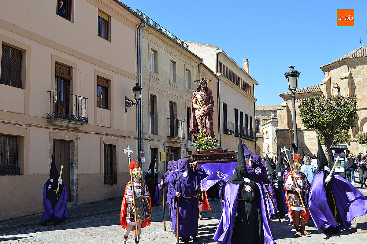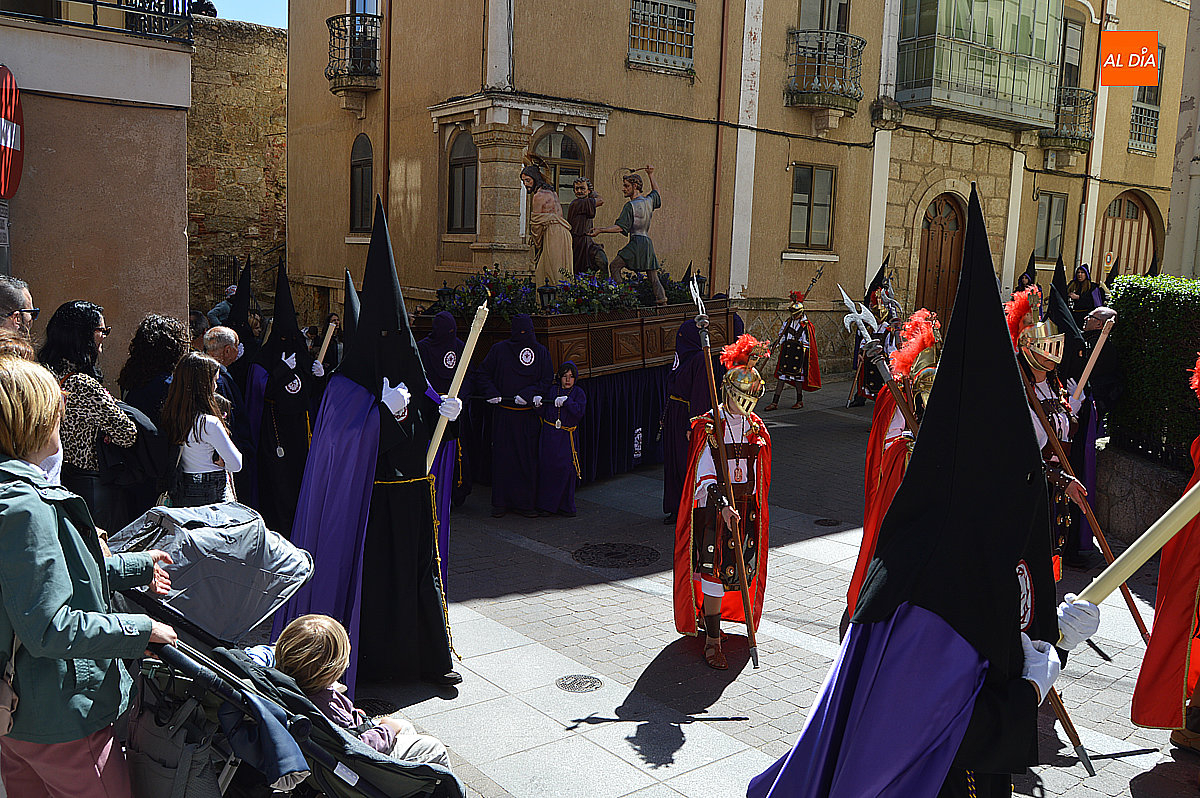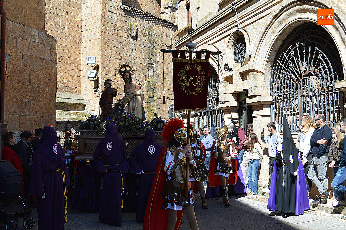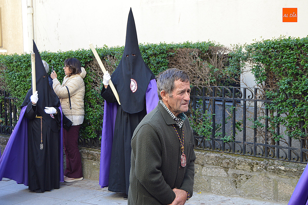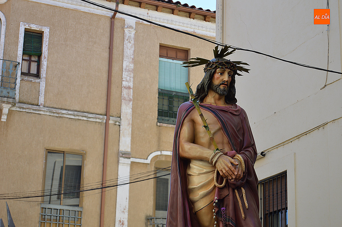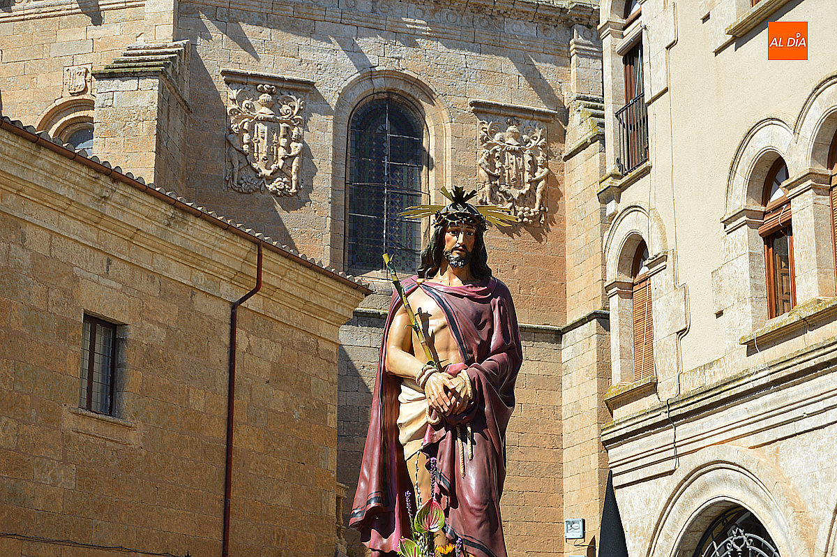 La cofradía de Jesús Nazareno ha celebrado la Procesión del Paso de la Agonía en la mañana del Jueves Santo en Ciudad Rodrigo. Los pasos del Ecce Homo y Los Azotes han recorrido el casco histórico hasta la Catedral de Santa María en un ambiente de profundo silencio y solemnidad.
