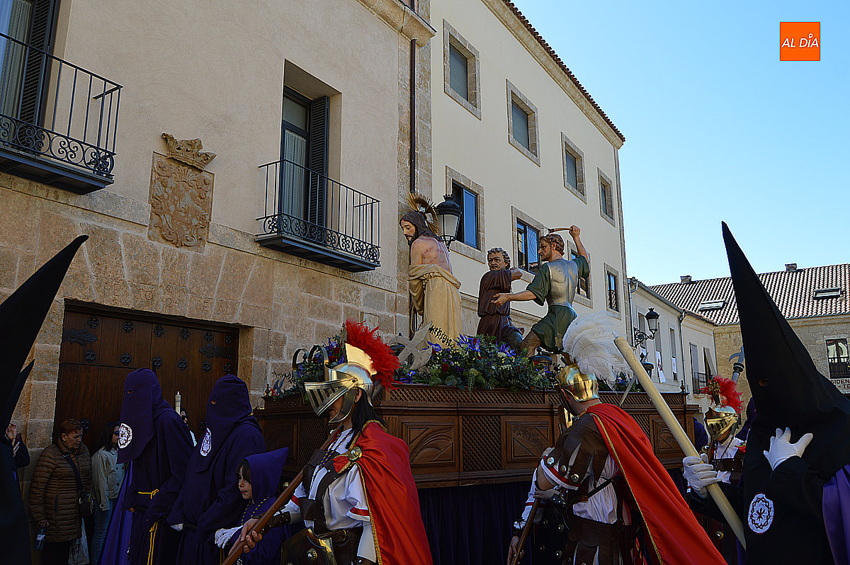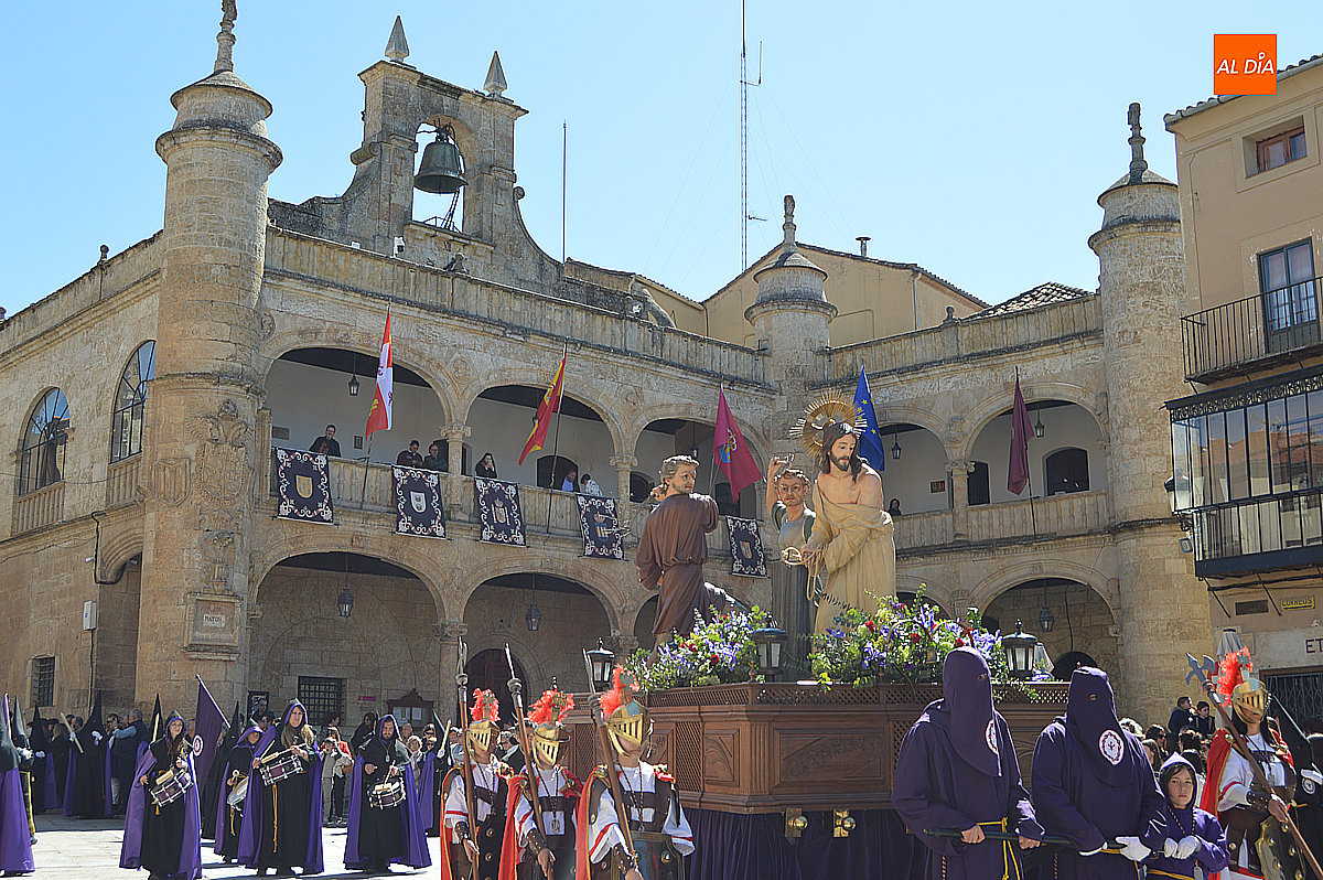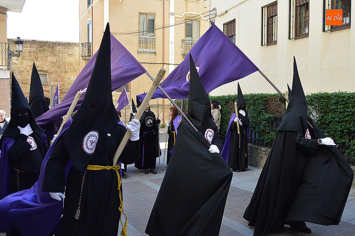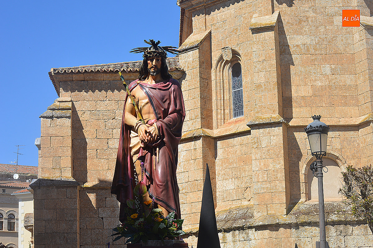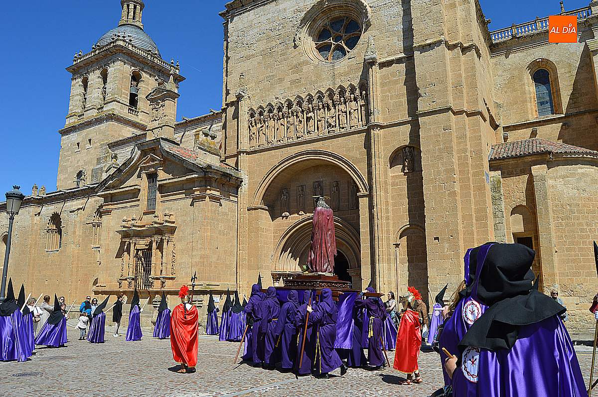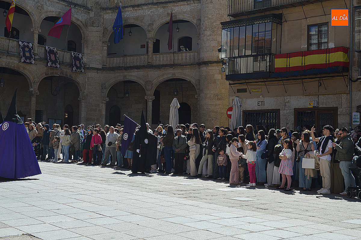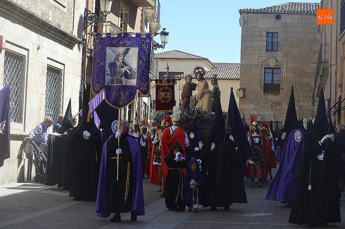 La cofradía de Jesús Nazareno ha celebrado la Procesión del Paso de la Agonía en la mañana del Jueves Santo en Ciudad Rodrigo. Los pasos del Ecce Homo y Los Azotes han recorrido el casco histórico hasta la Catedral de Santa María en un ambiente de profundo silencio y solemnidad.
