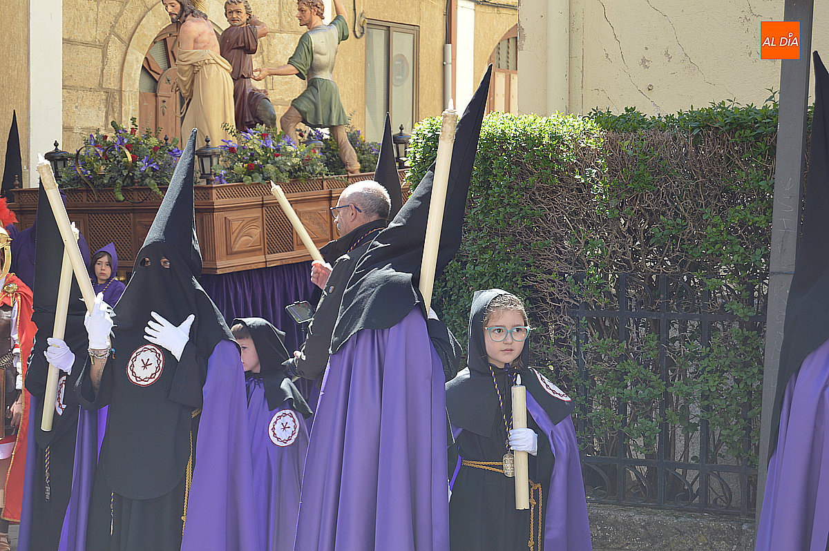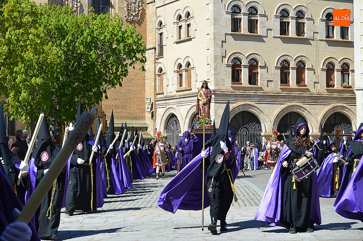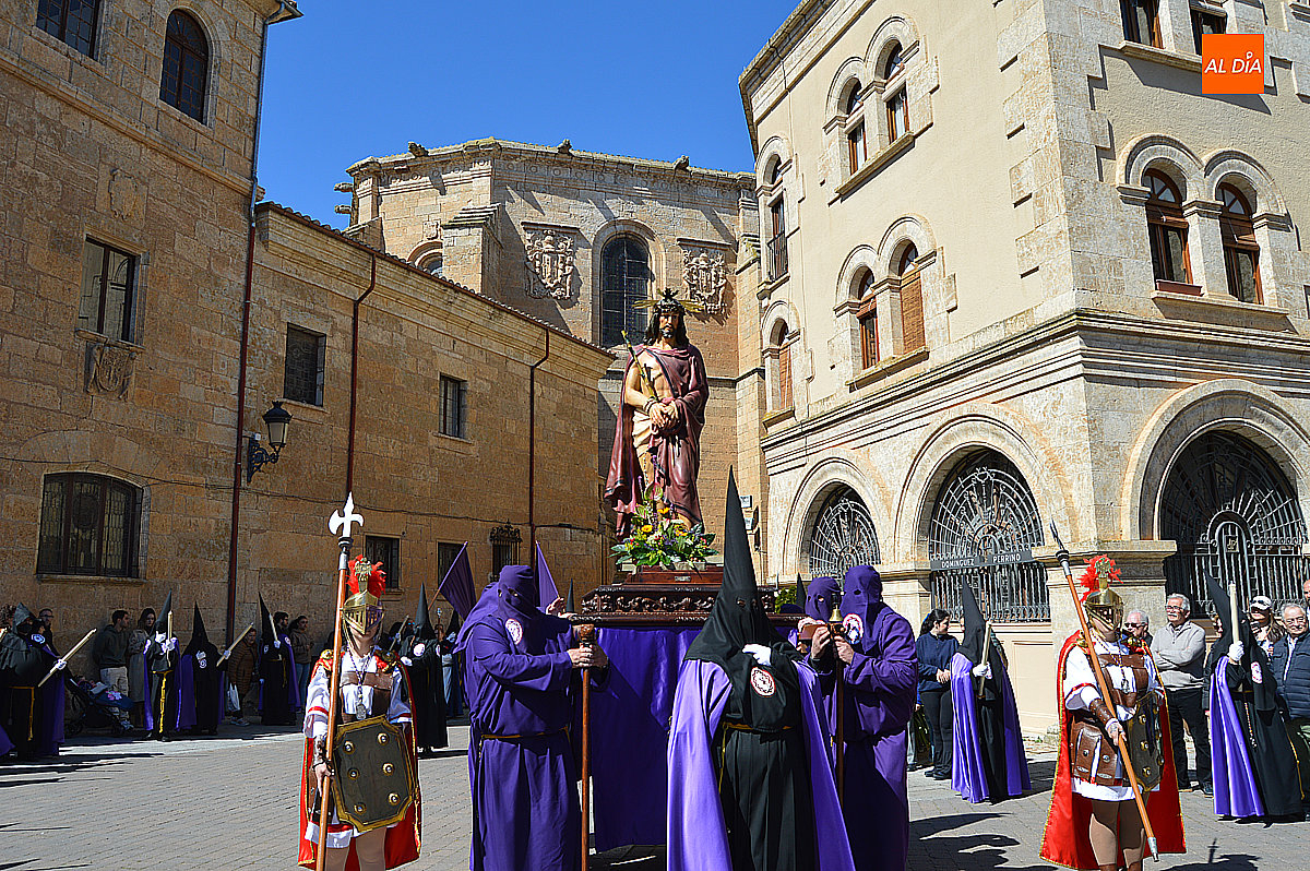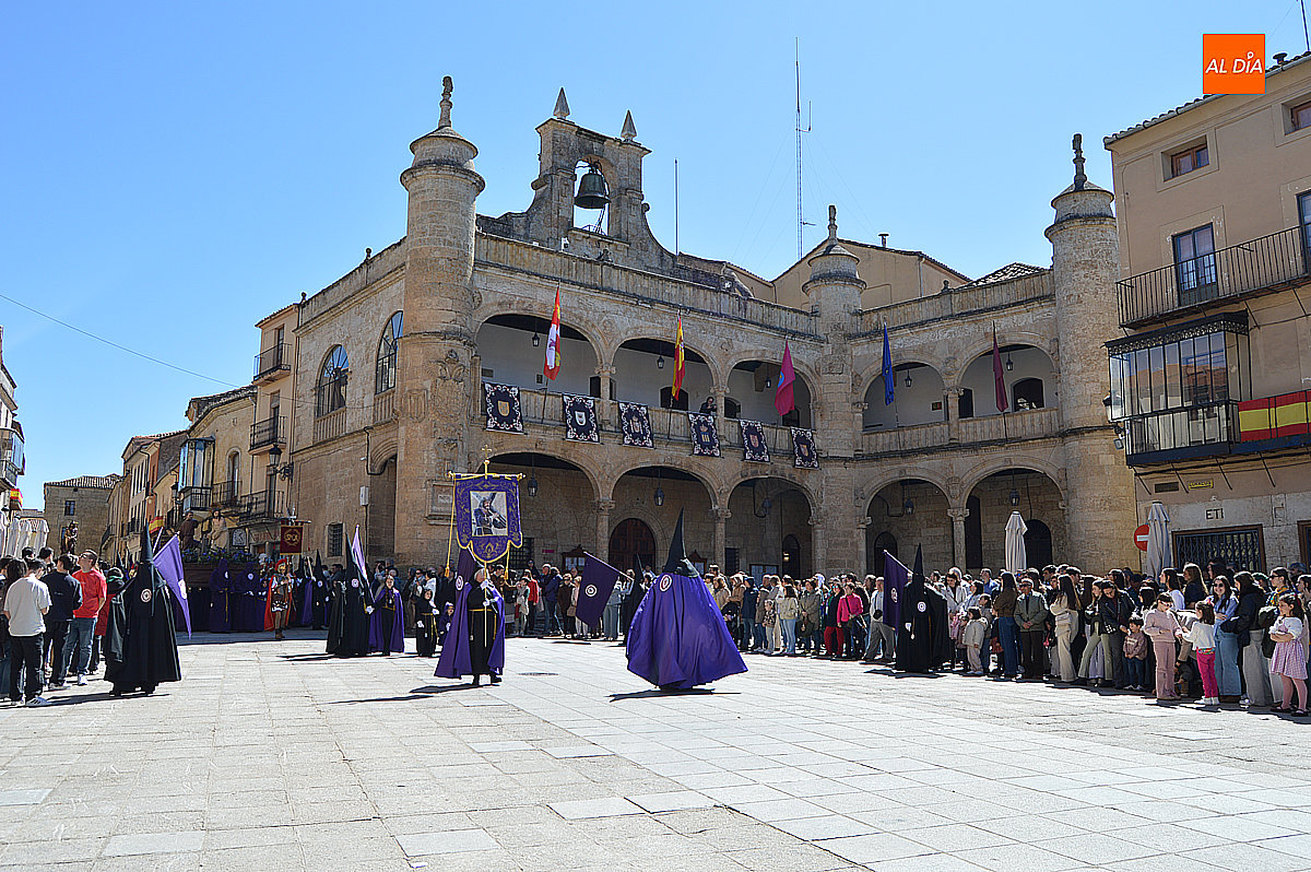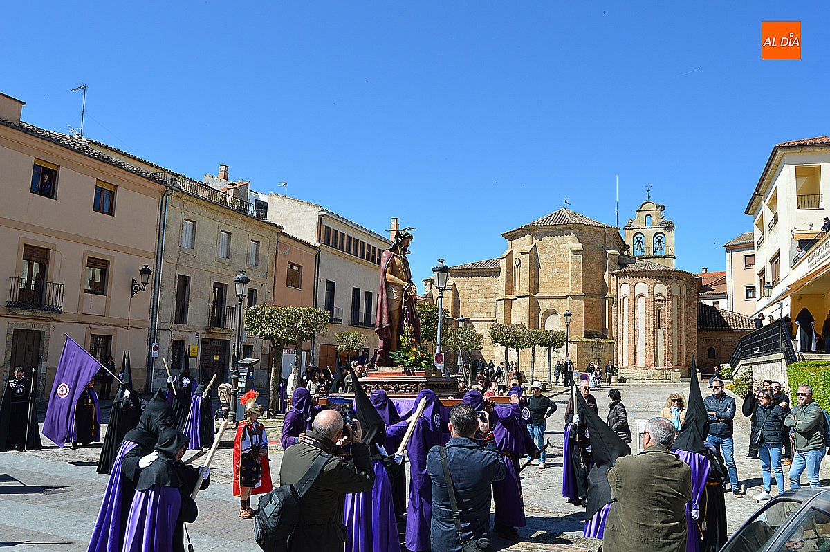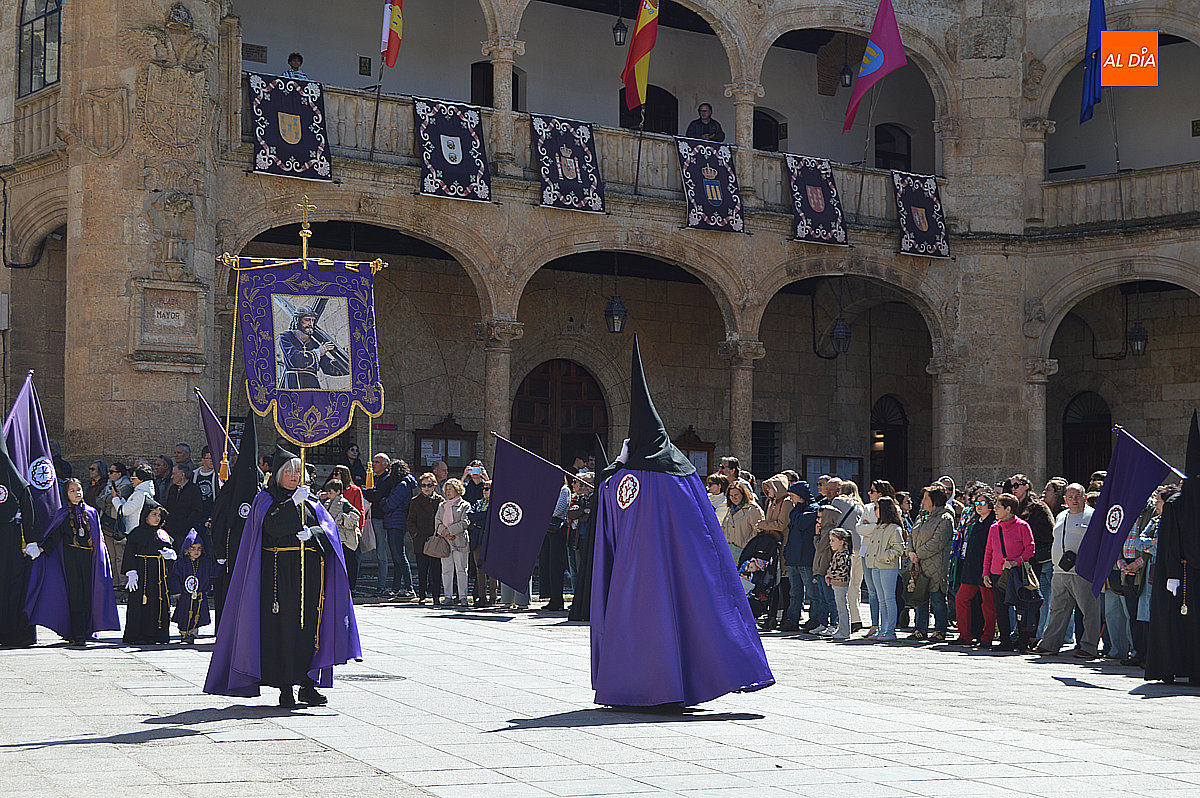La cofradía de Jesús Nazareno ha celebrado la Procesión del Paso de la Agonía en la mañana del Jueves Santo en Ciudad Rodrigo. Los pasos del Ecce Homo y Los Azotes han recorrido el casco histórico hasta la Catedral de Santa María en un ambiente de profundo silencio y solemnidad.