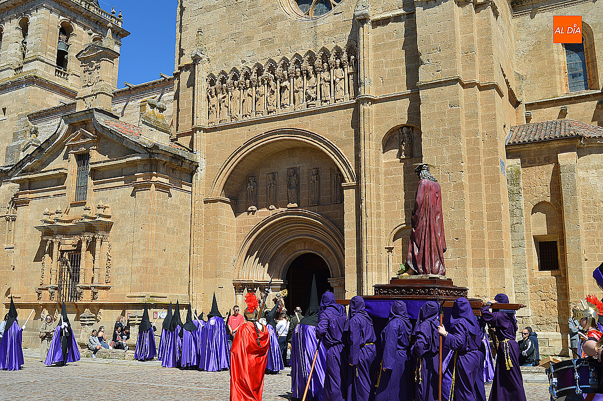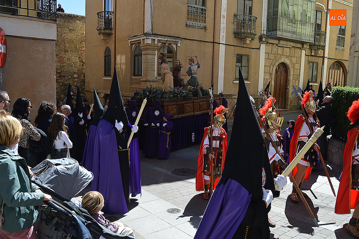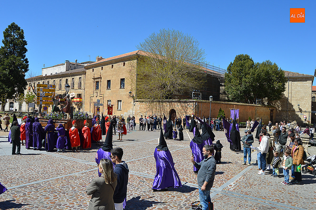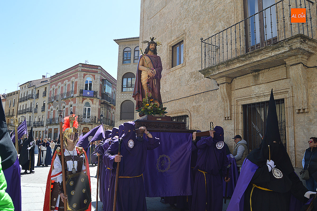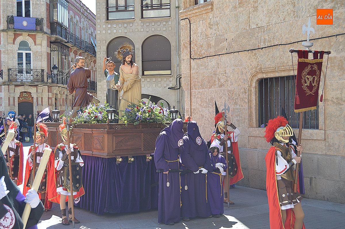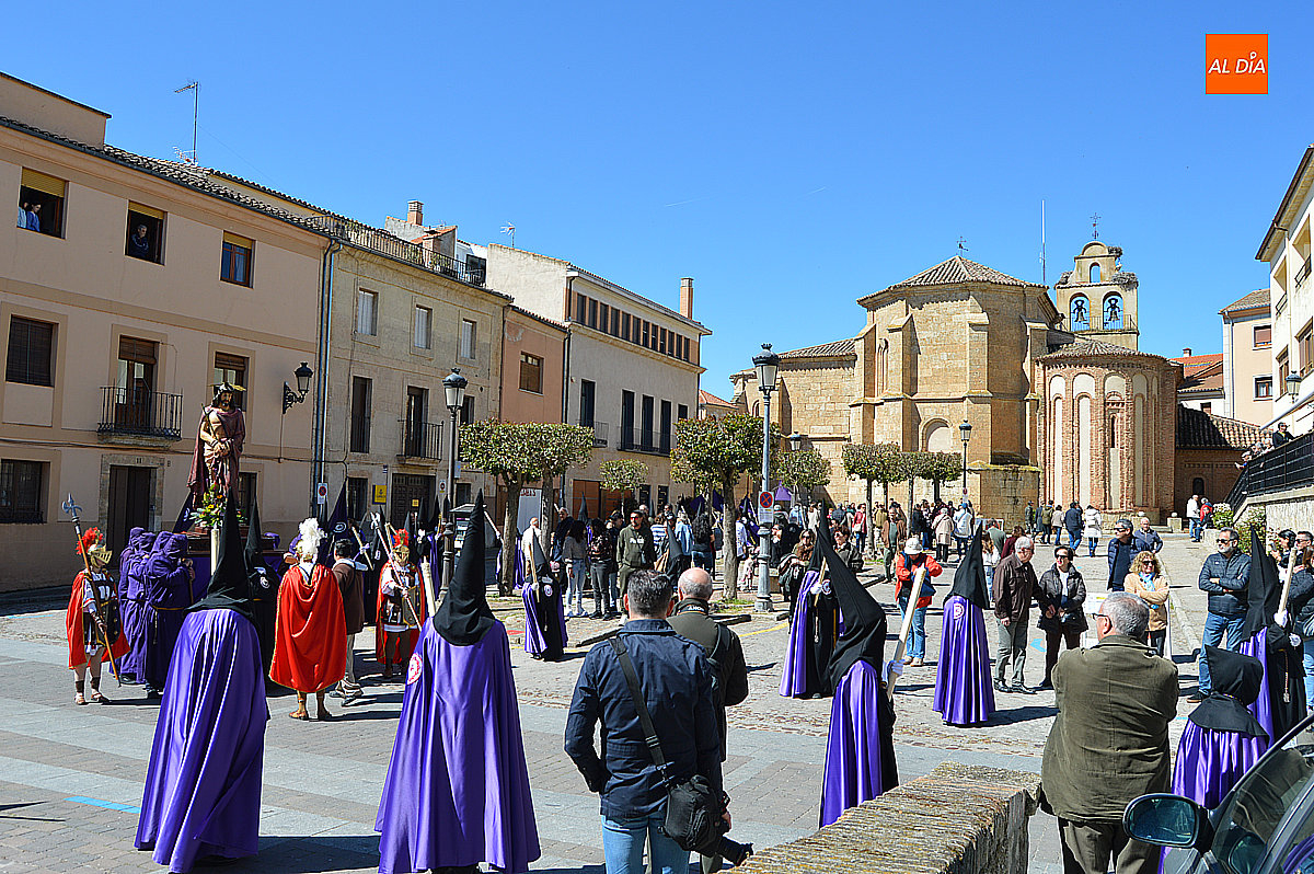 La cofradía de Jesús Nazareno ha celebrado la Procesión del Paso de la Agonía en la mañana del Jueves Santo en Ciudad Rodrigo. Los pasos del Ecce Homo y Los Azotes han recorrido el casco histórico hasta la Catedral de Santa María en un ambiente de profundo silencio y solemnidad.