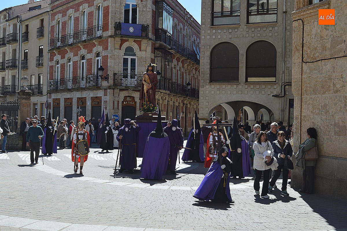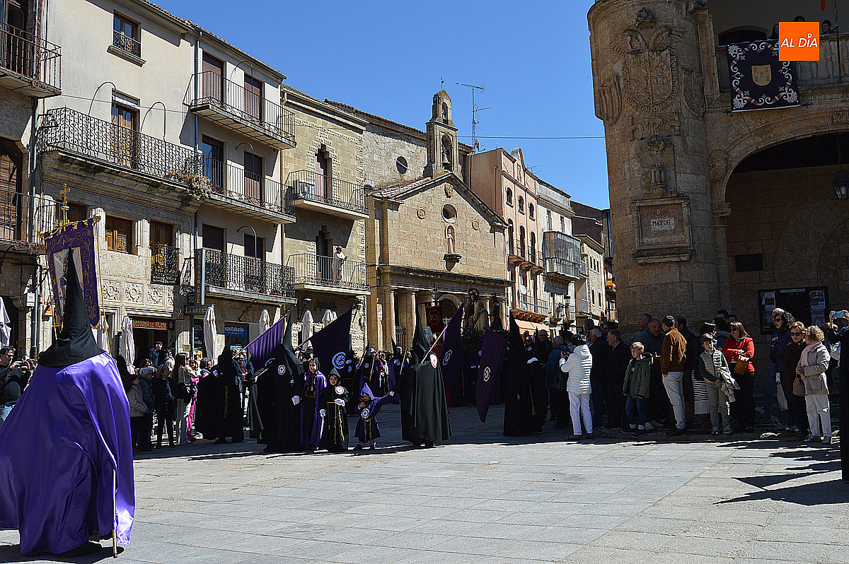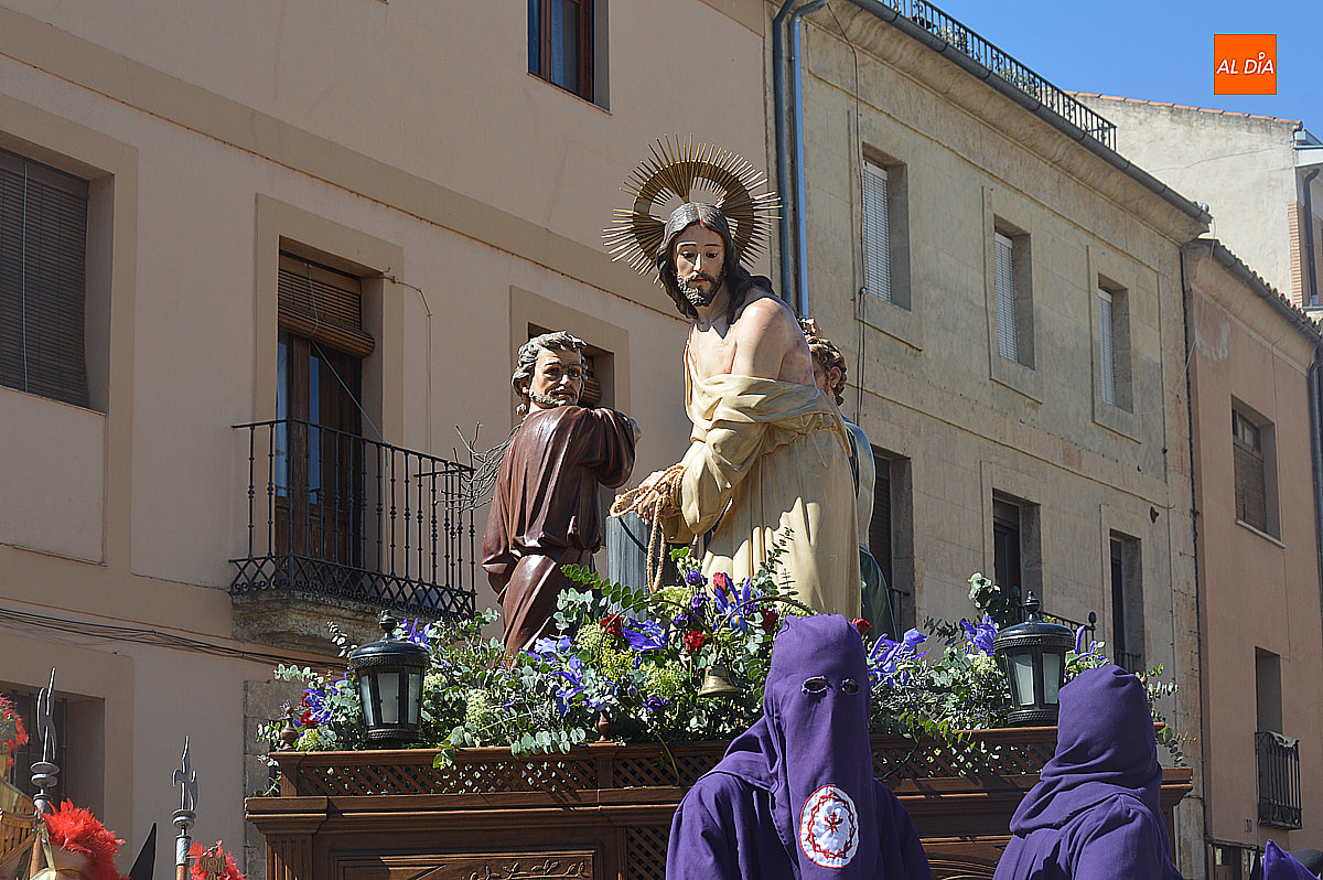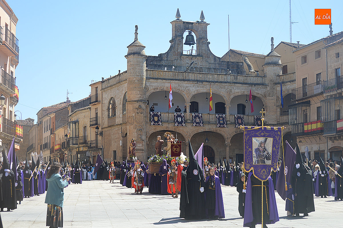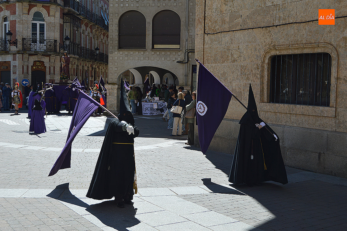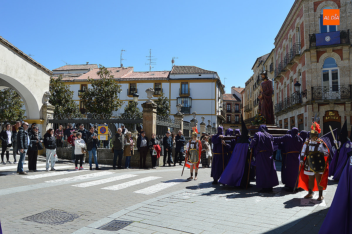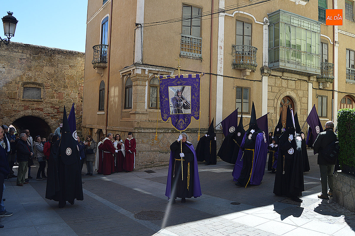 La cofradía de Jesús Nazareno ha celebrado la Procesión del Paso de la Agonía en la mañana del Jueves Santo en Ciudad Rodrigo. Los pasos del Ecce Homo y Los Azotes han recorrido el casco histórico hasta la Catedral de Santa María en un ambiente de profundo silencio y solemnidad.
