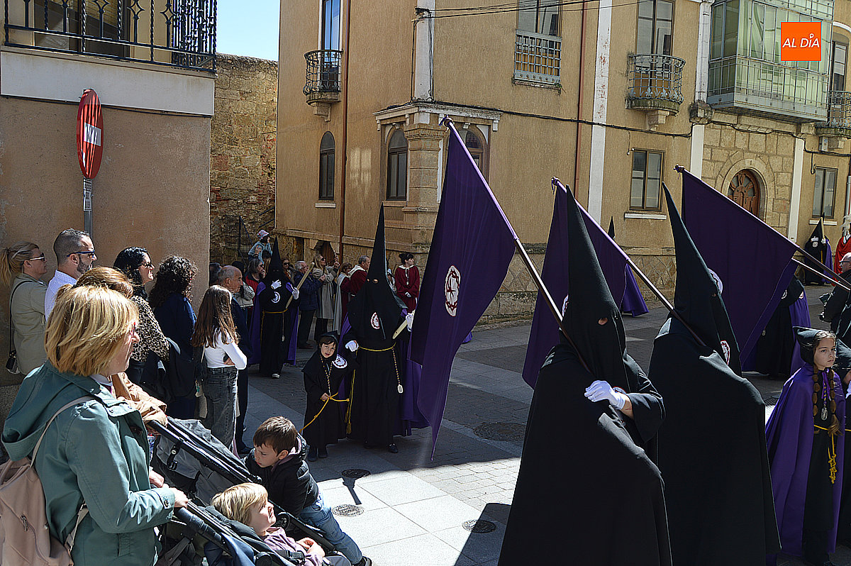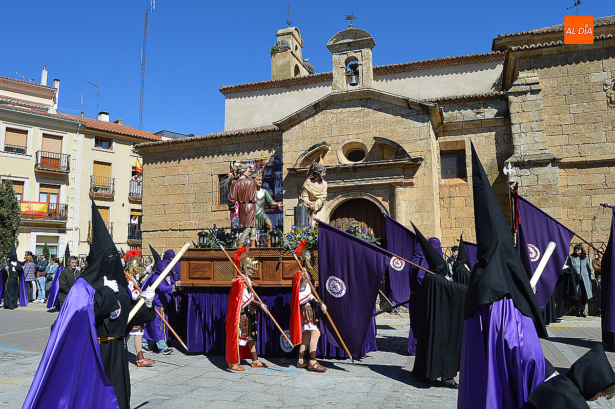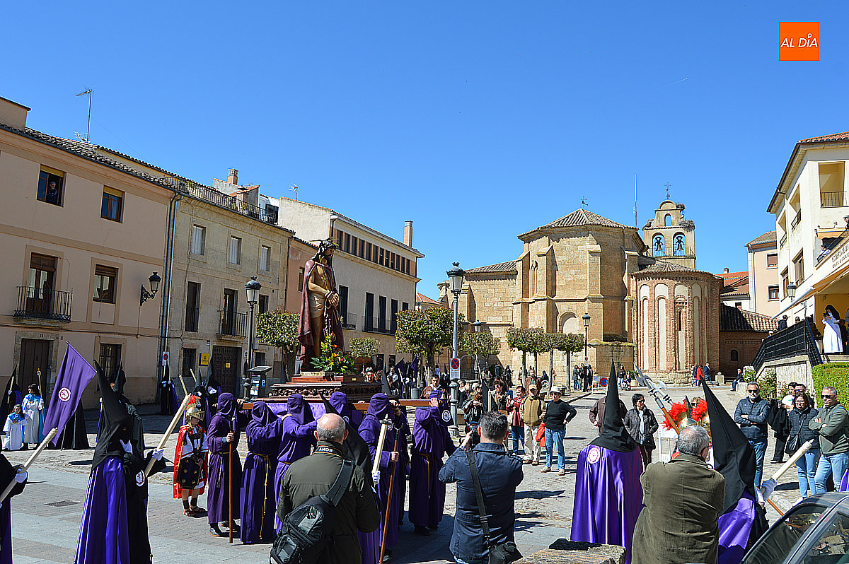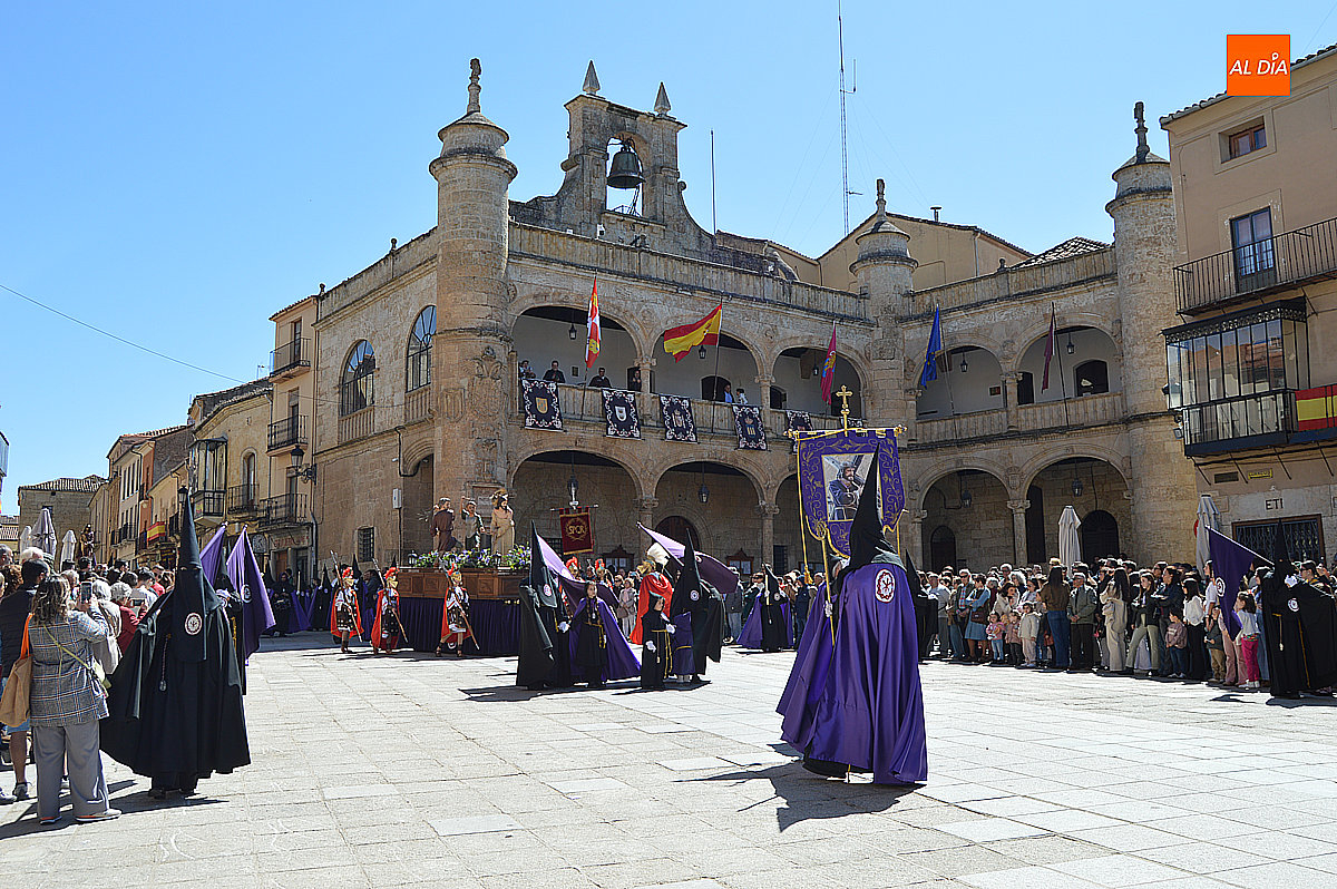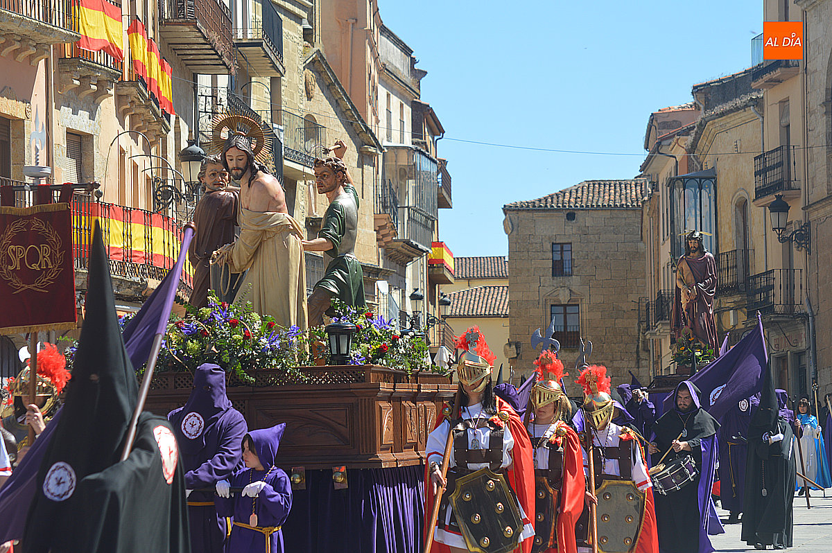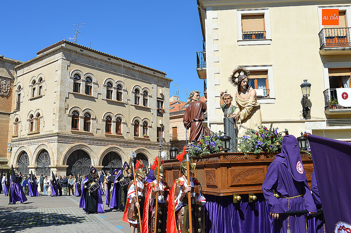 La cofradía de Jesús Nazareno ha celebrado la Procesión del Paso de la Agonía en la mañana del Jueves Santo en Ciudad Rodrigo. Los pasos del Ecce Homo y Los Azotes han recorrido el casco histórico hasta la Catedral de Santa María en un ambiente de profundo silencio y solemnidad.