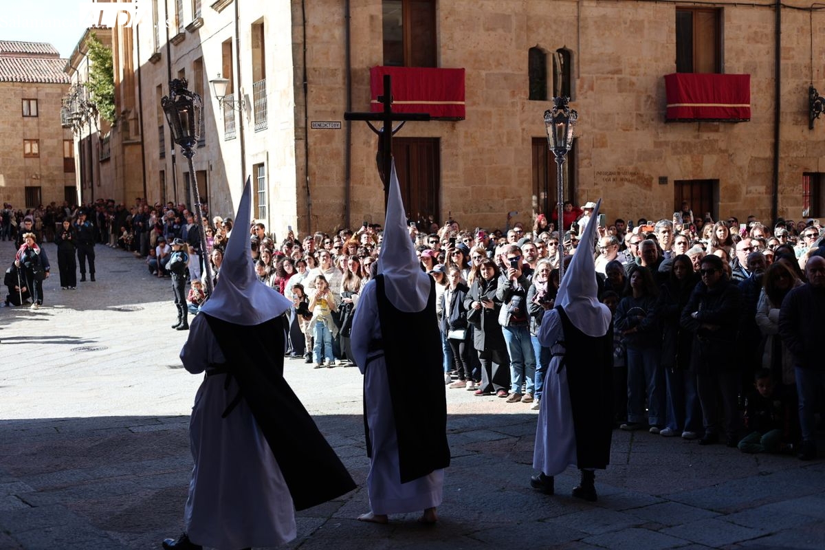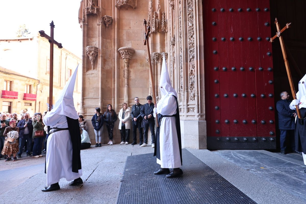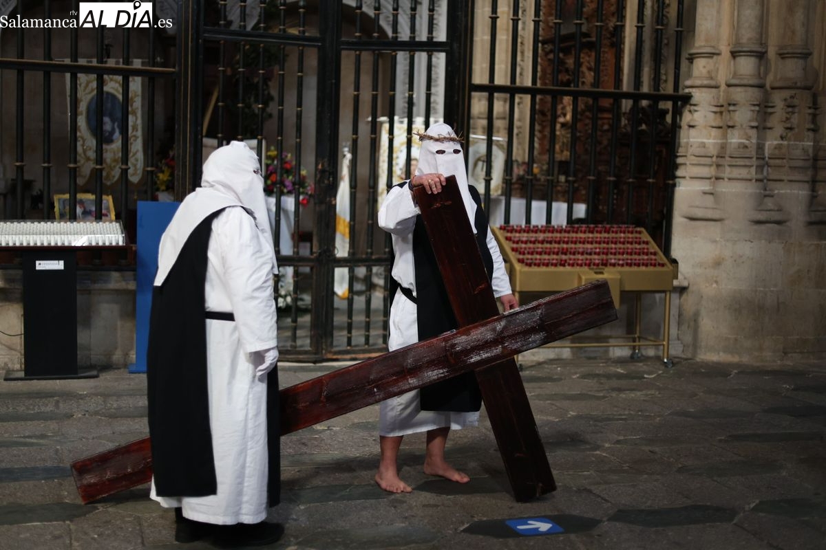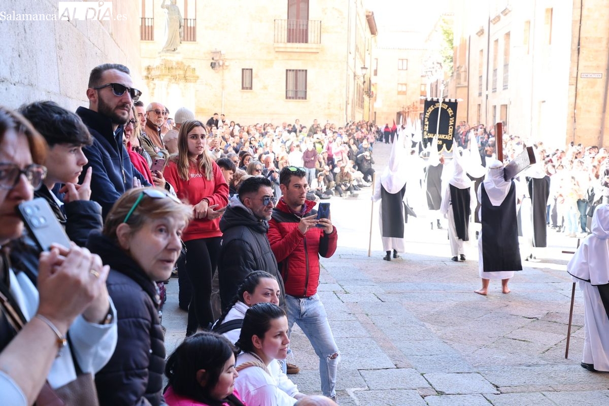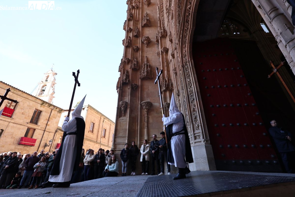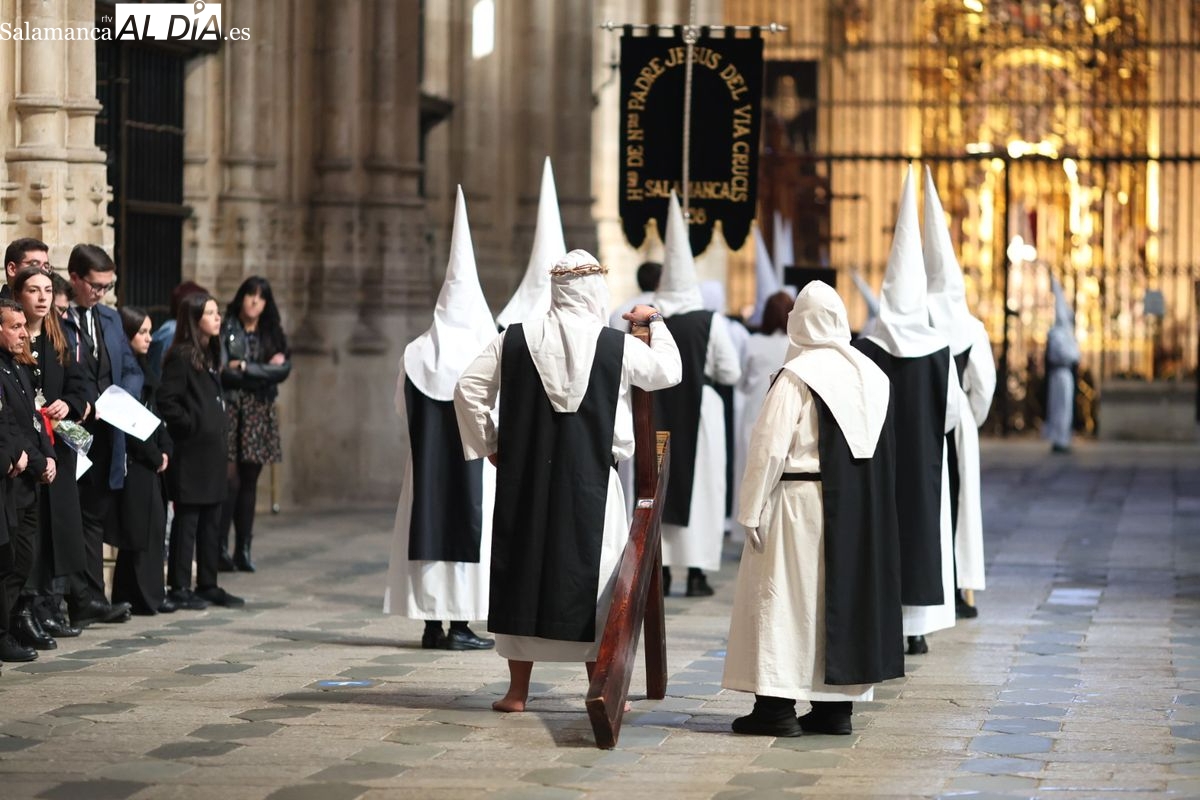 En la tarde de este Jueves Santo, la Hermandad de Nuestro Padre Jesús del Vía Crucis ha vuelto a recorrer las calles de la capitalsalmantina. La comitiva inició su marcha desde la Catedral, marcando el comienzo de un itinerario que tiene como destino final el barrio de San Bernardo, concretamente la parroquia de San Juan de Mata.