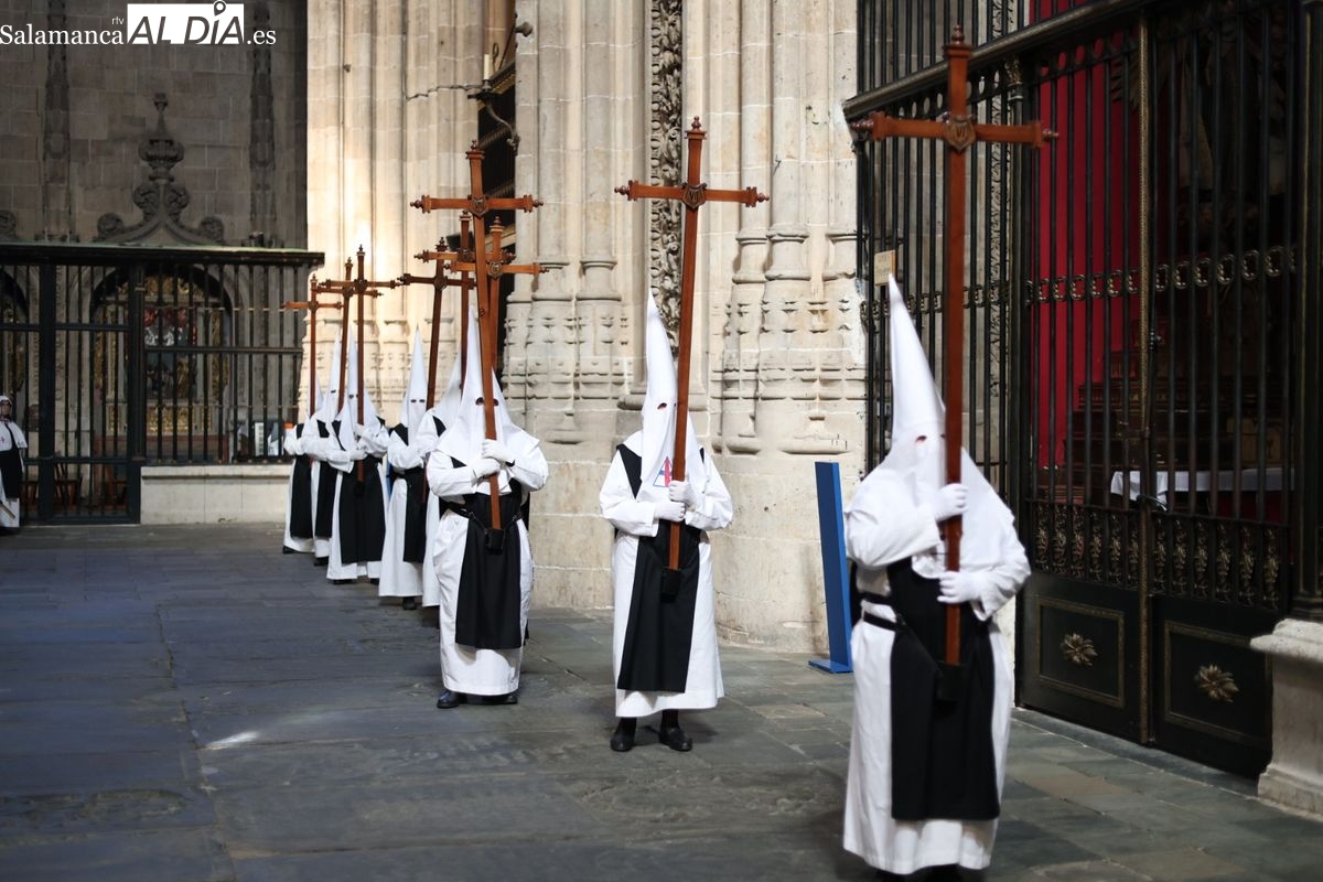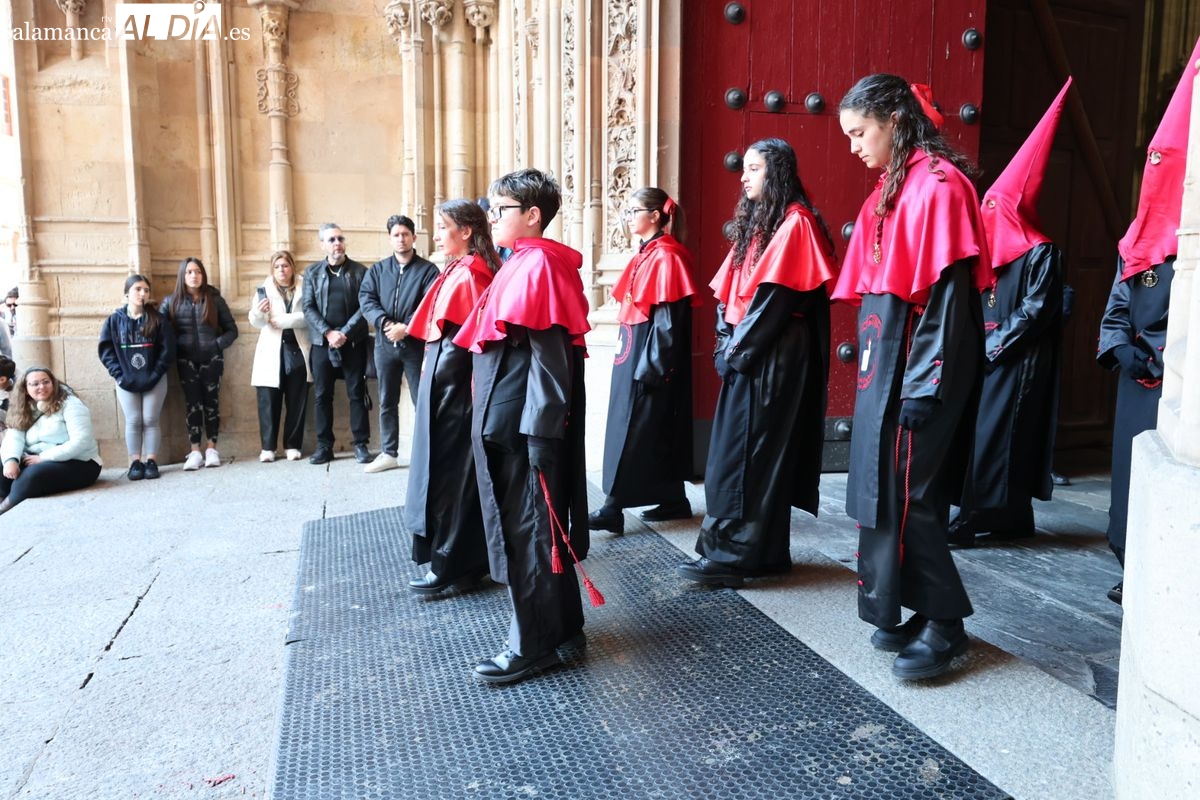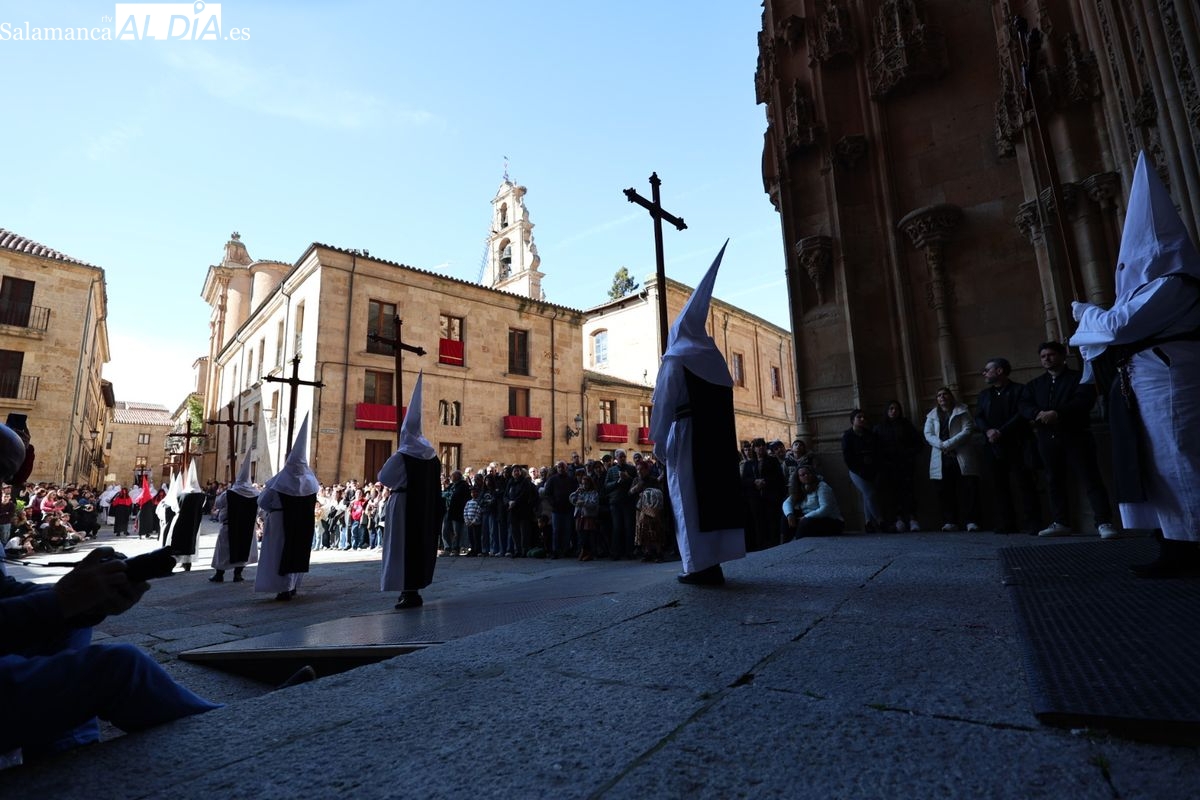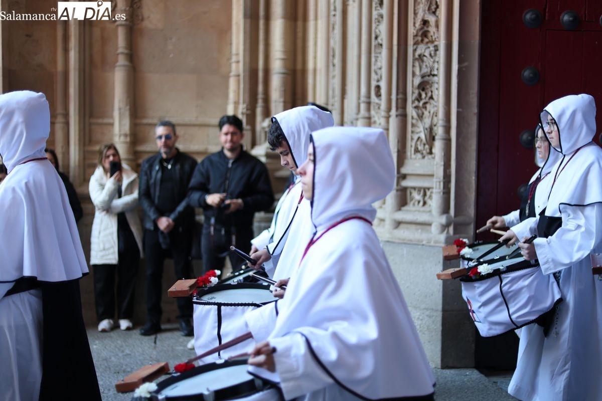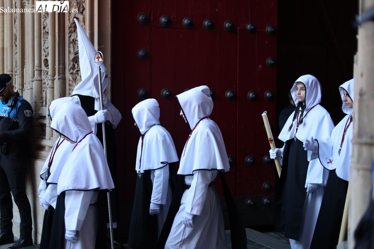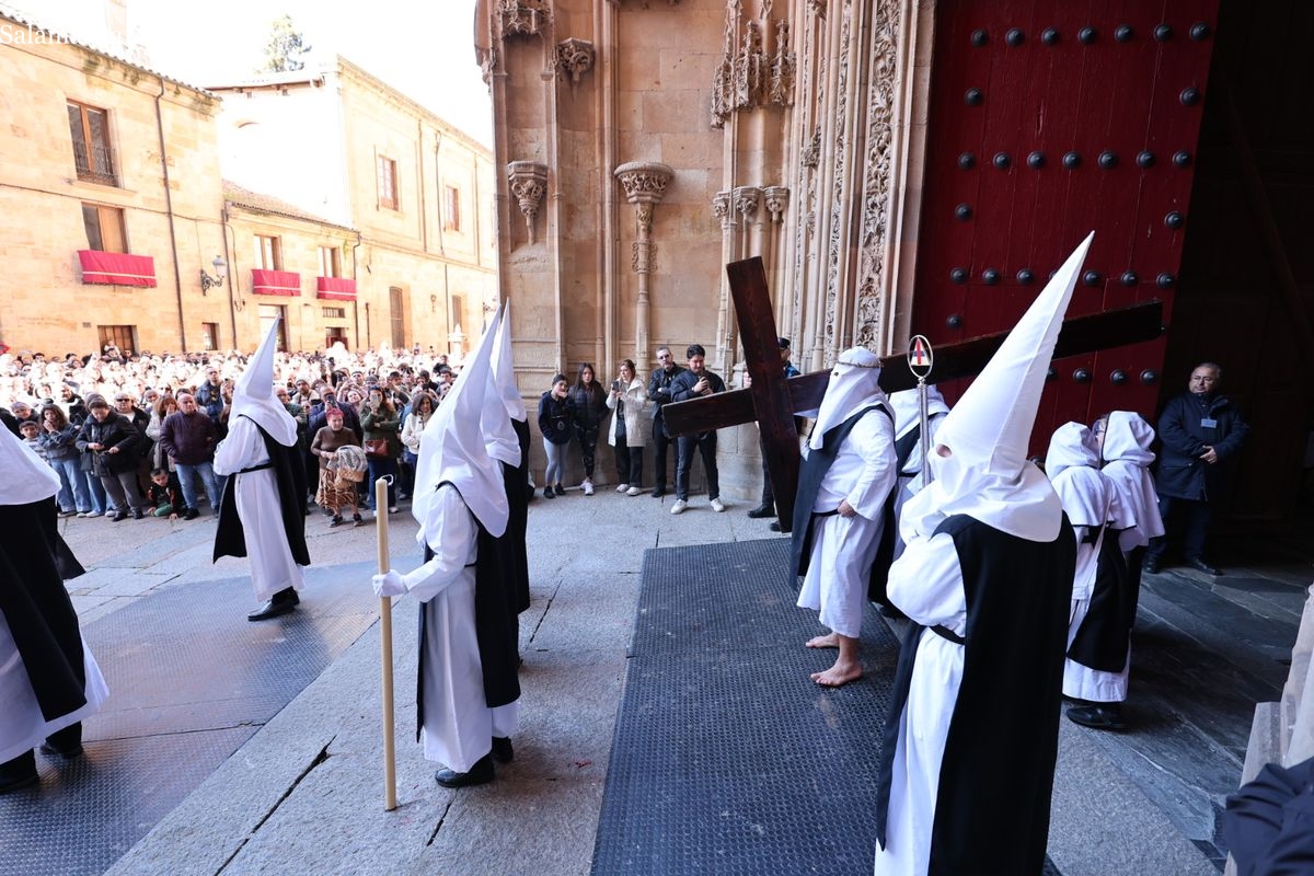 En la tarde de este Jueves Santo, la Hermandad de Nuestro Padre Jesús del Vía Crucis ha vuelto a recorrer las calles de la capitalsalmantina. La comitiva inició su marcha desde la Catedral, marcando el comienzo de un itinerario que tiene como destino final el barrio de San Bernardo, concretamente la parroquia de San Juan de Mata.