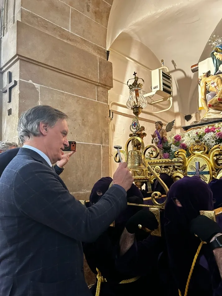 El alcalde de Salamanca, Carlos García Carbayo, ha sido el encargado de realizar en la tarde de este Viernes Santo la primera llamada del paso de la Virgen de las Angustias. El solemne acto se ha desarrollado en el interior del templo de piedra, marcando el inicio del recorrido de esta venerada imagen.