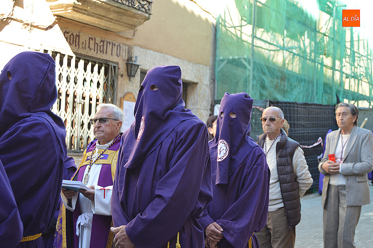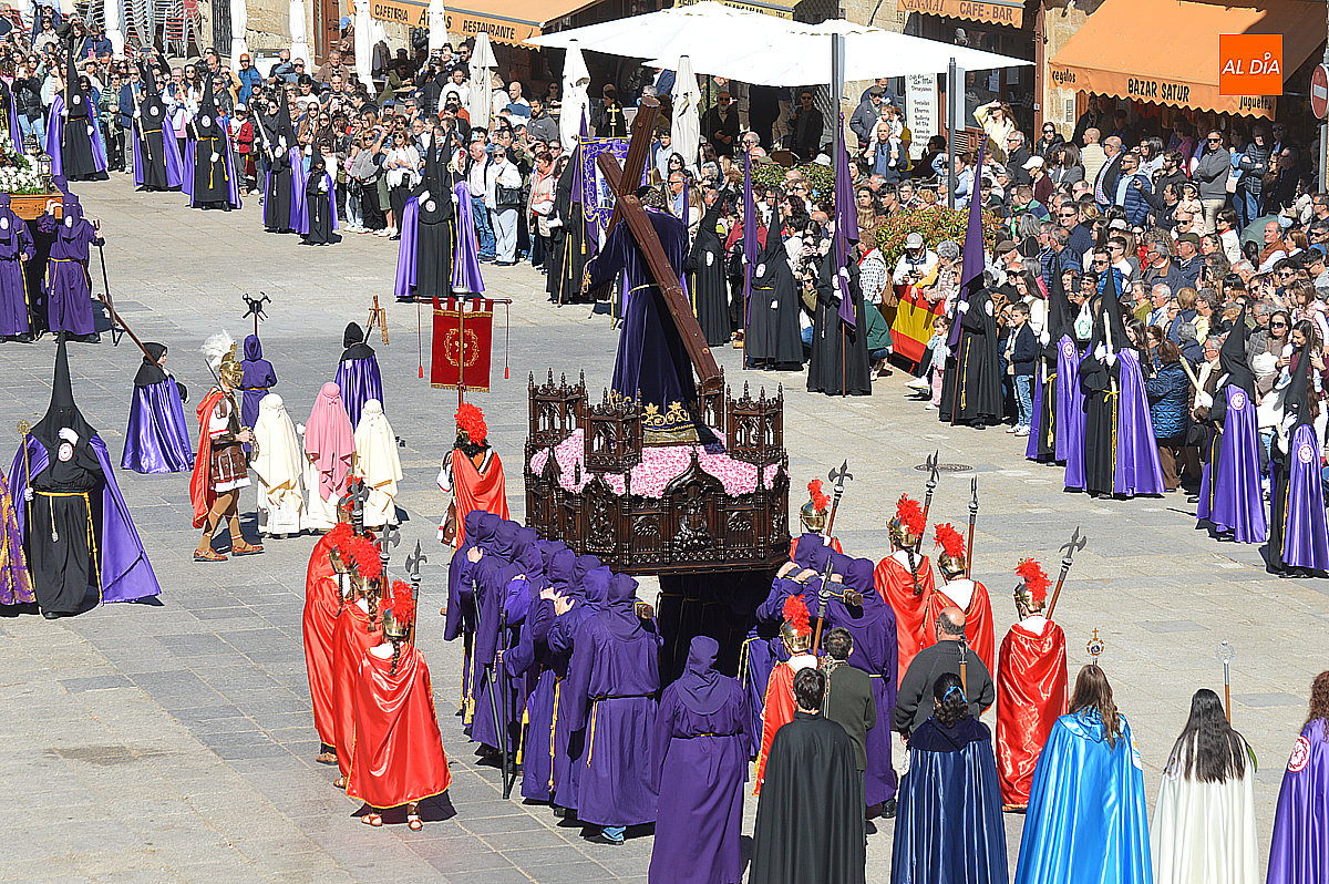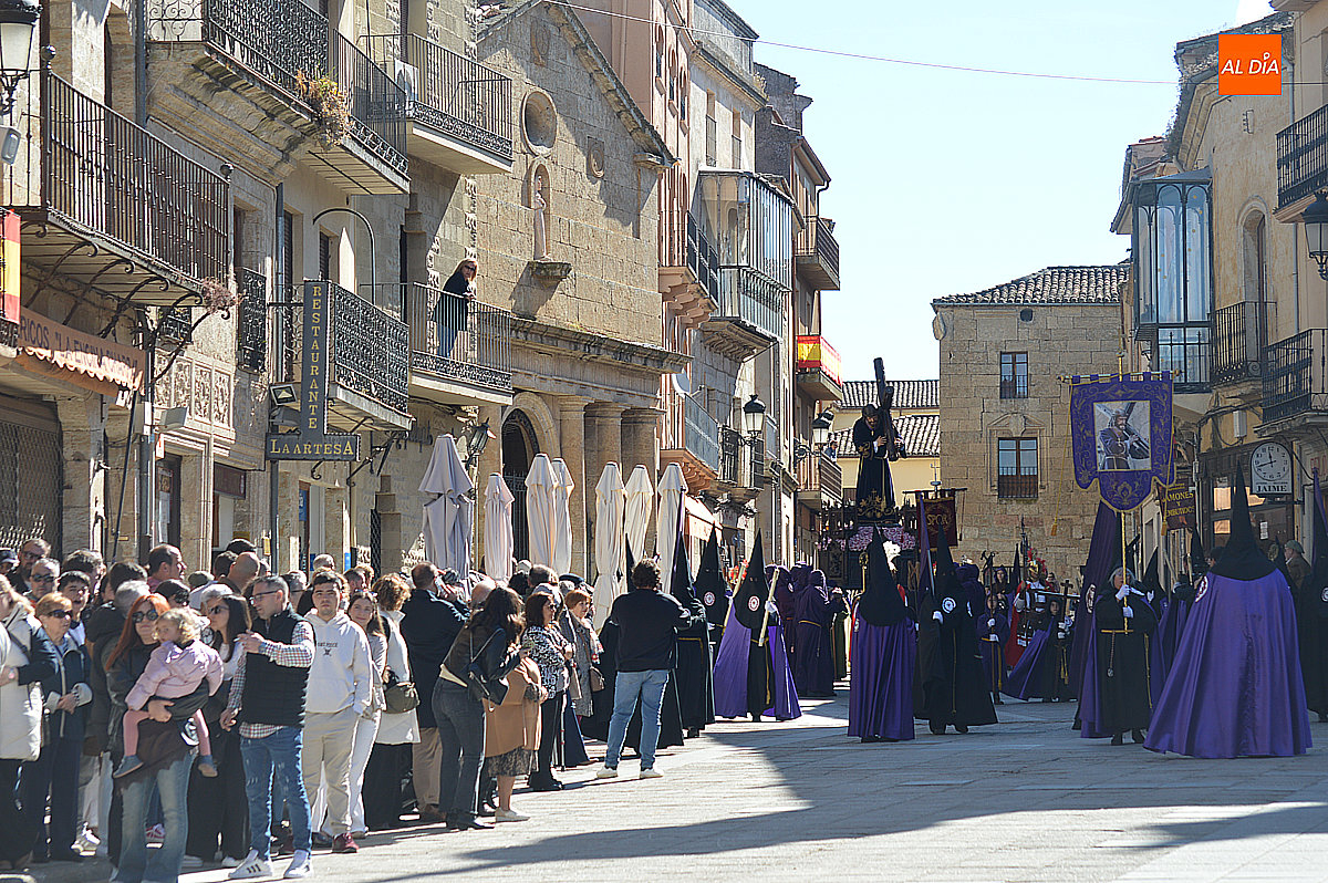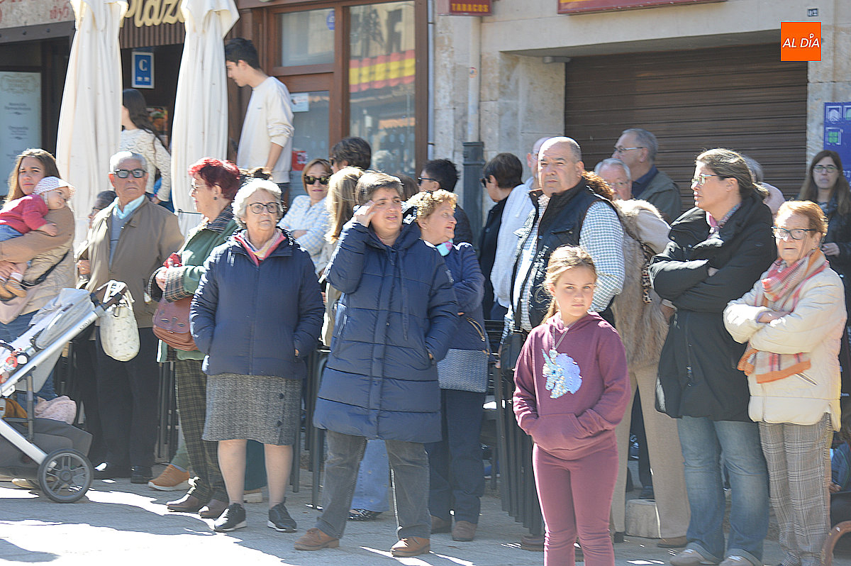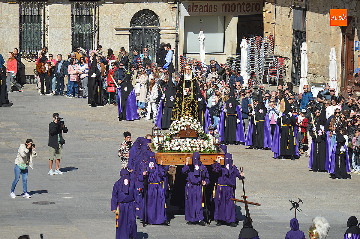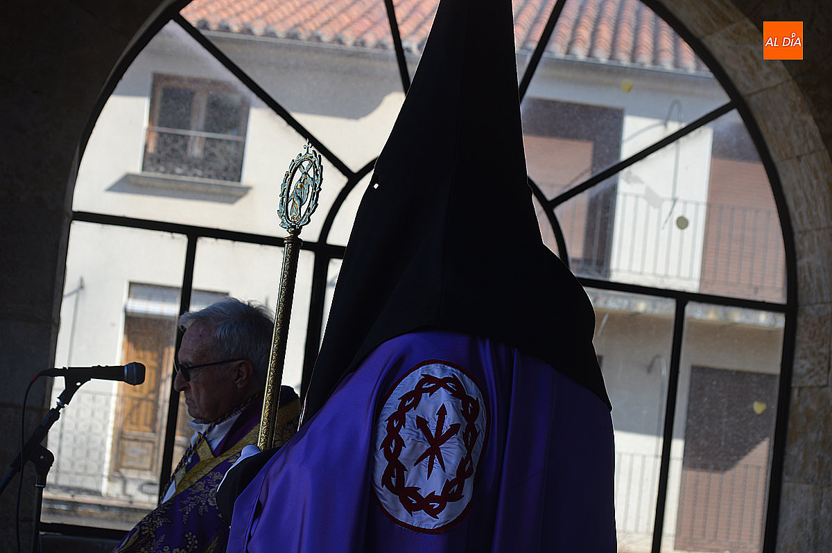 La Procesión del Santo Encuentro ha congregado a cientos de personas en la Plaza Mayor de Ciudad Rodrigo durante la mañana del Viernes Santo. Las imágenes del Cristo cargando la Cruz y La Dolorosa, de la Cofradía de Jesús Nazareno, han protagonizado este emotivo acto central antes de regresar juntas a la Catedral.