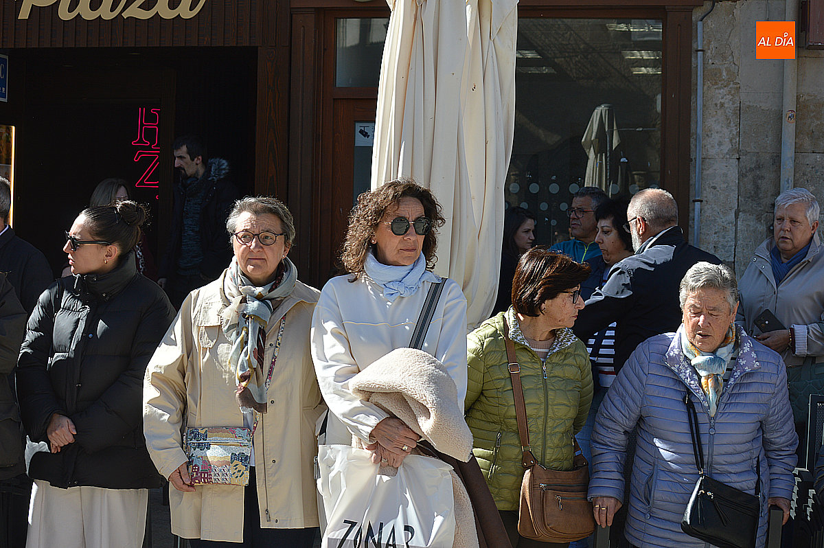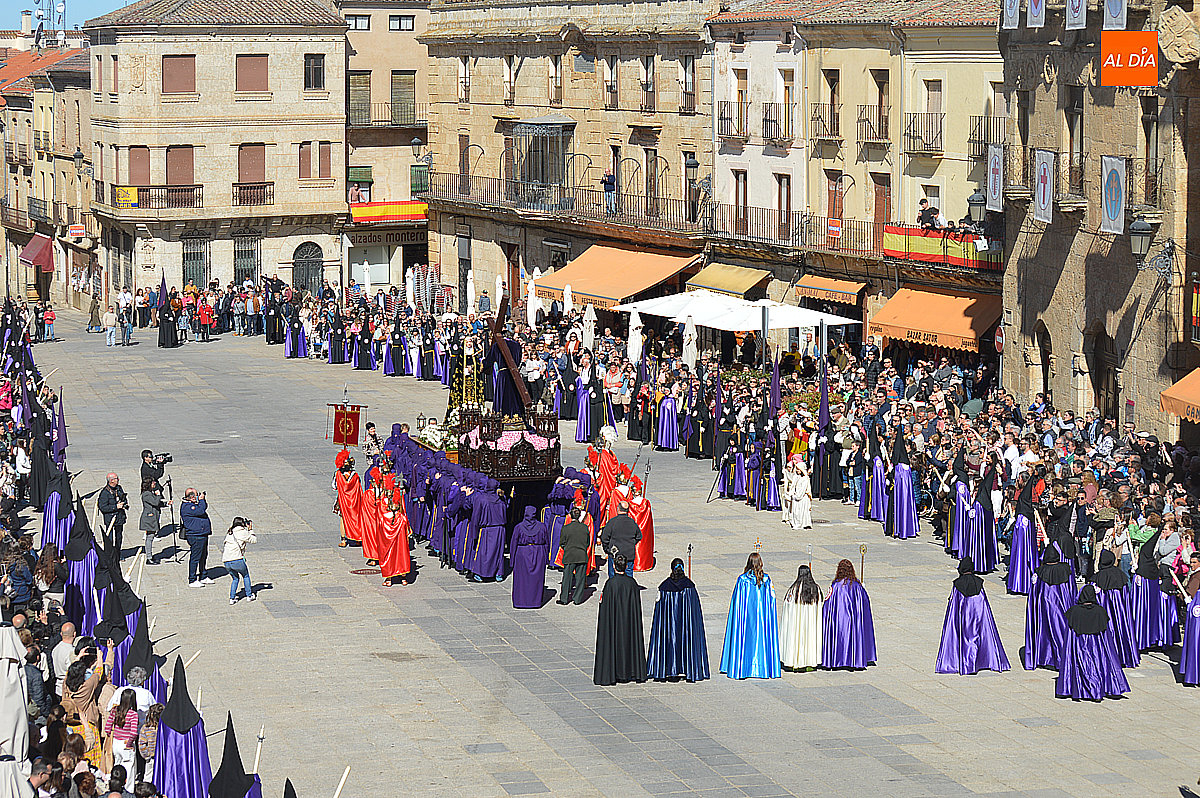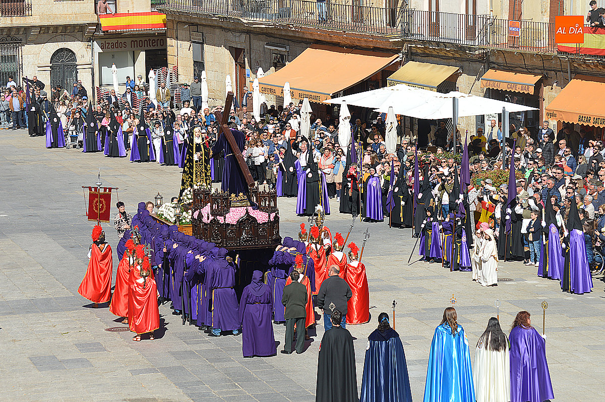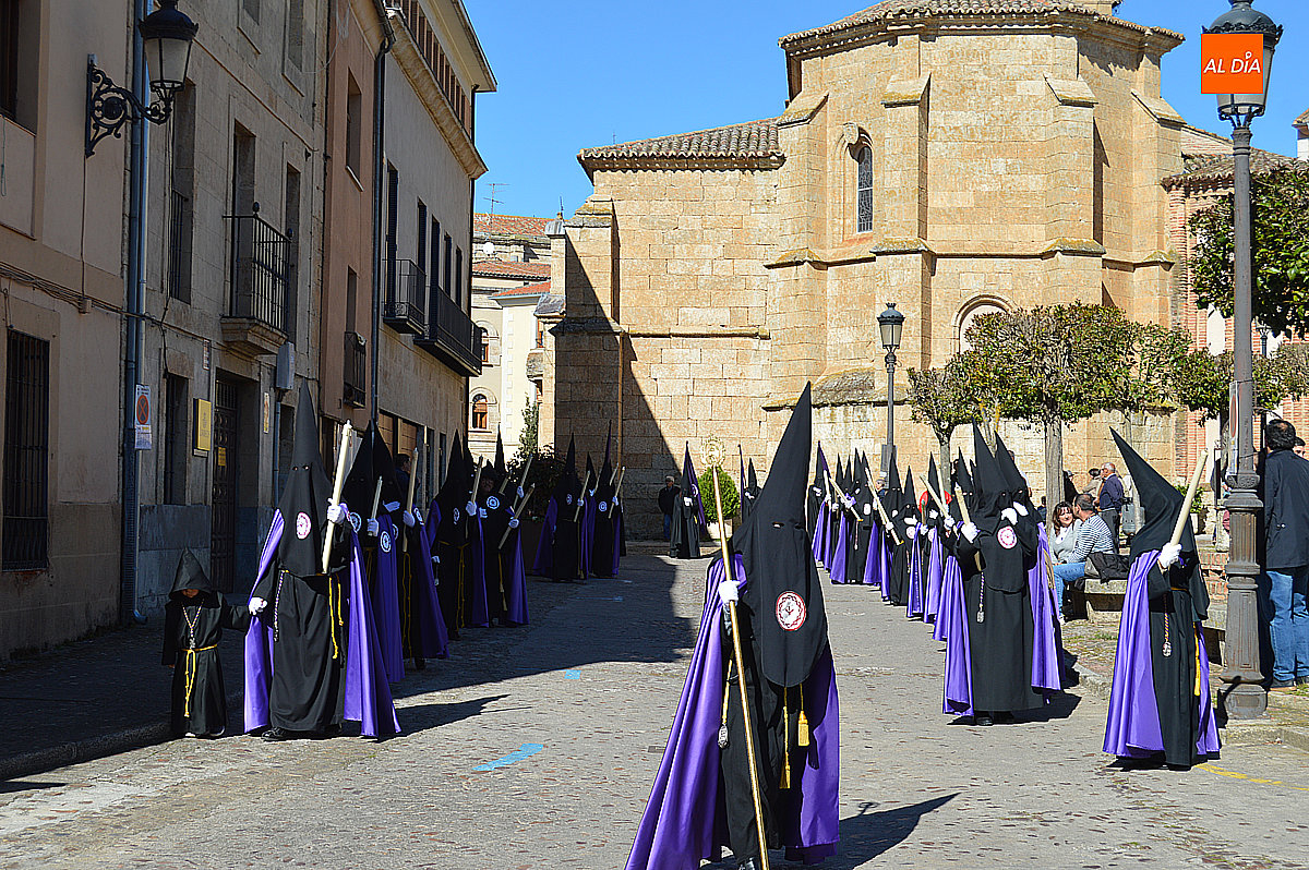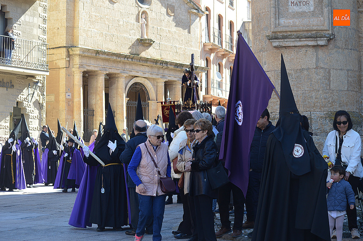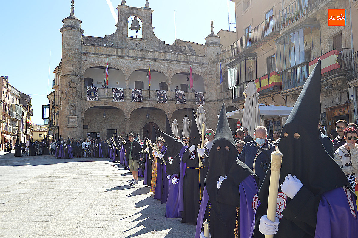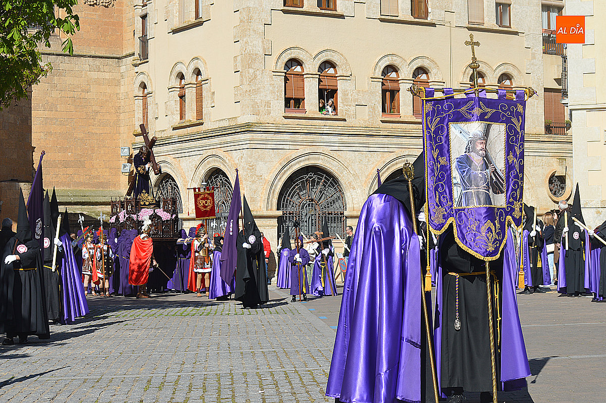 La Procesión del Santo Encuentro ha congregado a cientos de personas en la Plaza Mayor de Ciudad Rodrigo durante la mañana del Viernes Santo. Las imágenes del Cristo cargando la Cruz y La Dolorosa, de la Cofradía de Jesús Nazareno, han protagonizado este emotivo acto central antes de regresar juntas a la Catedral.