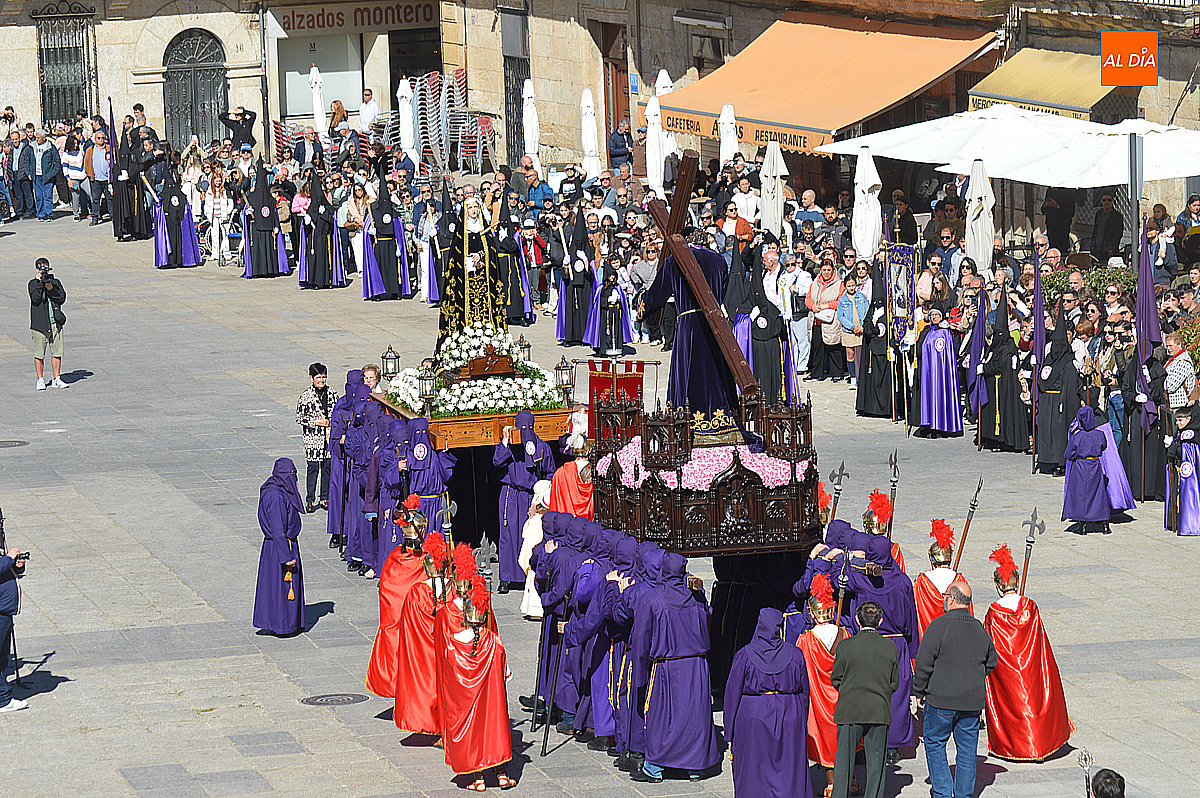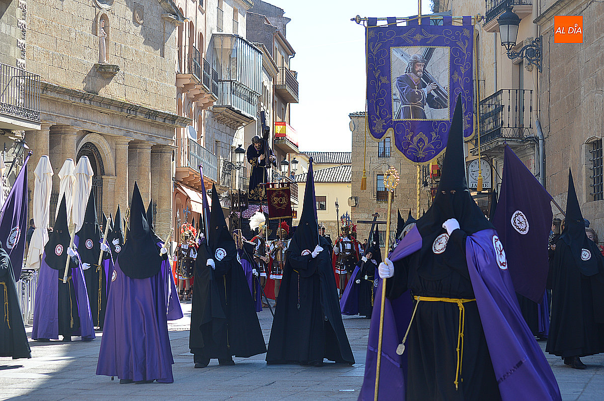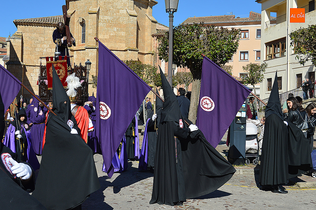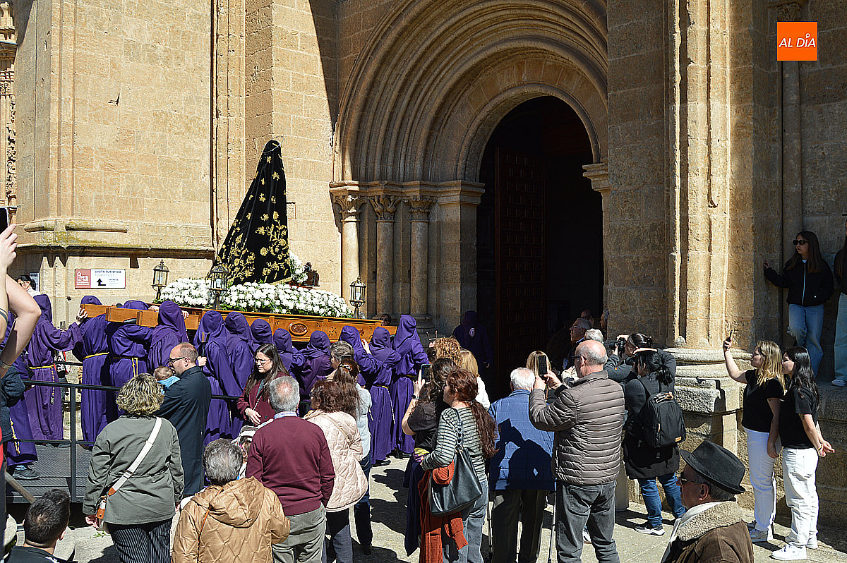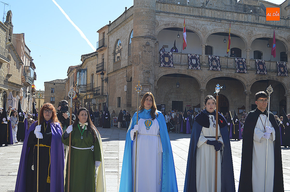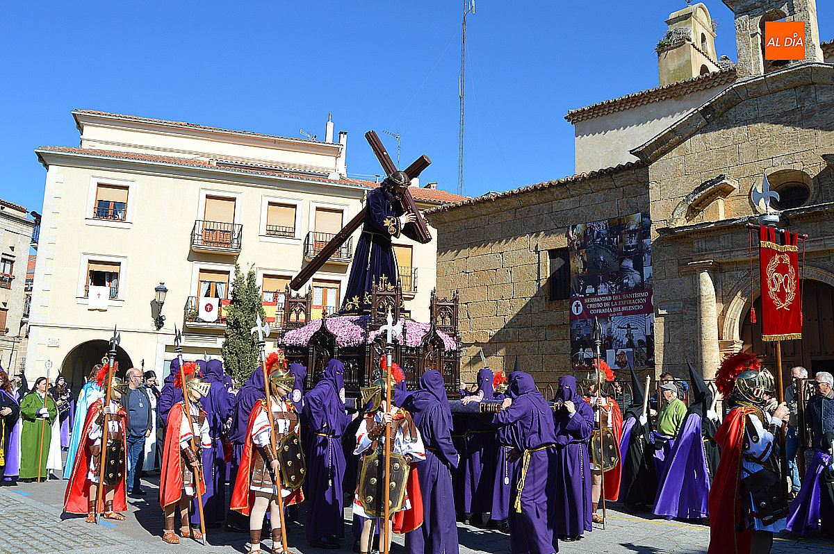 La Procesión del Santo Encuentro ha congregado a cientos de personas en la Plaza Mayor de Ciudad Rodrigo durante la mañana del Viernes Santo. Las imágenes del Cristo cargando la Cruz y La Dolorosa, de la Cofradía de Jesús Nazareno, han protagonizado este emotivo acto central antes de regresar juntas a la Catedral.