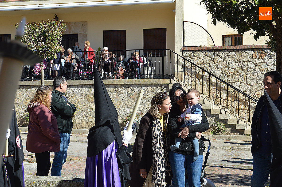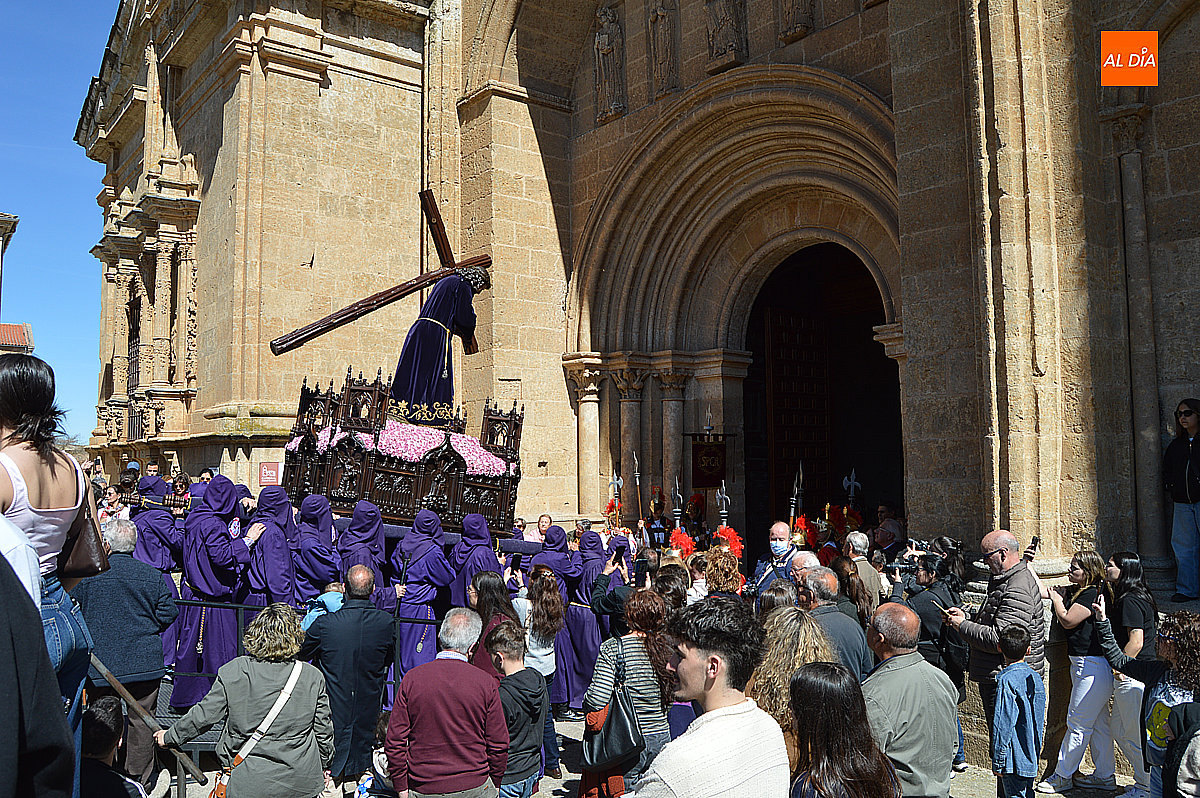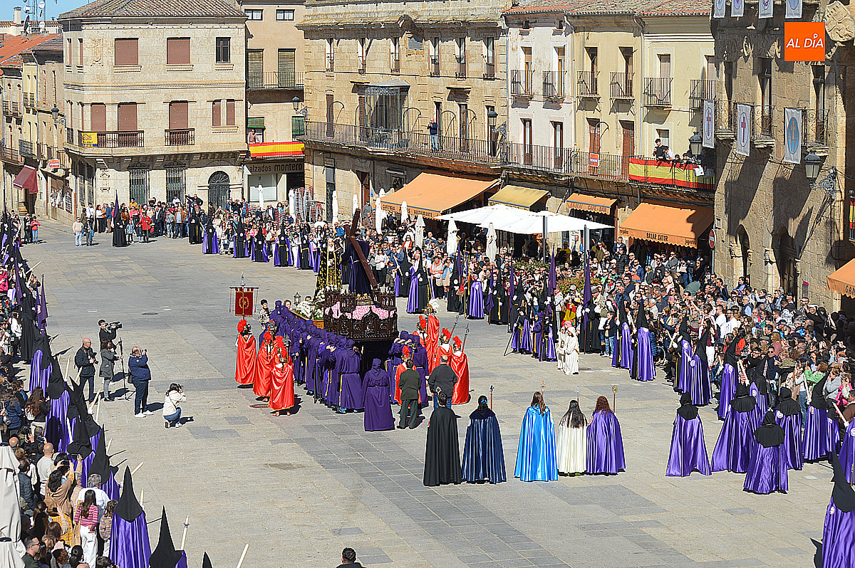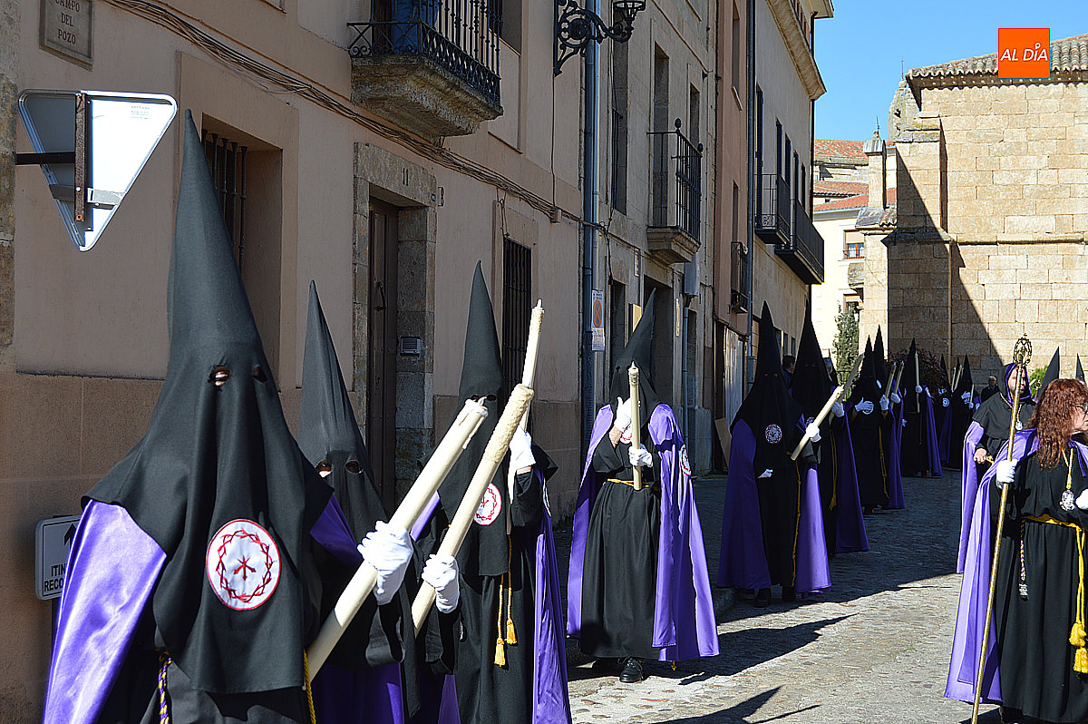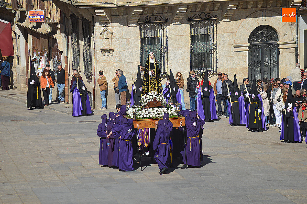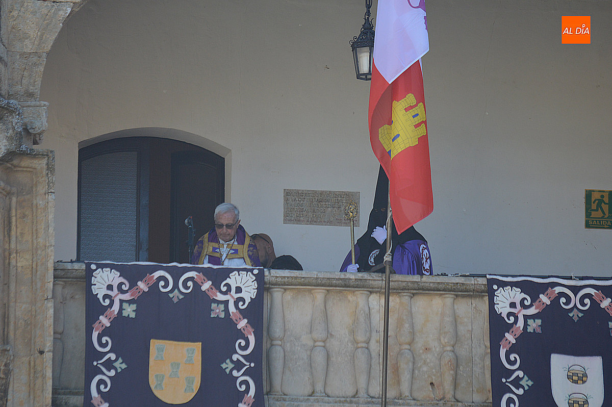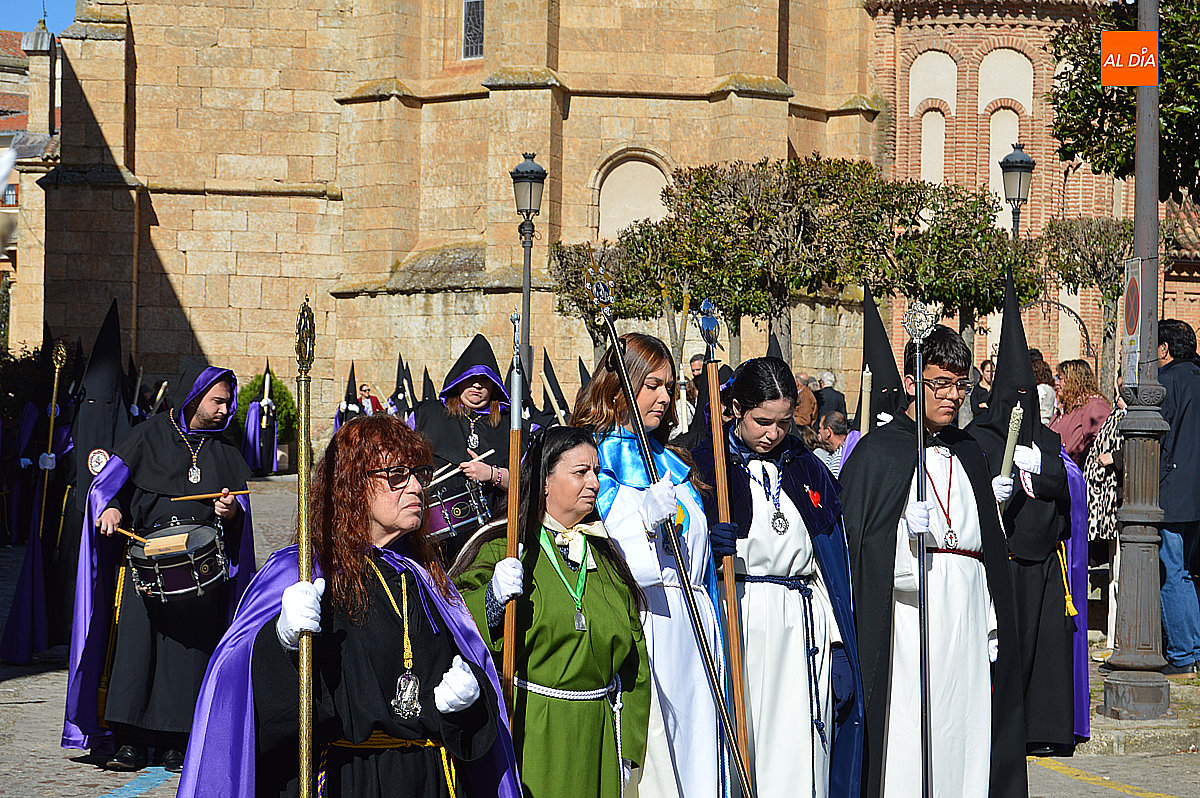La Procesión del Santo Encuentro ha congregado a cientos de personas en la Plaza Mayor de Ciudad Rodrigo durante la mañana del Viernes Santo. Las imágenes del Cristo cargando la Cruz y La Dolorosa, de la Cofradía de Jesús Nazareno, han protagonizado este emotivo acto central antes de regresar juntas a la Catedral.