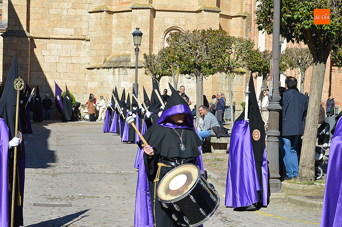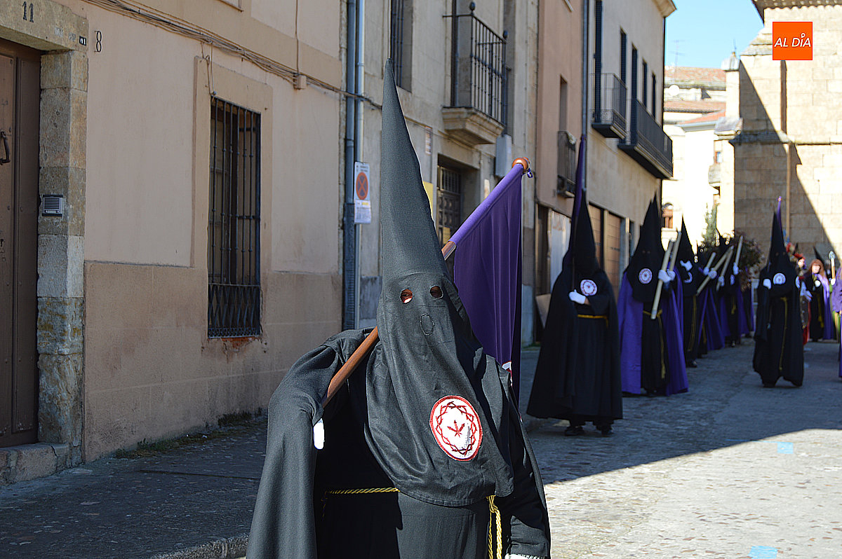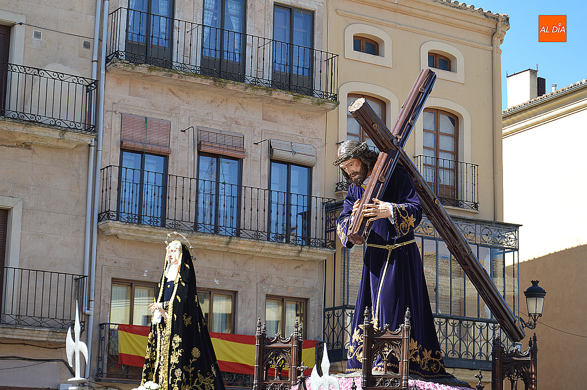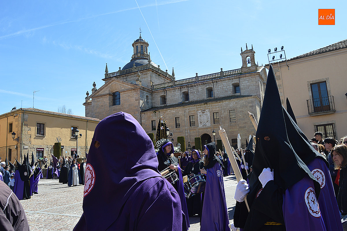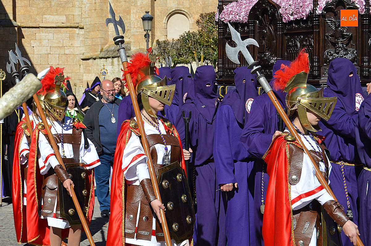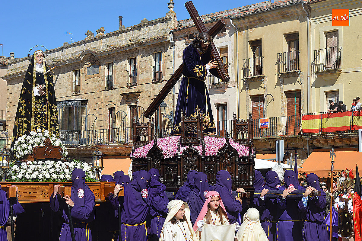 La Procesión del Santo Encuentro ha congregado a cientos de personas en la Plaza Mayor de Ciudad Rodrigo durante la mañana del Viernes Santo. Las imágenes del Cristo cargando la Cruz y La Dolorosa, de la Cofradía de Jesús Nazareno, han protagonizado este emotivo acto central antes de regresar juntas a la Catedral.