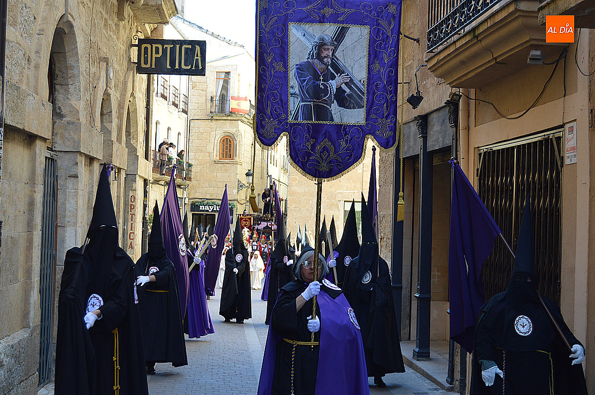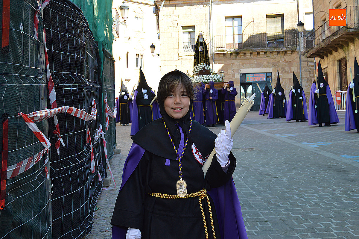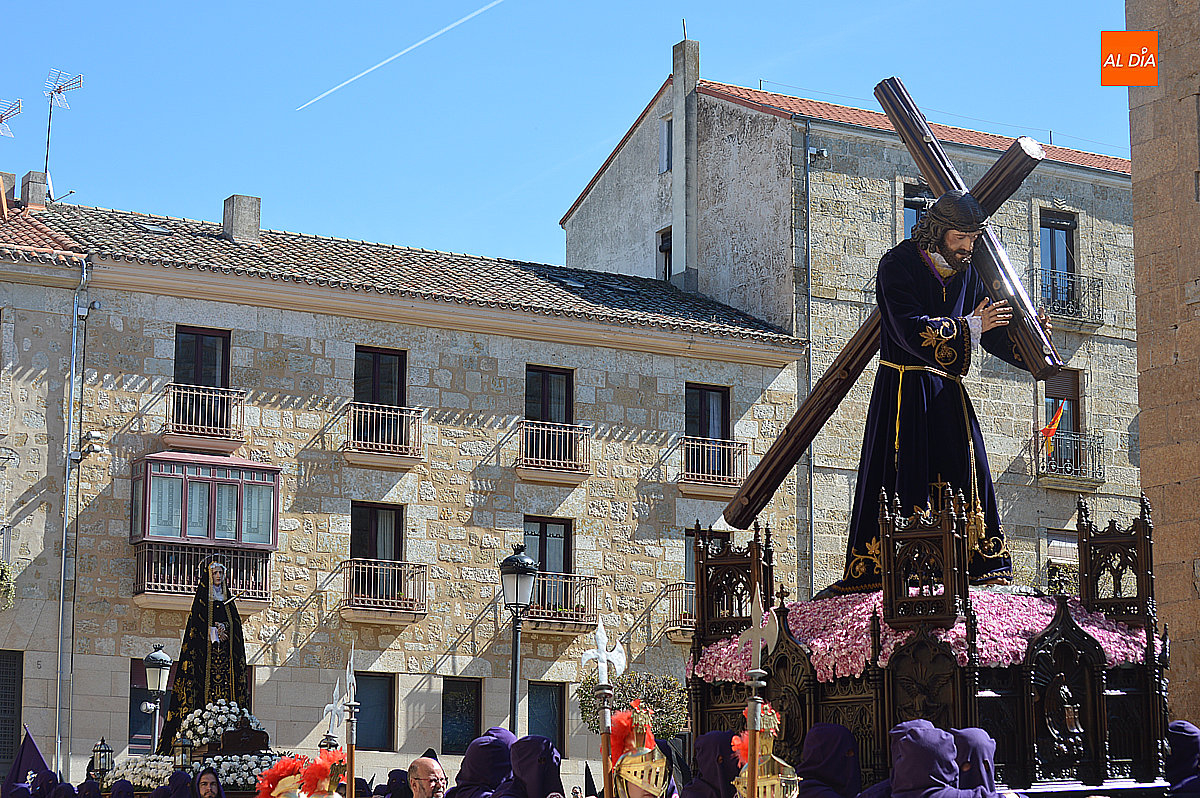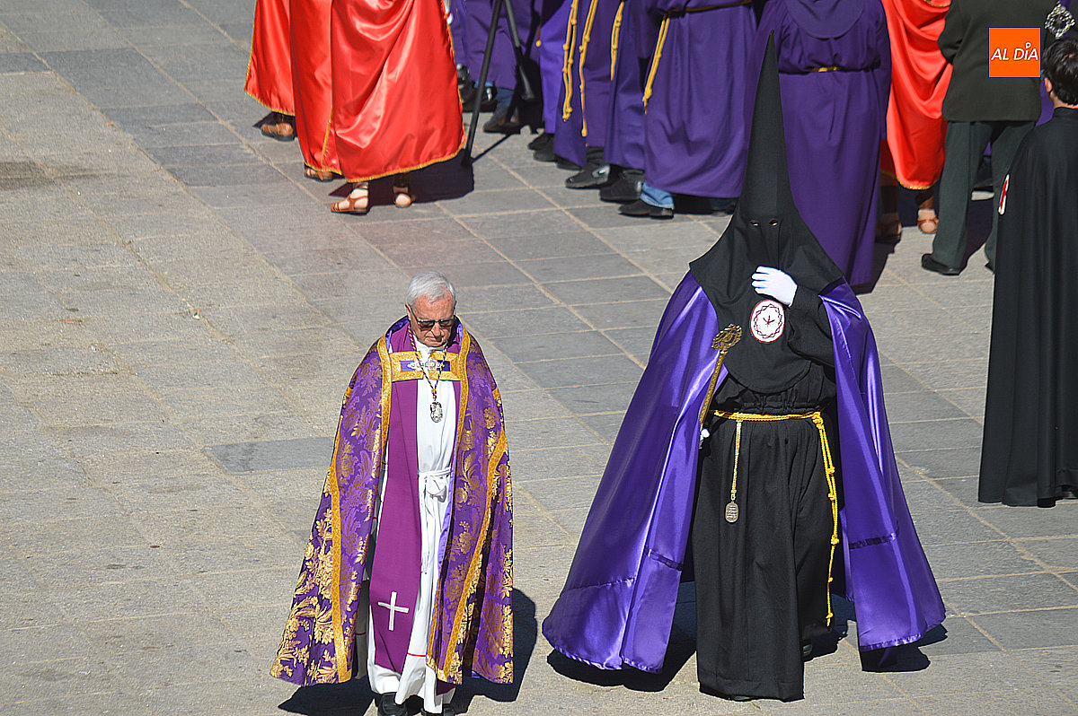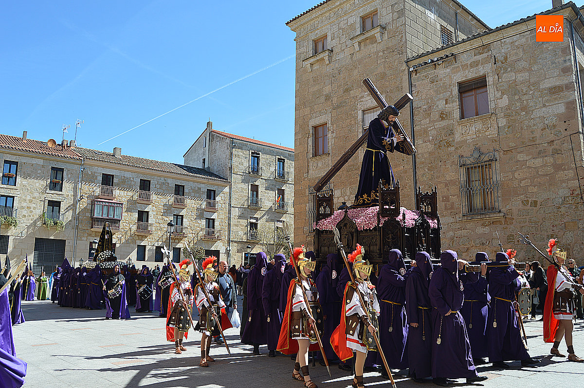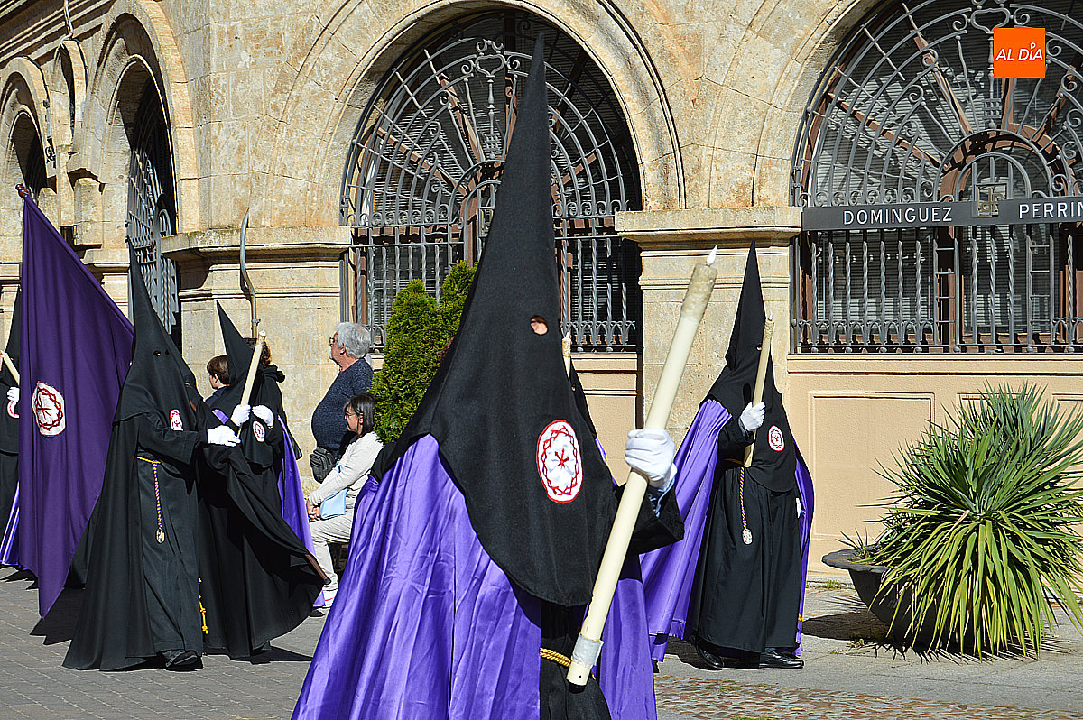 La Procesión del Santo Encuentro ha congregado a cientos de personas en la Plaza Mayor de Ciudad Rodrigo durante la mañana del Viernes Santo. Las imágenes del Cristo cargando la Cruz y La Dolorosa, de la Cofradía de Jesús Nazareno, han protagonizado este emotivo acto central antes de regresar juntas a la Catedral.