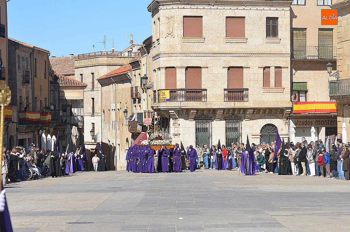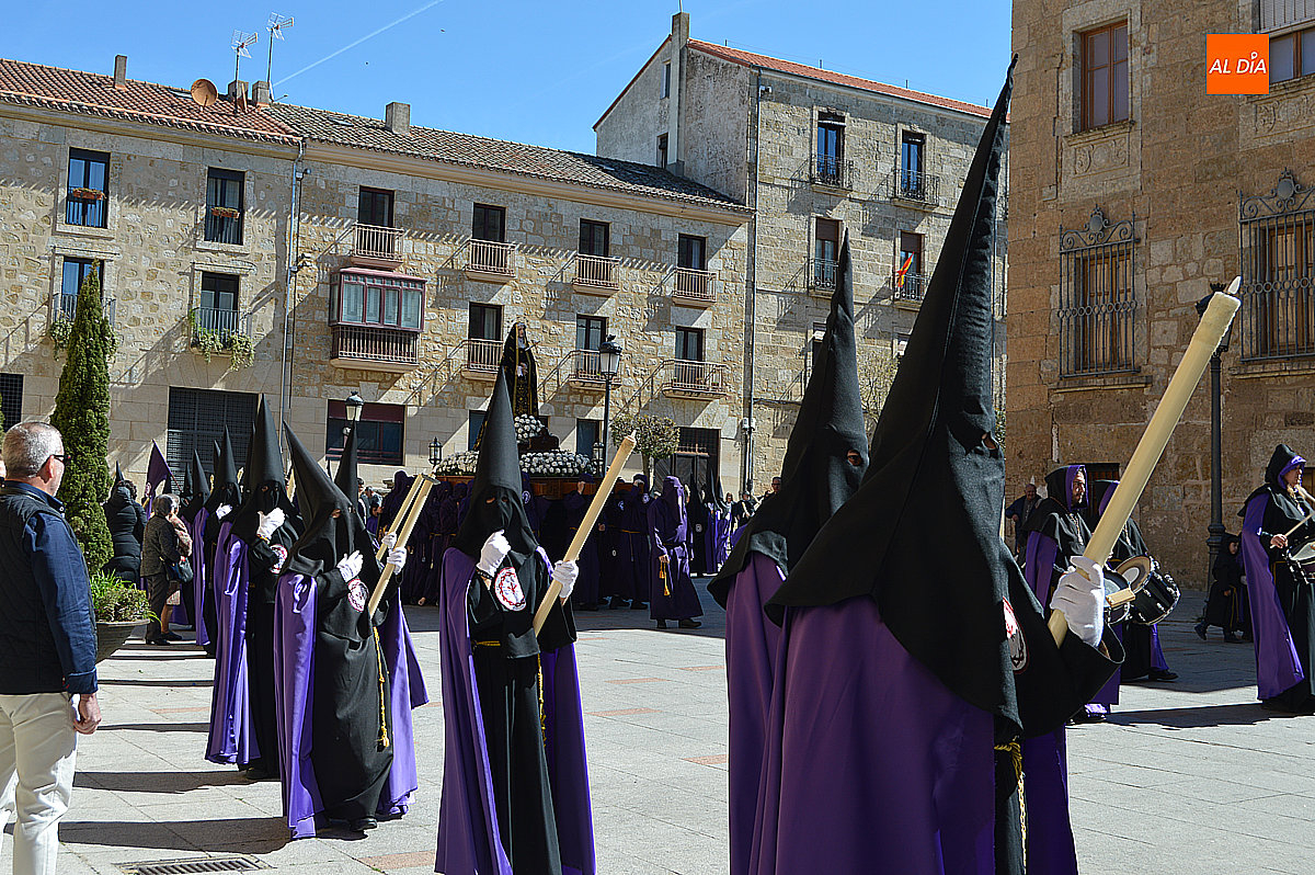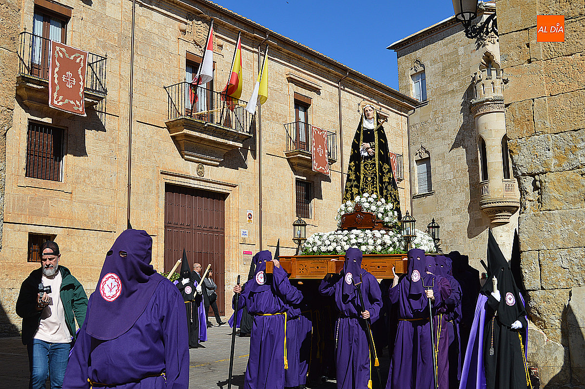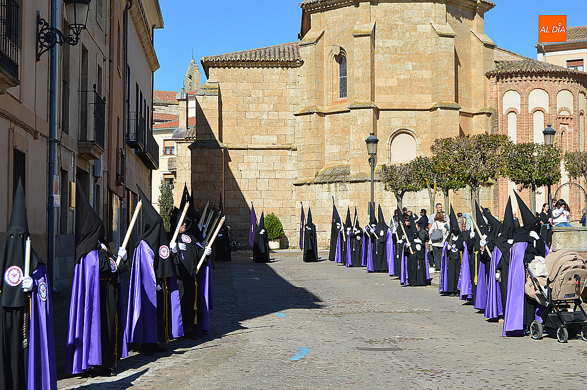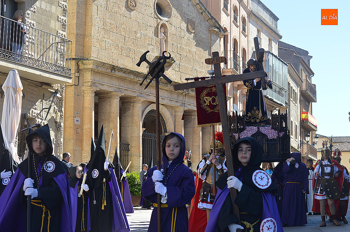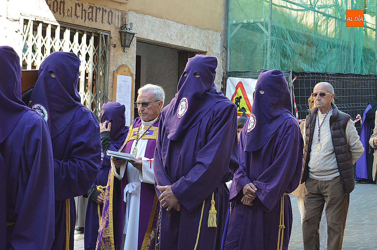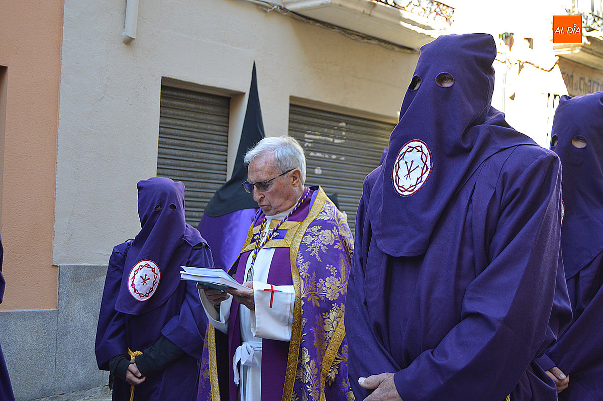 La Procesión del Santo Encuentro ha congregado a cientos de personas en la Plaza Mayor de Ciudad Rodrigo durante la mañana del Viernes Santo. Las imágenes del Cristo cargando la Cruz y La Dolorosa, de la Cofradía de Jesús Nazareno, han protagonizado este emotivo acto central antes de regresar juntas a la Catedral.
