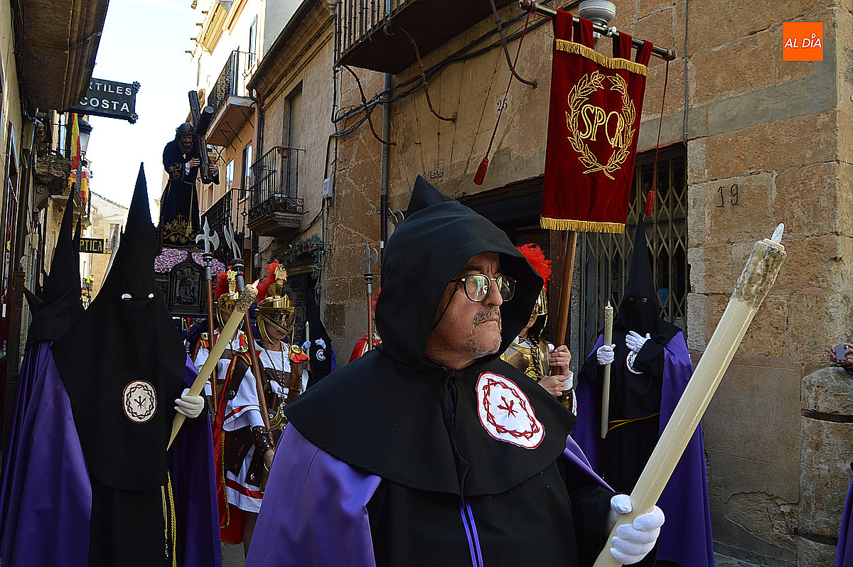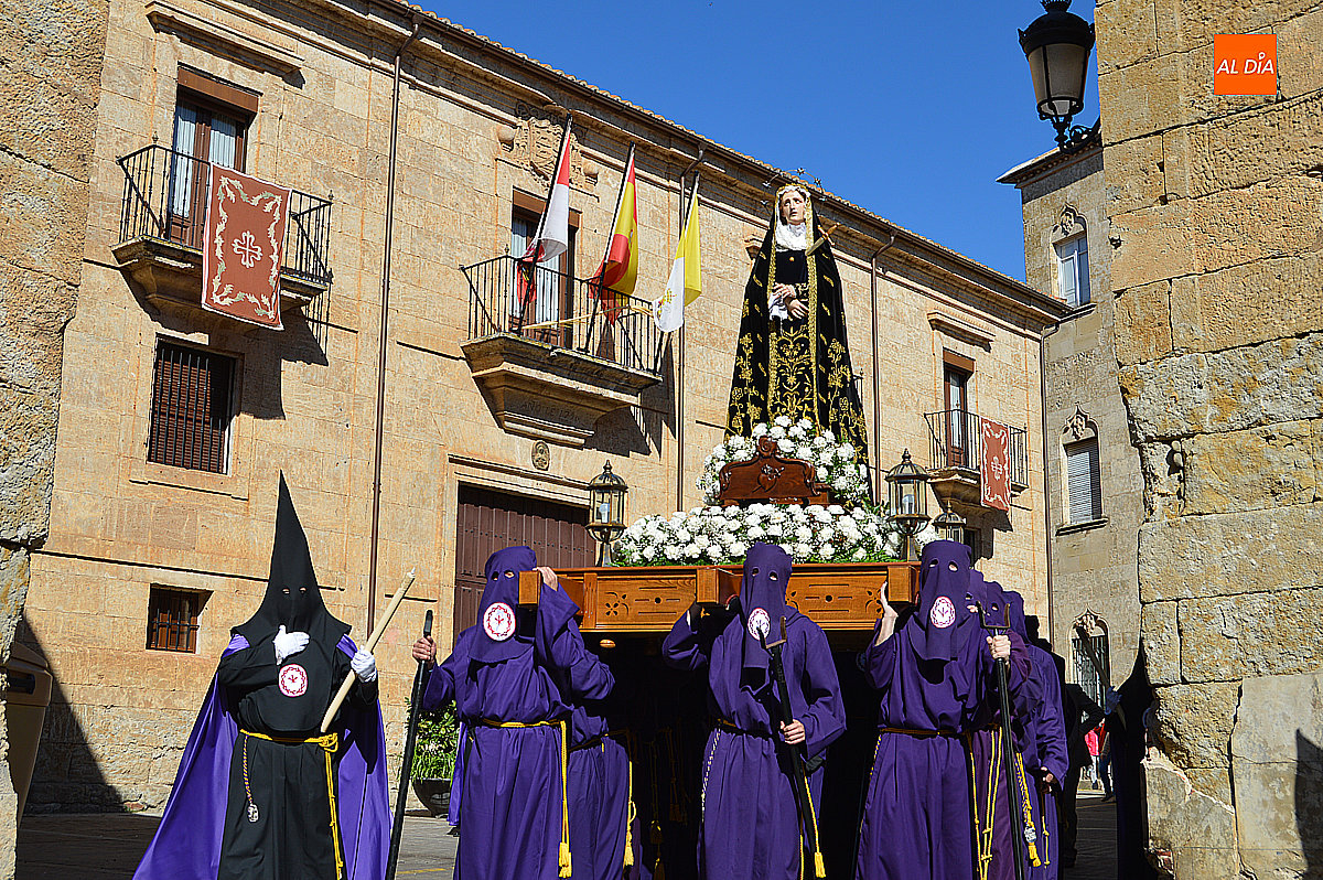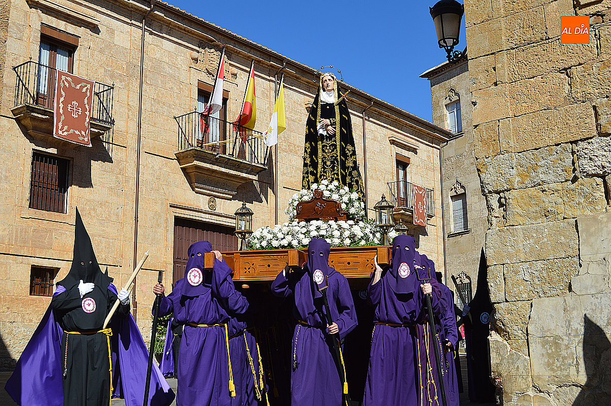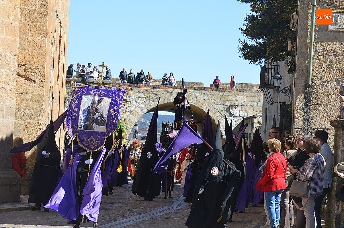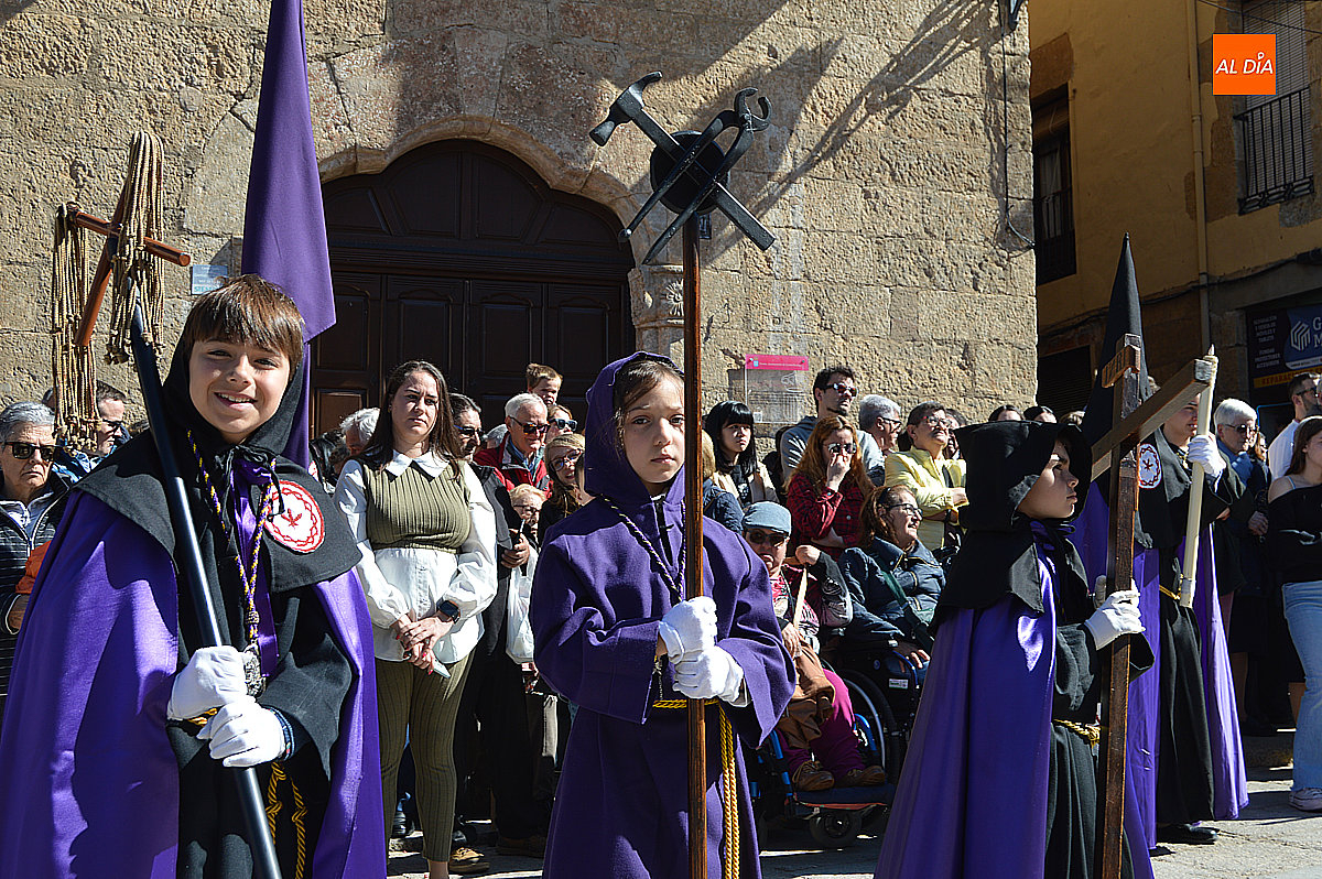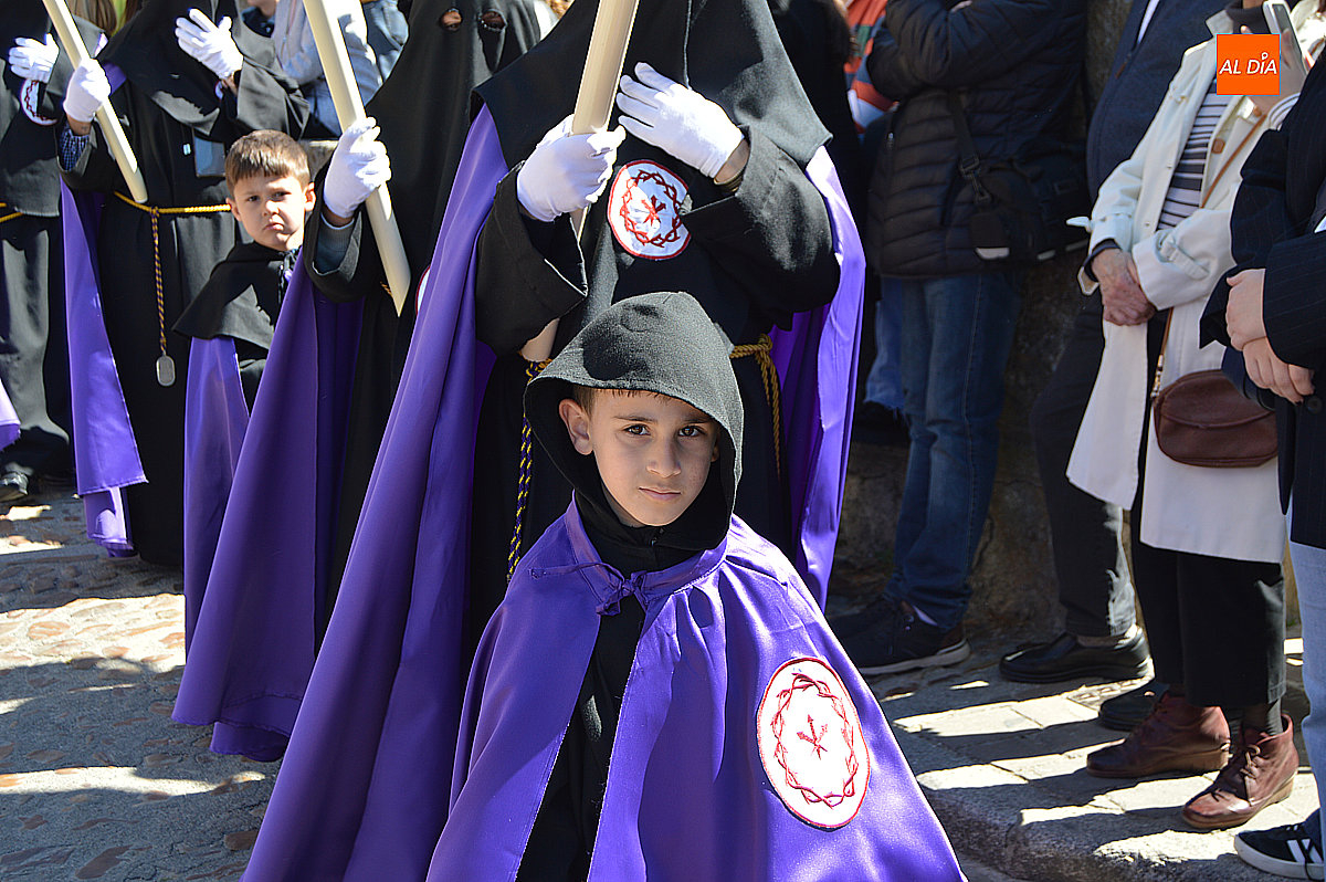 La Procesión del Santo Encuentro ha congregado a cientos de personas en la Plaza Mayor de Ciudad Rodrigo durante la mañana del Viernes Santo. Las imágenes del Cristo cargando la Cruz y La Dolorosa, de la Cofradía de Jesús Nazareno, han protagonizado este emotivo acto central antes de regresar juntas a la Catedral.