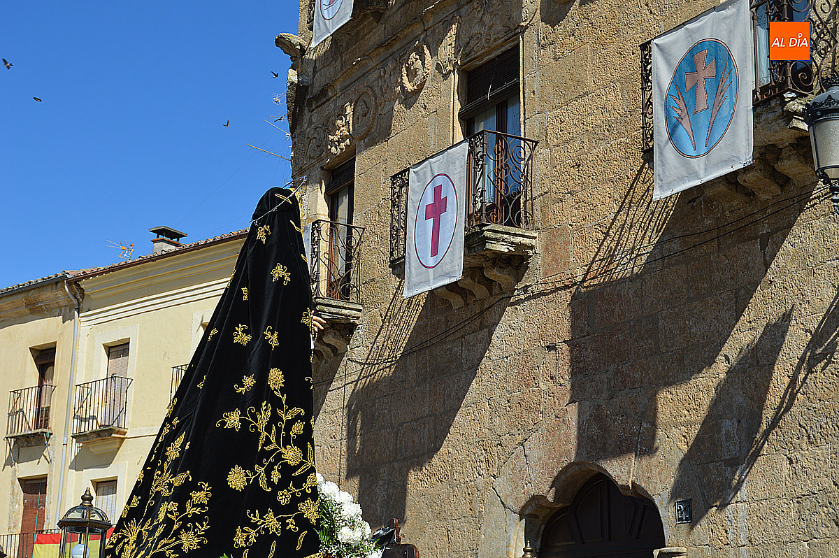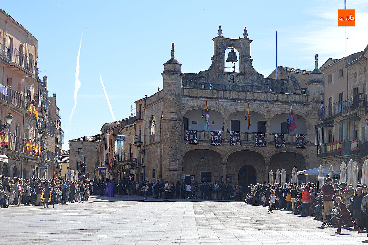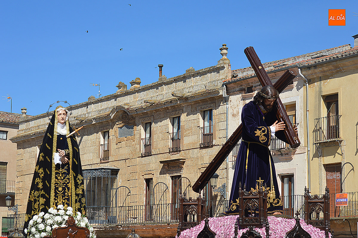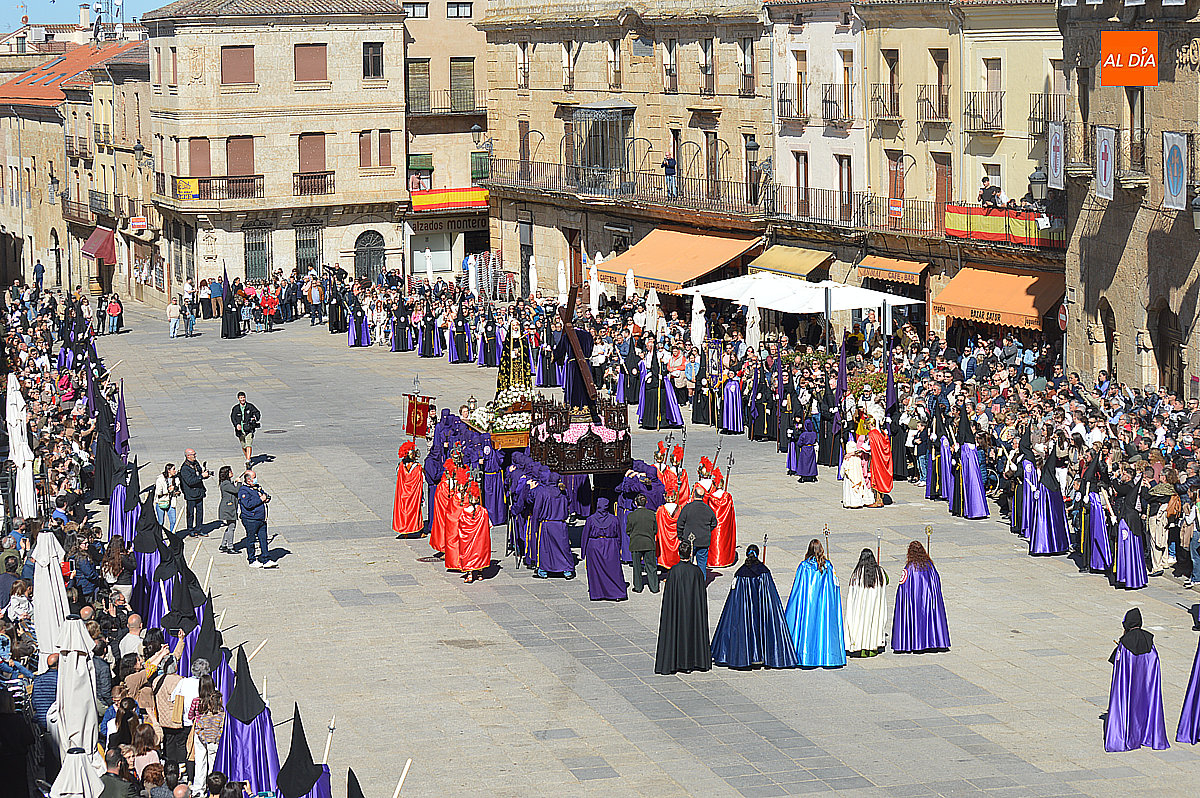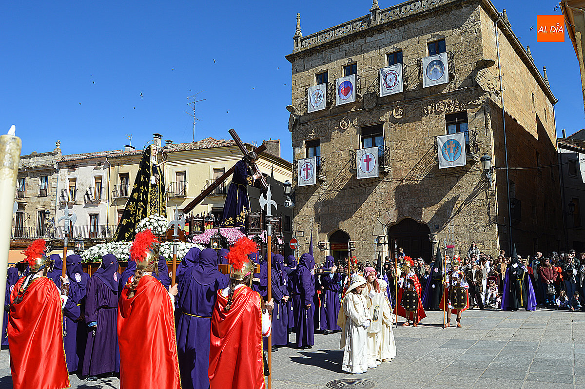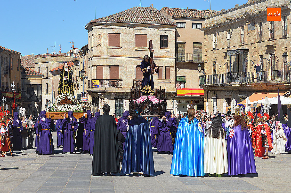 El instante central de la procesión se ha producido cuando ambas procesiones han confluido en la Plaza Mayor de Ciudad Rodrigo. Una multitud de vecinos y turistas ha arropado este acto que simboliza el cruce entre la madre y el hijo antes de la crucifixión.