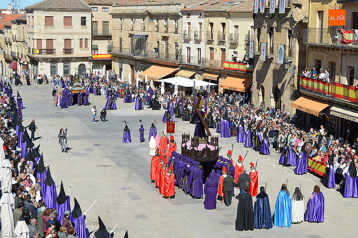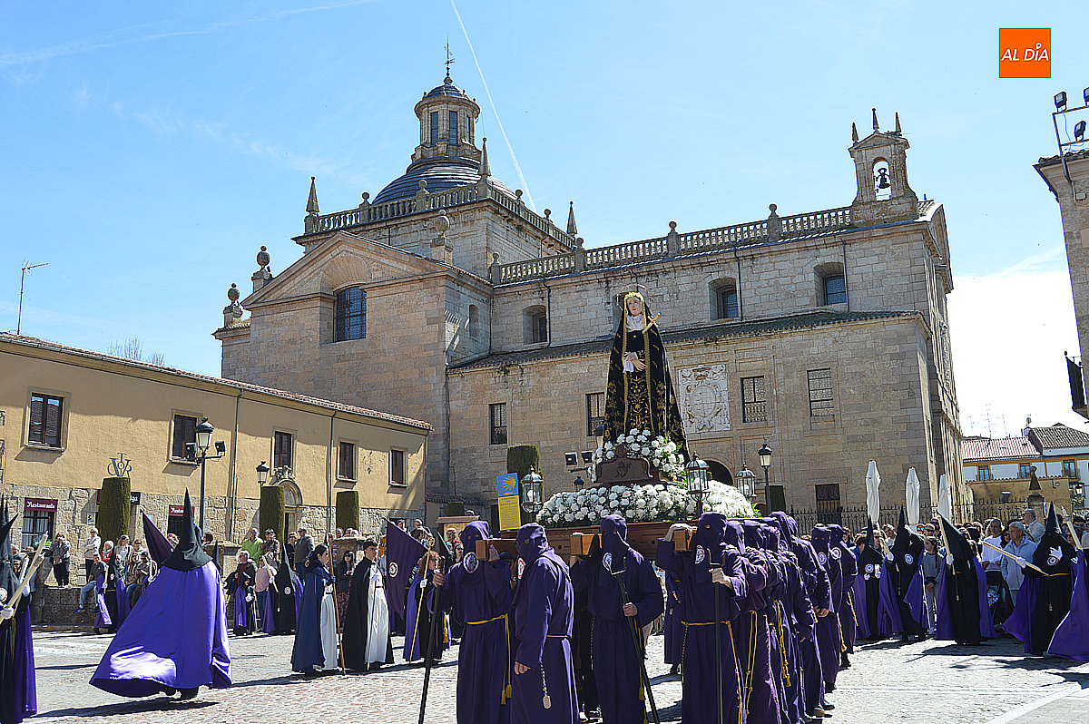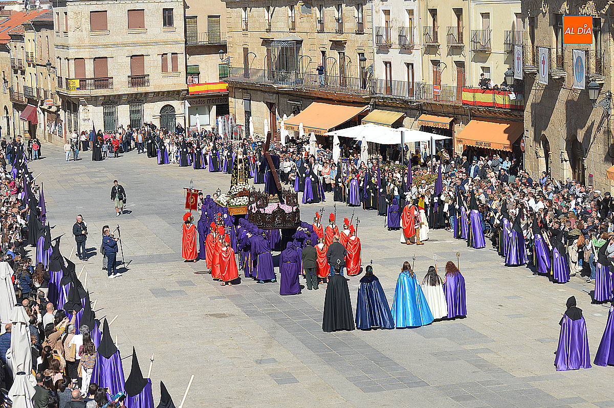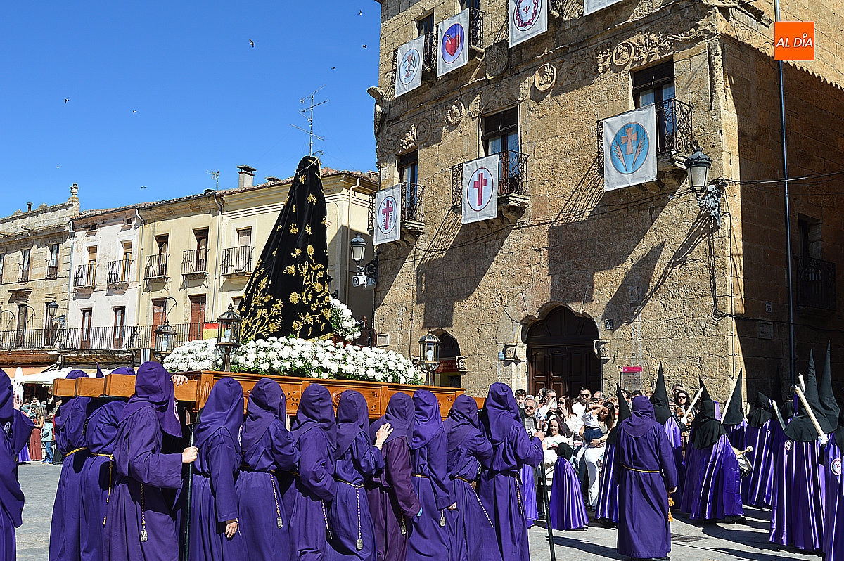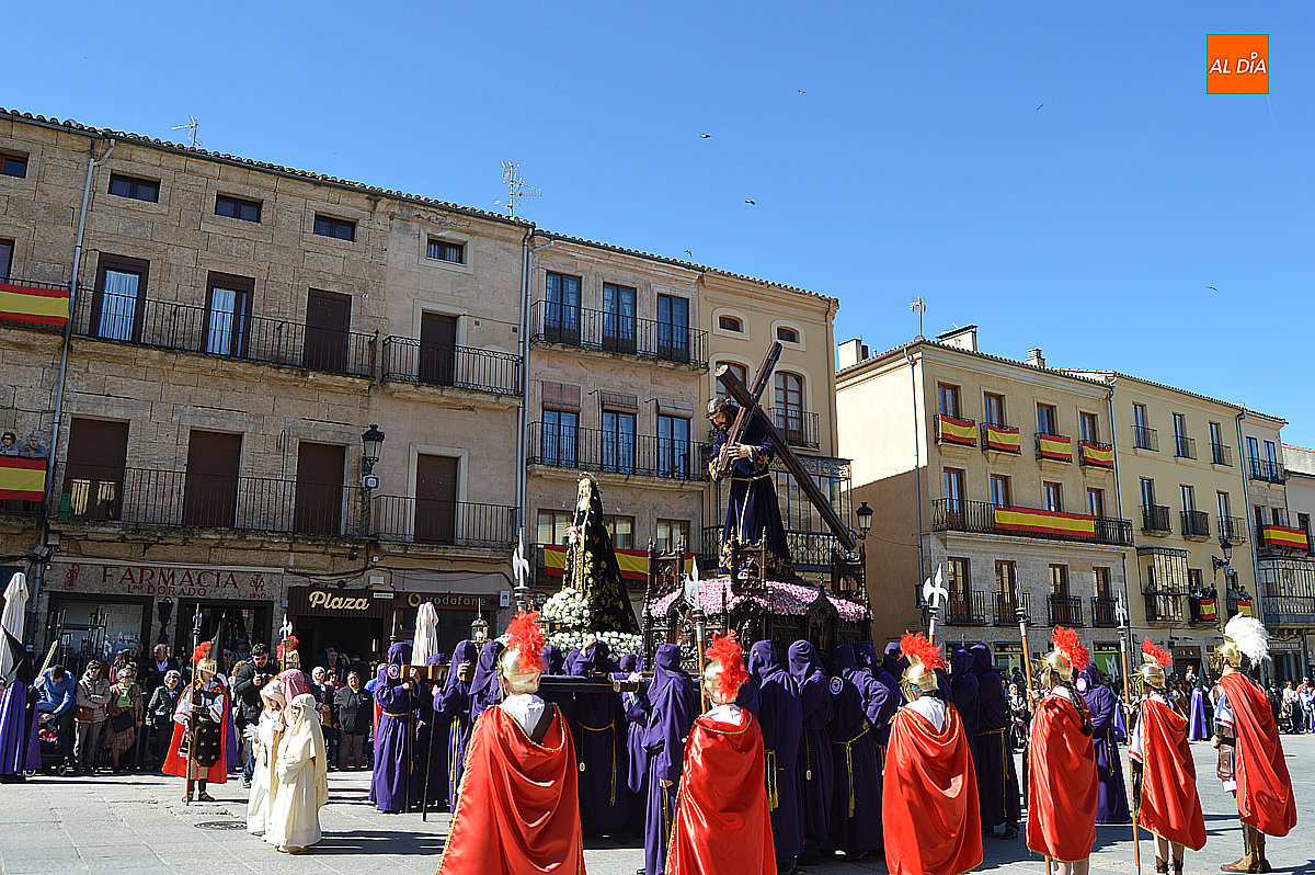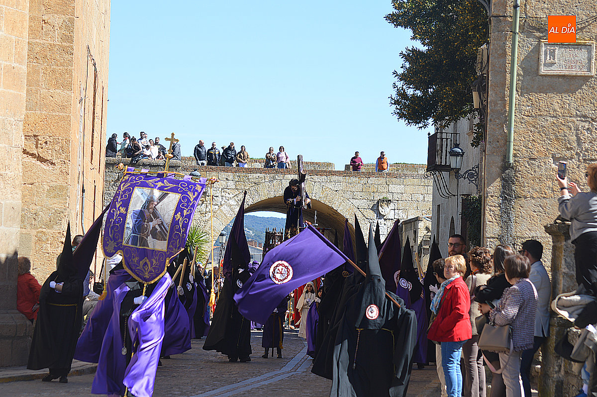 El instante central de la procesión se ha producido cuando ambas procesiones han confluido en la Plaza Mayor de Ciudad Rodrigo. Una multitud de vecinos y turistas ha arropado este acto que simboliza el cruce entre la madre y el hijo antes de la crucifixión.
