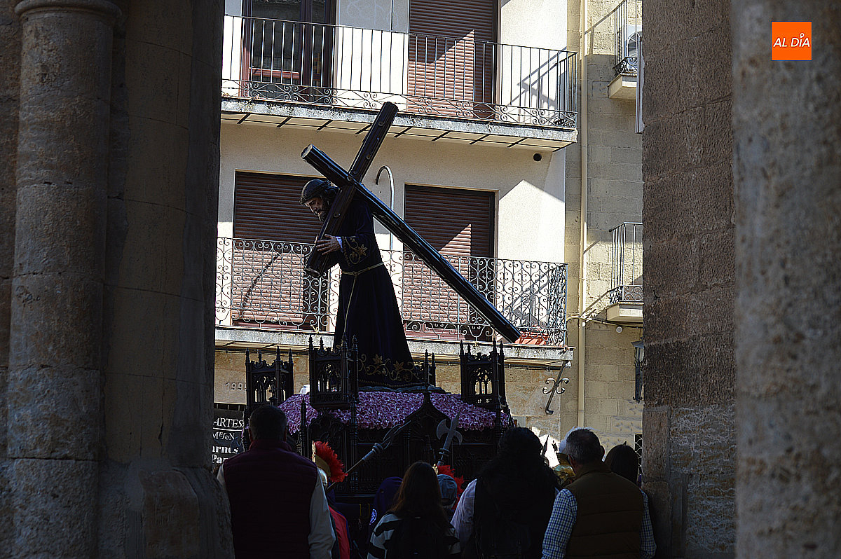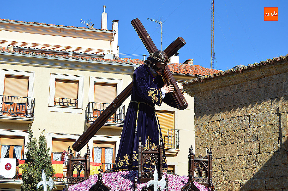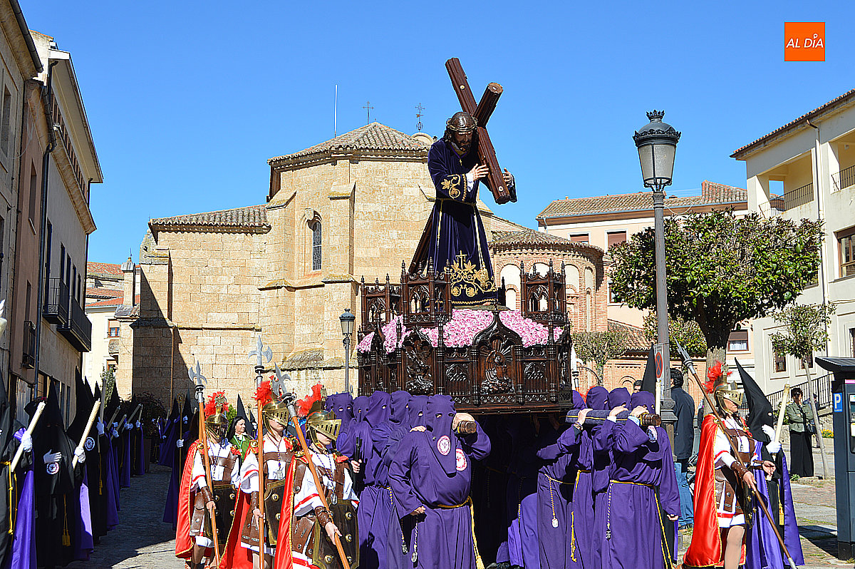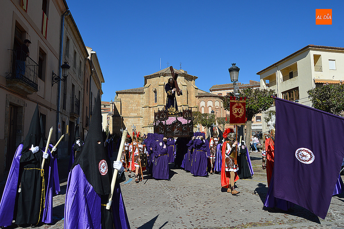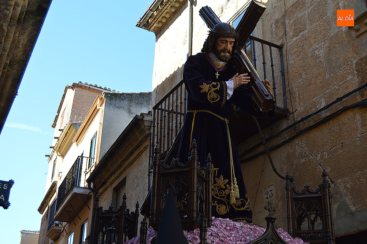 Por un lado, la talla del Cristo cargando la Cruz ha iniciado su camino desde la iglesia de San Agustín. El paso ha avanzado por las vías mirobrigenses acompañado por el característico sonido de los tambores de la cofradía.