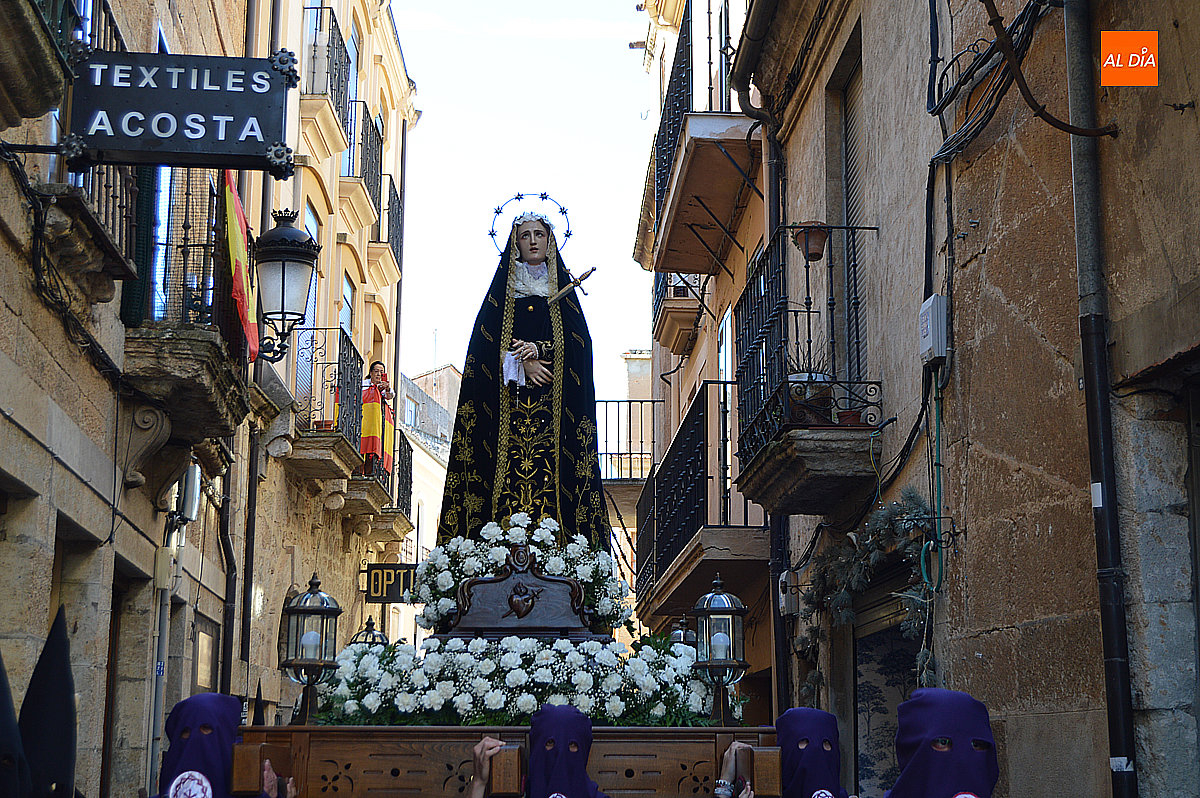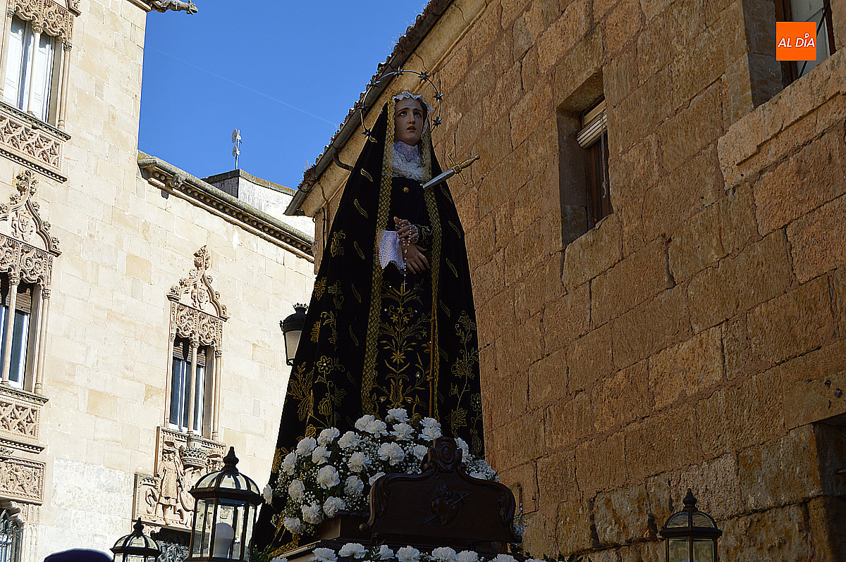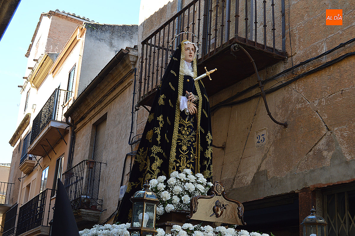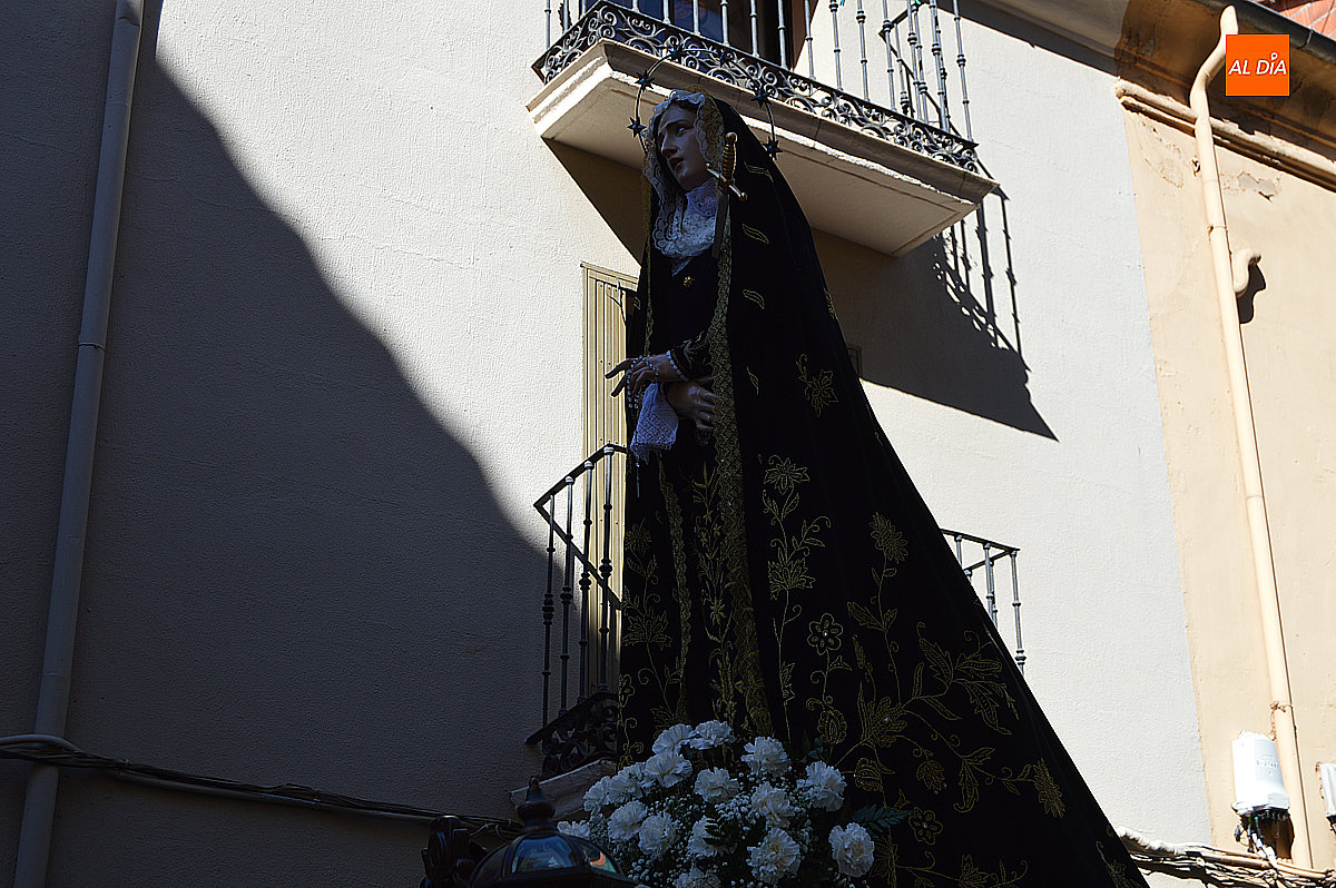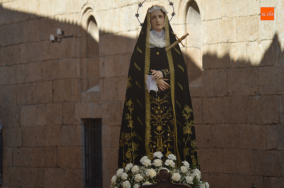 De forma simultánea, la imagen de La Dolorosa, que representa el sufrimiento de la Virgen con un cuchillo clavado en el corazón, simbolo del corazón partido por ver a su hijo ser llevado hacia la muerte, ha partido desde la Santa Iglesia Catedral. Su recorrido se ha caracterizado por un profundo silencio, roto únicamente por los cánticos religiosos interpretados por el sacerdote que escoltaba la talla. Haciendo que todos los presentes notaran y sintieran el dolor de la Virgen.