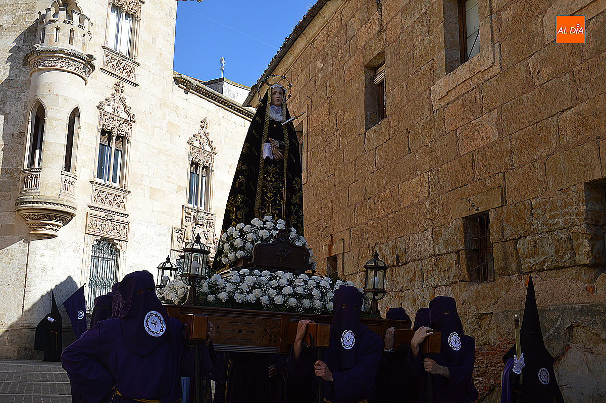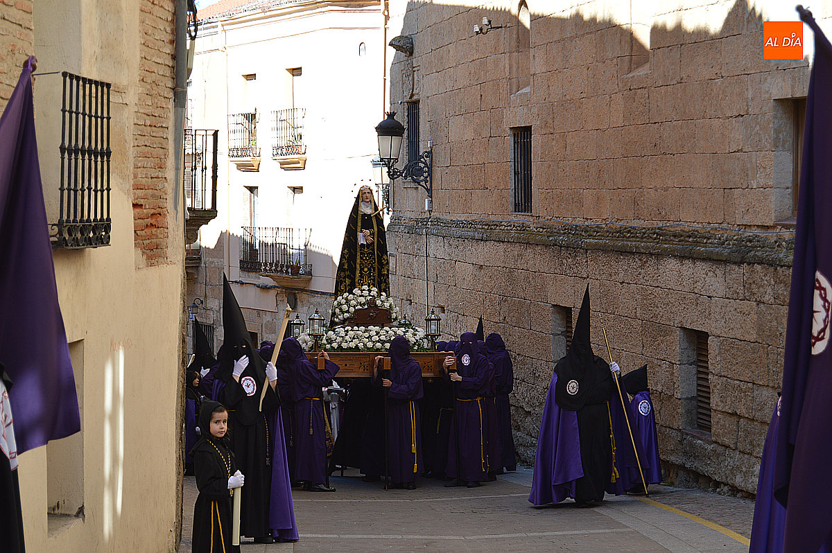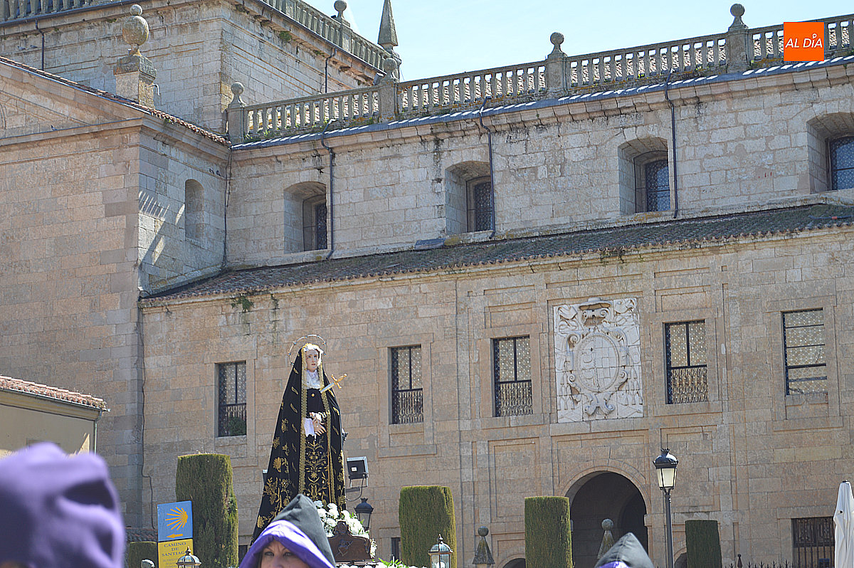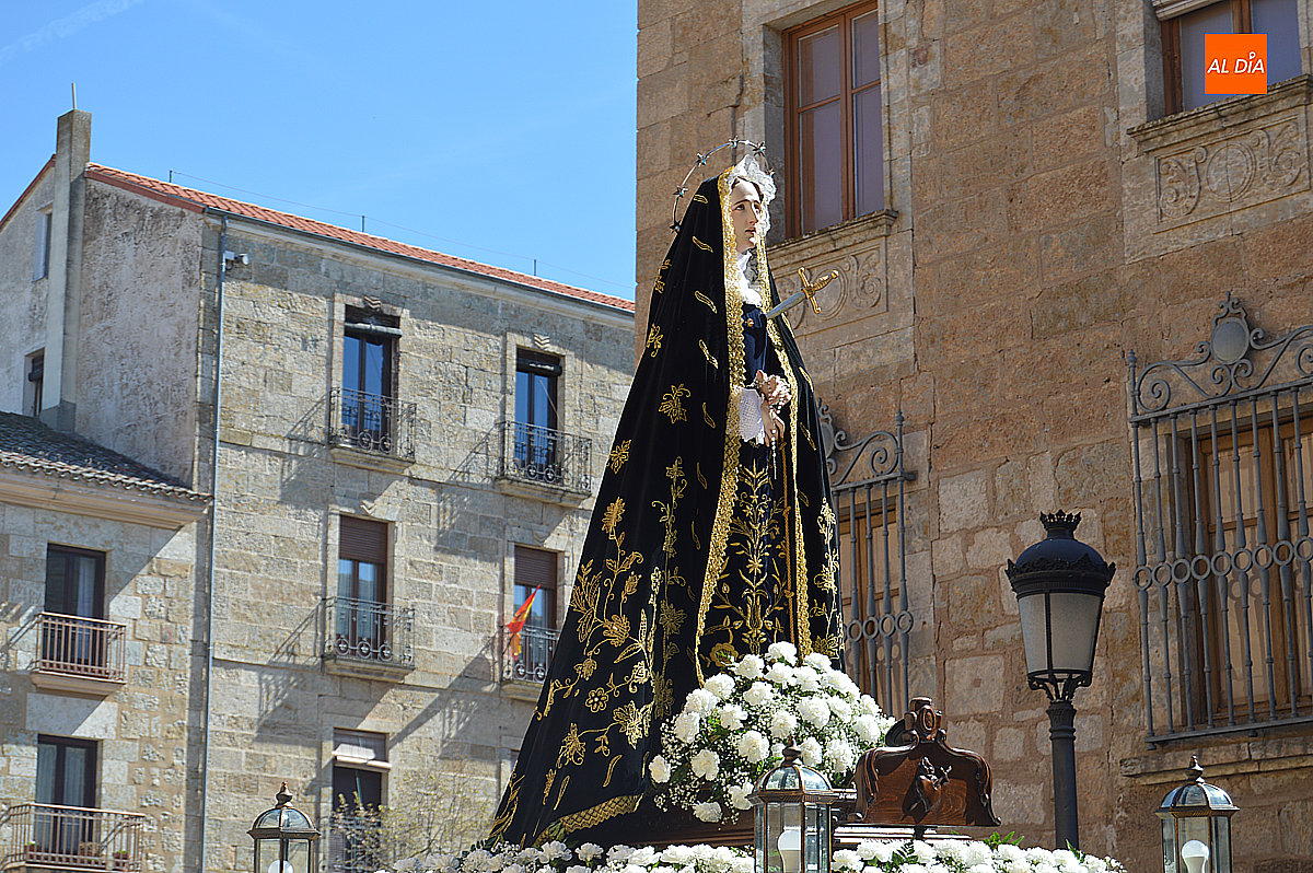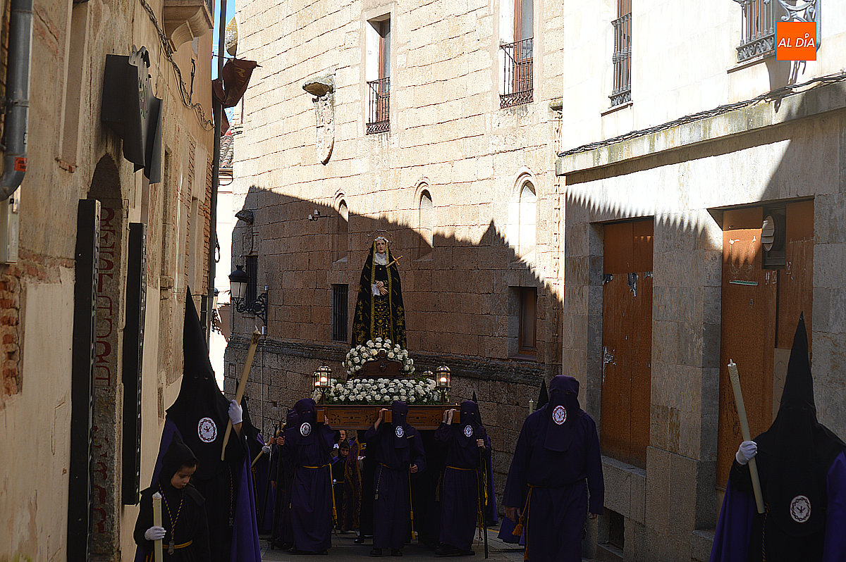 De forma simultánea, la imagen de La Dolorosa, que representa el sufrimiento de la Virgen con un cuchillo clavado en el corazón, simbolo del corazón partido por ver a su hijo ser llevado hacia la muerte, ha partido desde la Santa Iglesia Catedral. Su recorrido se ha caracterizado por un profundo silencio, roto únicamente por los cánticos religiosos interpretados por el sacerdote que escoltaba la talla. Haciendo que todos los presentes notaran y sintieran el dolor de la Virgen.