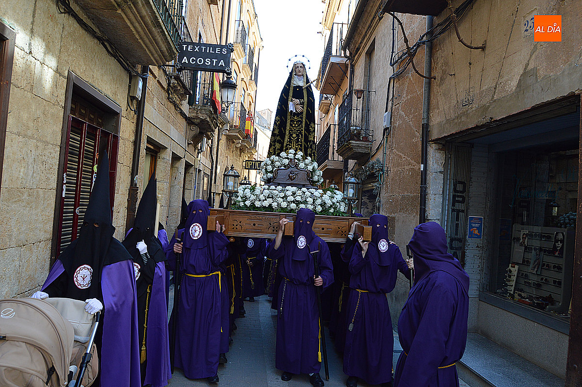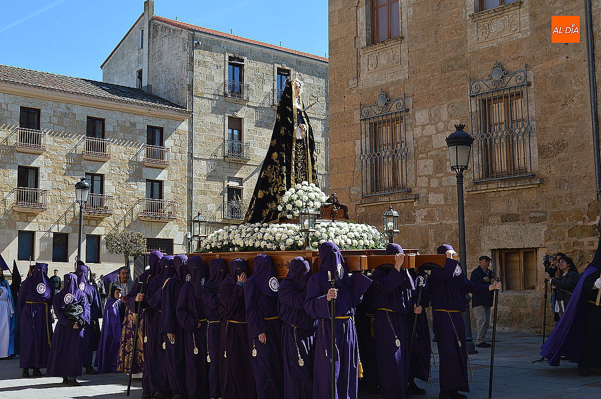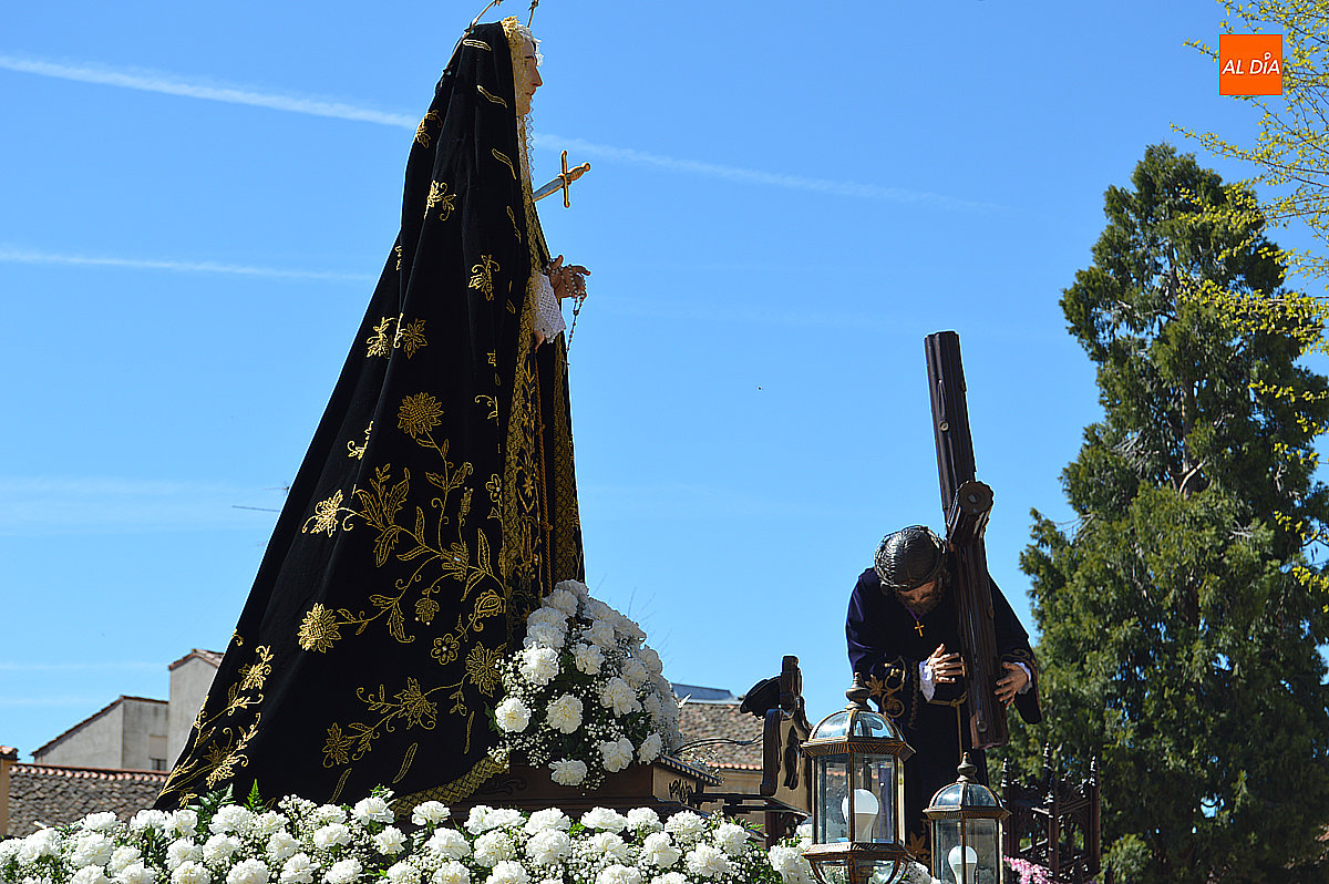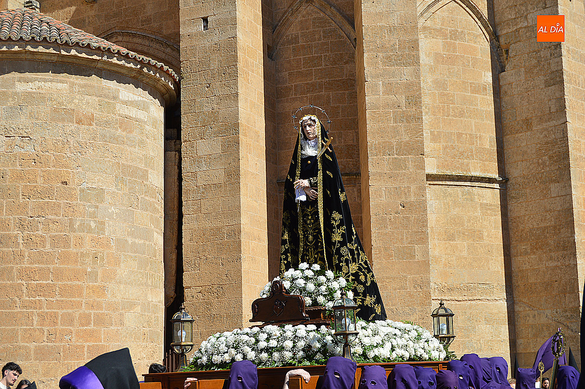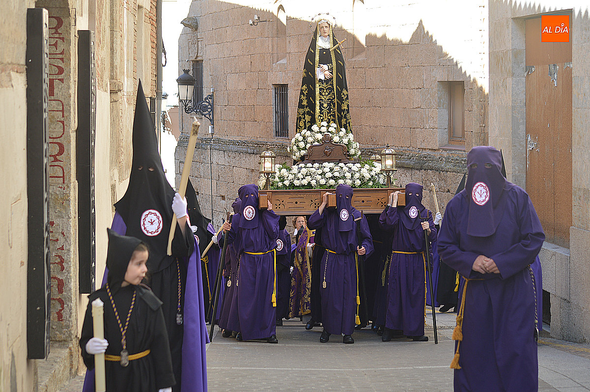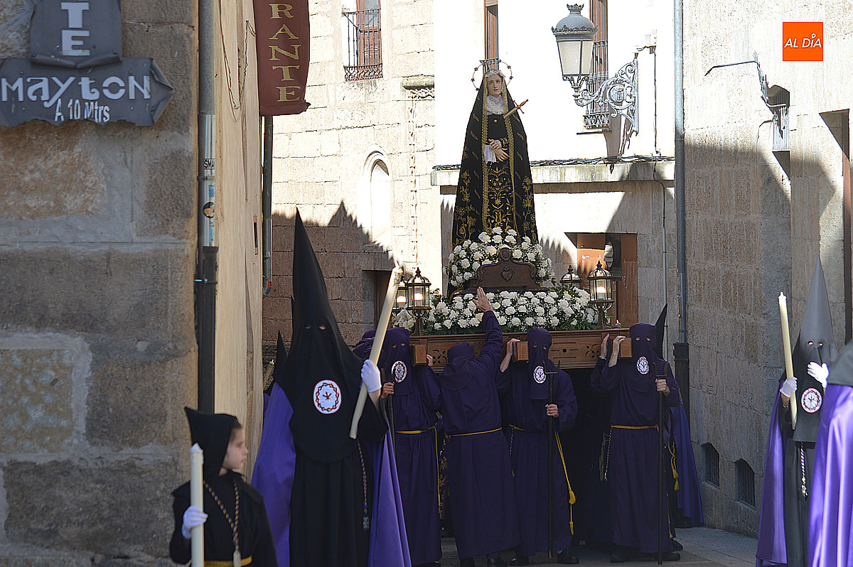 De forma simultánea, la imagen de La Dolorosa, que representa el sufrimiento de la Virgen con un cuchillo clavado en el corazón, simbolo del corazón partido por ver a su hijo ser llevado hacia la muerte, ha partido desde la Santa Iglesia Catedral. Su recorrido se ha caracterizado por un profundo silencio, roto únicamente por los cánticos religiosos interpretados por el sacerdote que escoltaba la talla. Haciendo que todos los presentes notaran y sintieran el dolor de la Virgen.