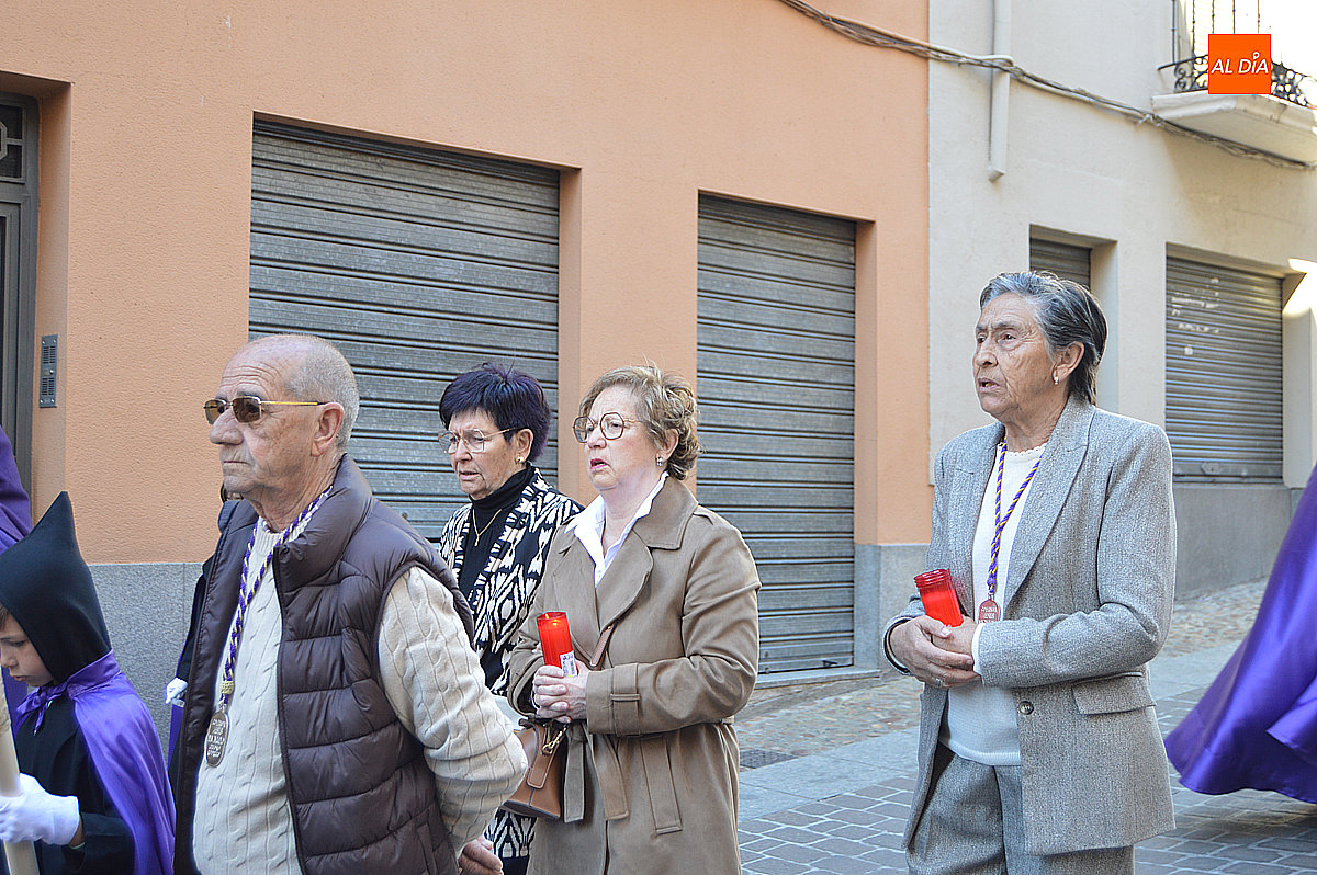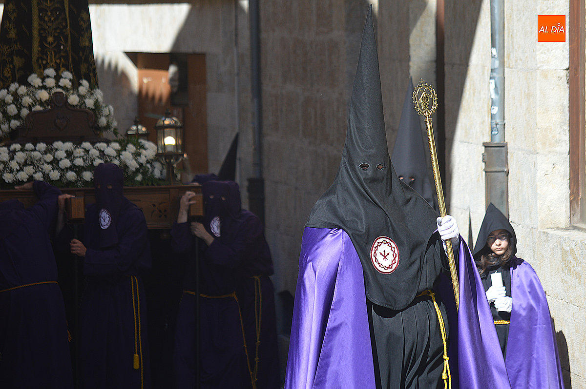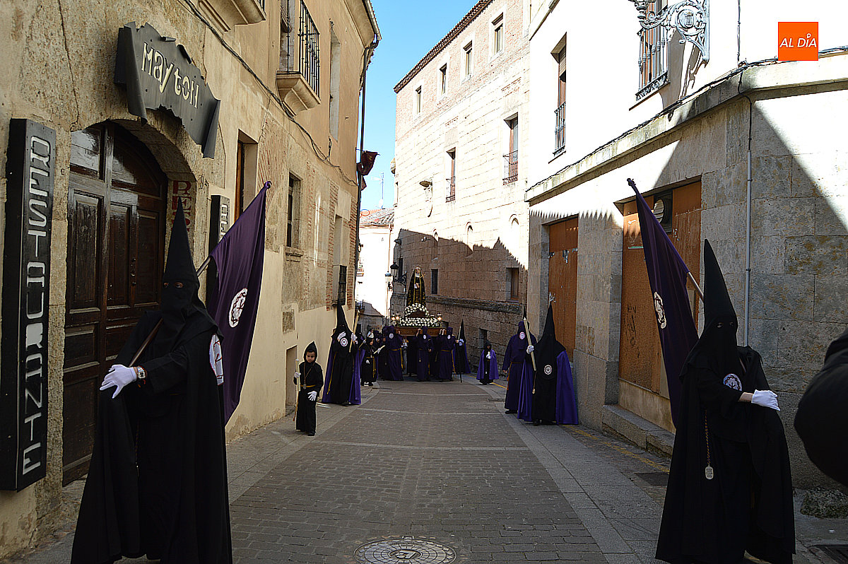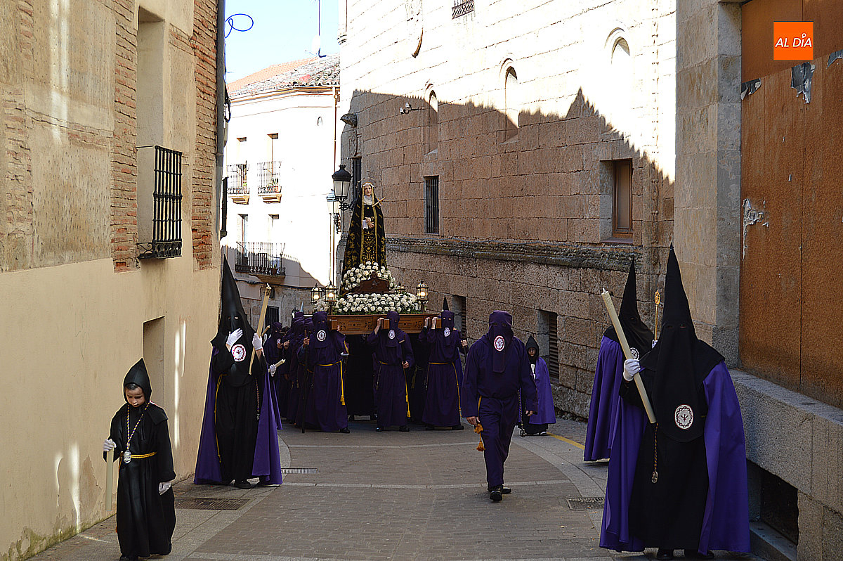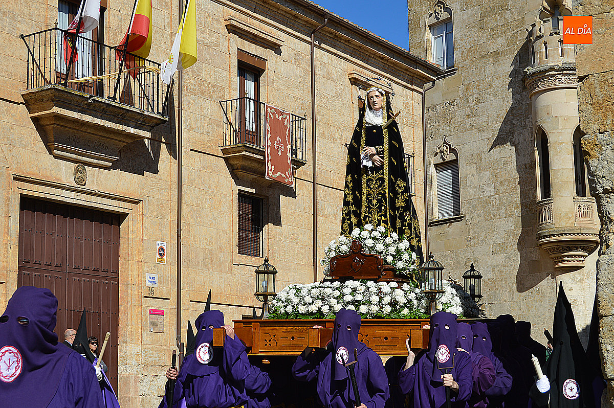 De forma simultánea, la imagen de La Dolorosa, que representa el sufrimiento de la Virgen con un cuchillo clavado en el corazón, simbolo del corazón partido por ver a su hijo ser llevado hacia la muerte, ha partido desde la Santa Iglesia Catedral. Su recorrido se ha caracterizado por un profundo silencio, roto únicamente por los cánticos religiosos interpretados por el sacerdote que escoltaba la talla. Haciendo que todos los presentes notaran y sintieran el dolor de la Virgen.