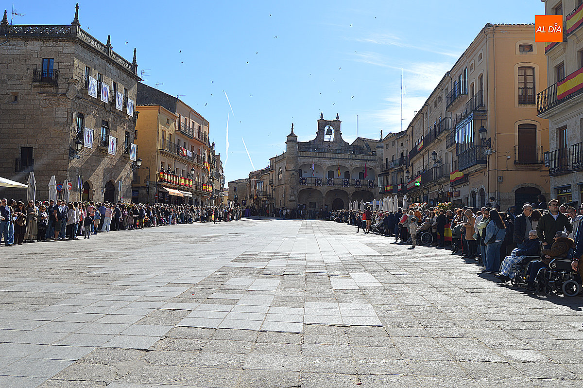 La Plaza Mayor mirobrigense acoge uno de los momentos más esperados de la Semana Santa local. Las tallas de Jesús Nazareno y la Virgen Dolorosa convergen en el centro neurálgico del municipio ante cientos de vecinos y visitantes, marcando el inicio de los actos centrales de esta jornada festiva.