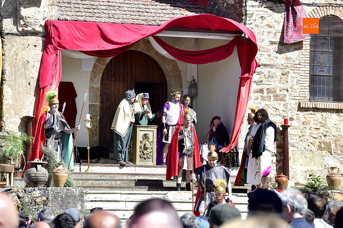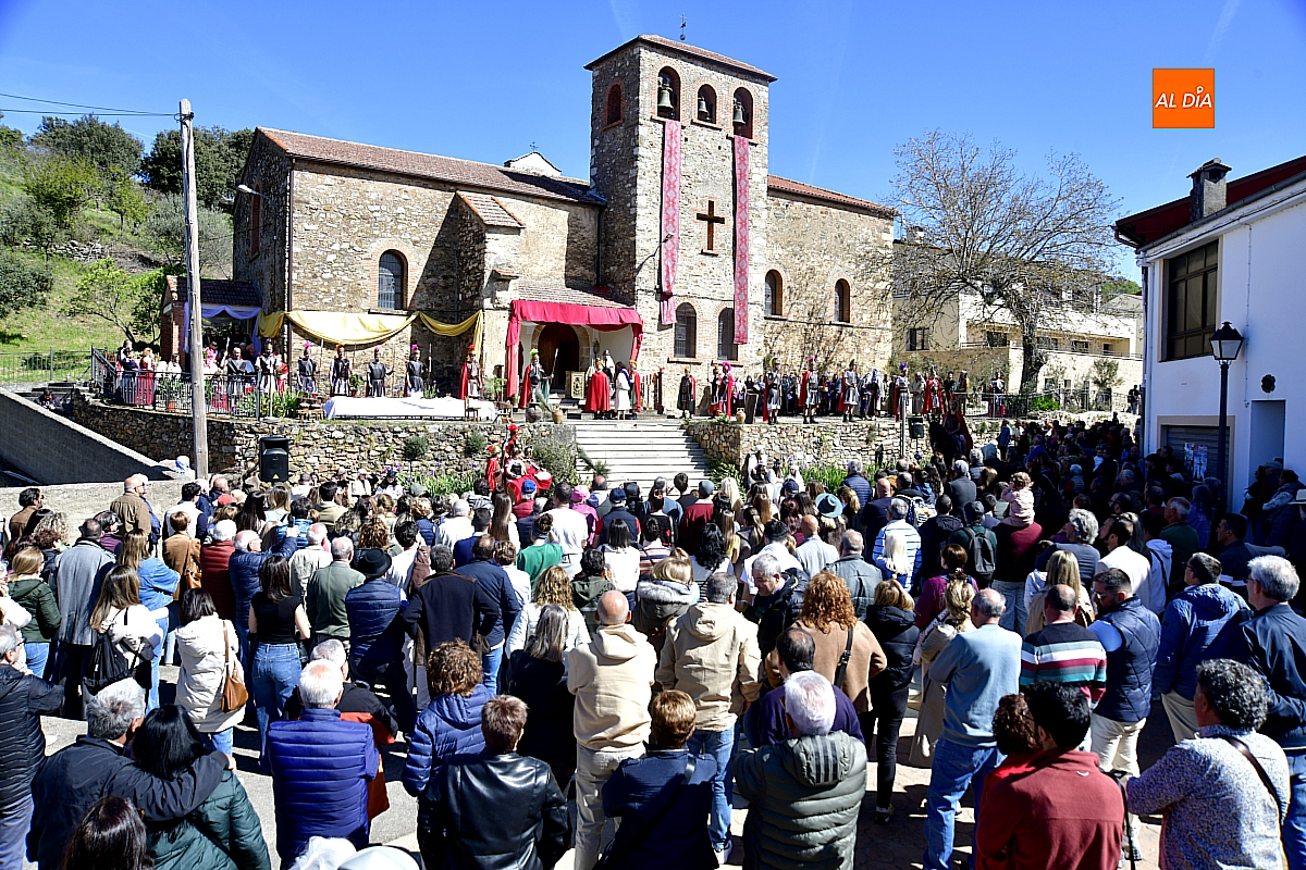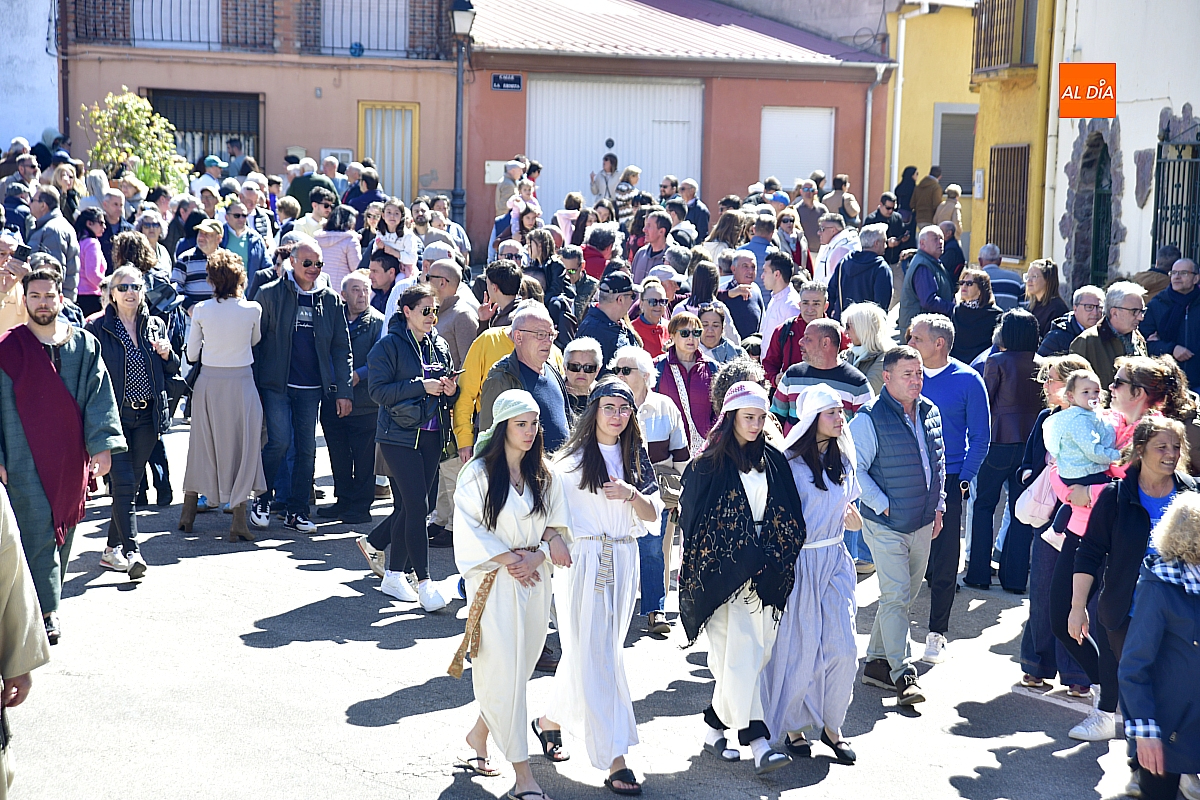 La jornada acompañó con un cielo limpio y una temperatura amable, circunstancia que favoreció la llegada de numerosos visitantes procedentes de localidades cercanas. Desde los primeros compases, con la entrada en Jerusalén, el relato fue avanzando hacia el entorno de la iglesia, convertido en epicentro de las escenas más reconocibles: la Última Cena, la Oración en el Huerto de los Olivos, el Prendimiento o la comparecencia ante Pilatos.