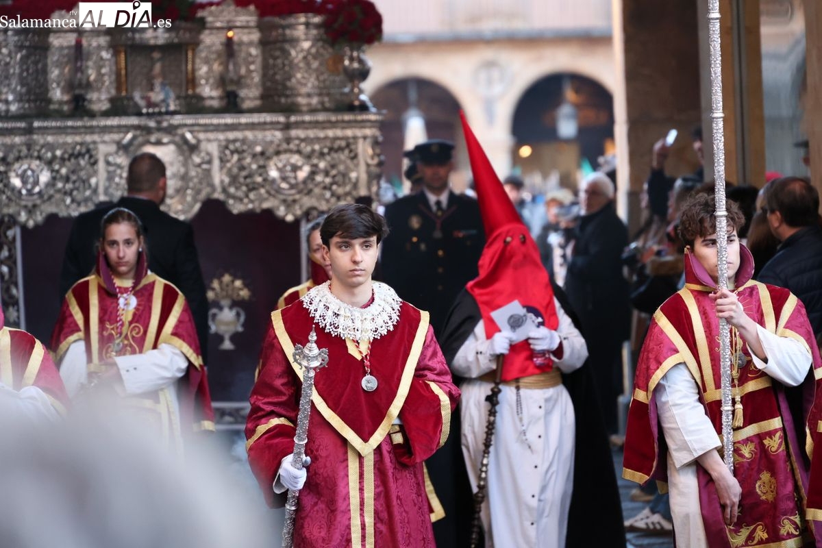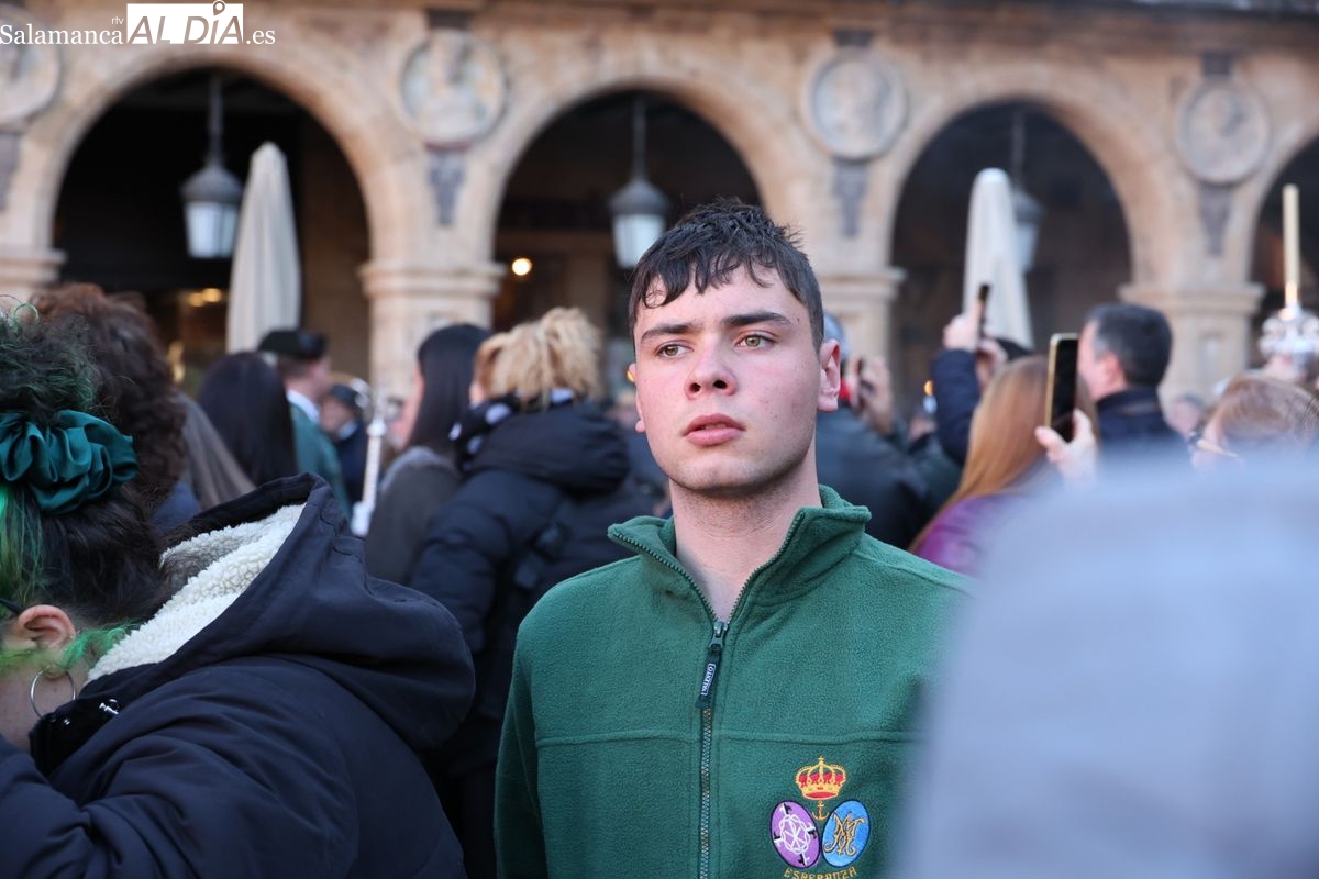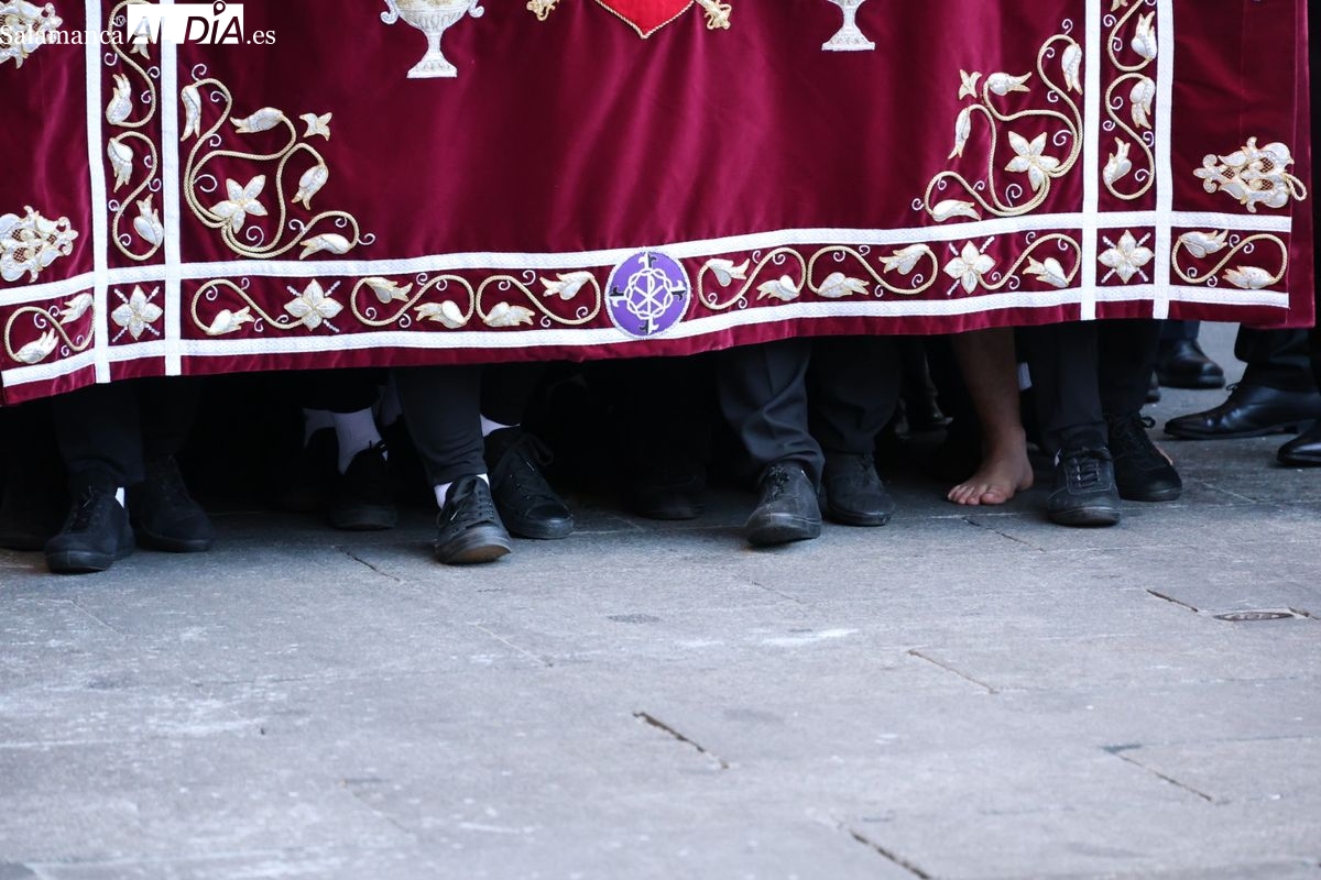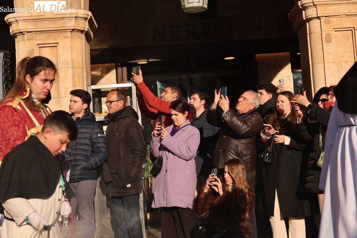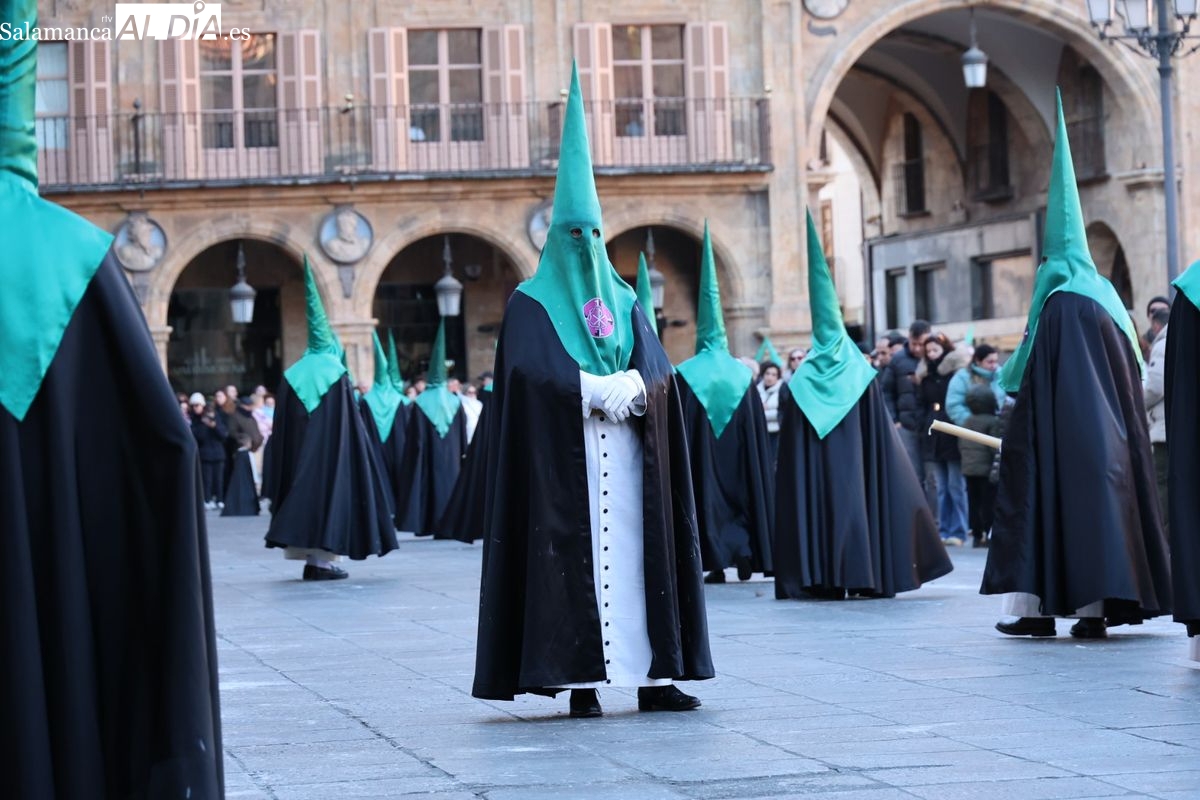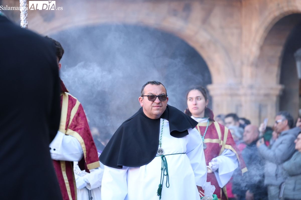 A las 5:00 horas de la mañana, las puertas del Convento de San Esteban se han abierto para dar inicio a una de las procesiones más esperadas de la Semana Santa salmantina. Cientos de fieles se han congregado en los alrededores del templo para acompañar a la Hermandad Dominicana en su recorrido por las calles del centro de la ciudad.