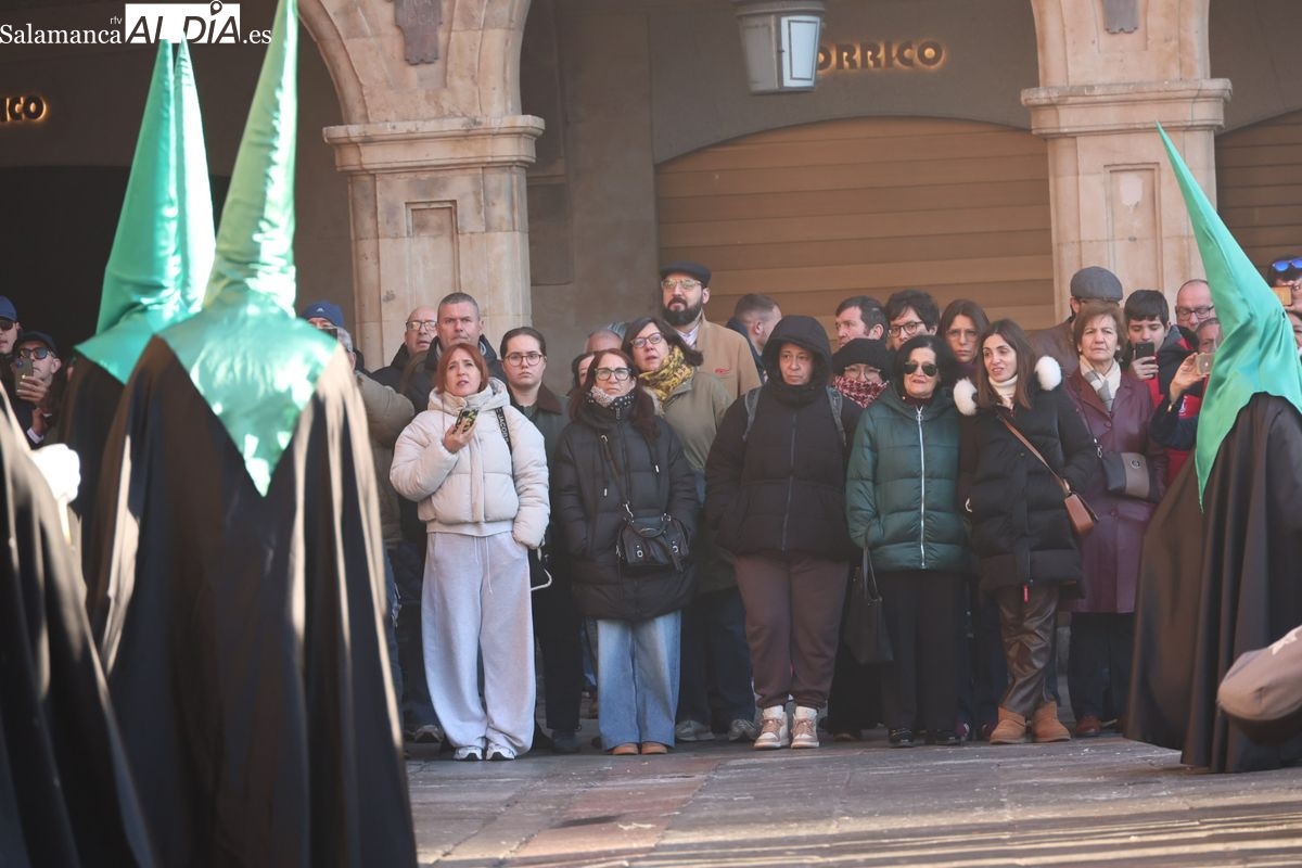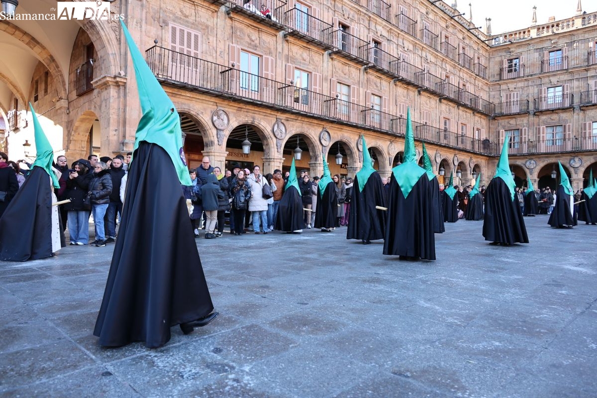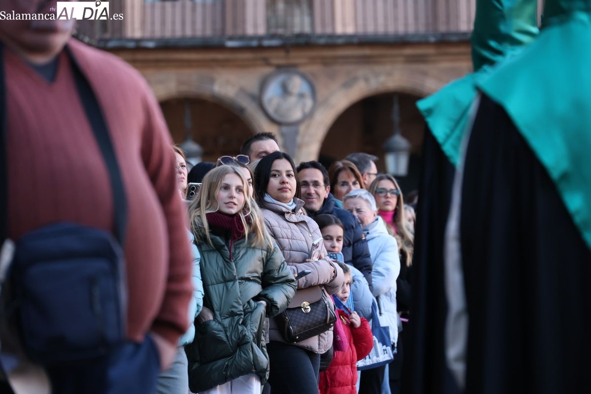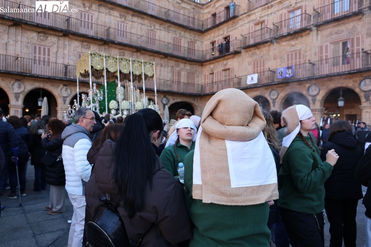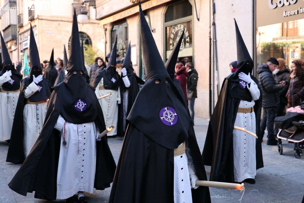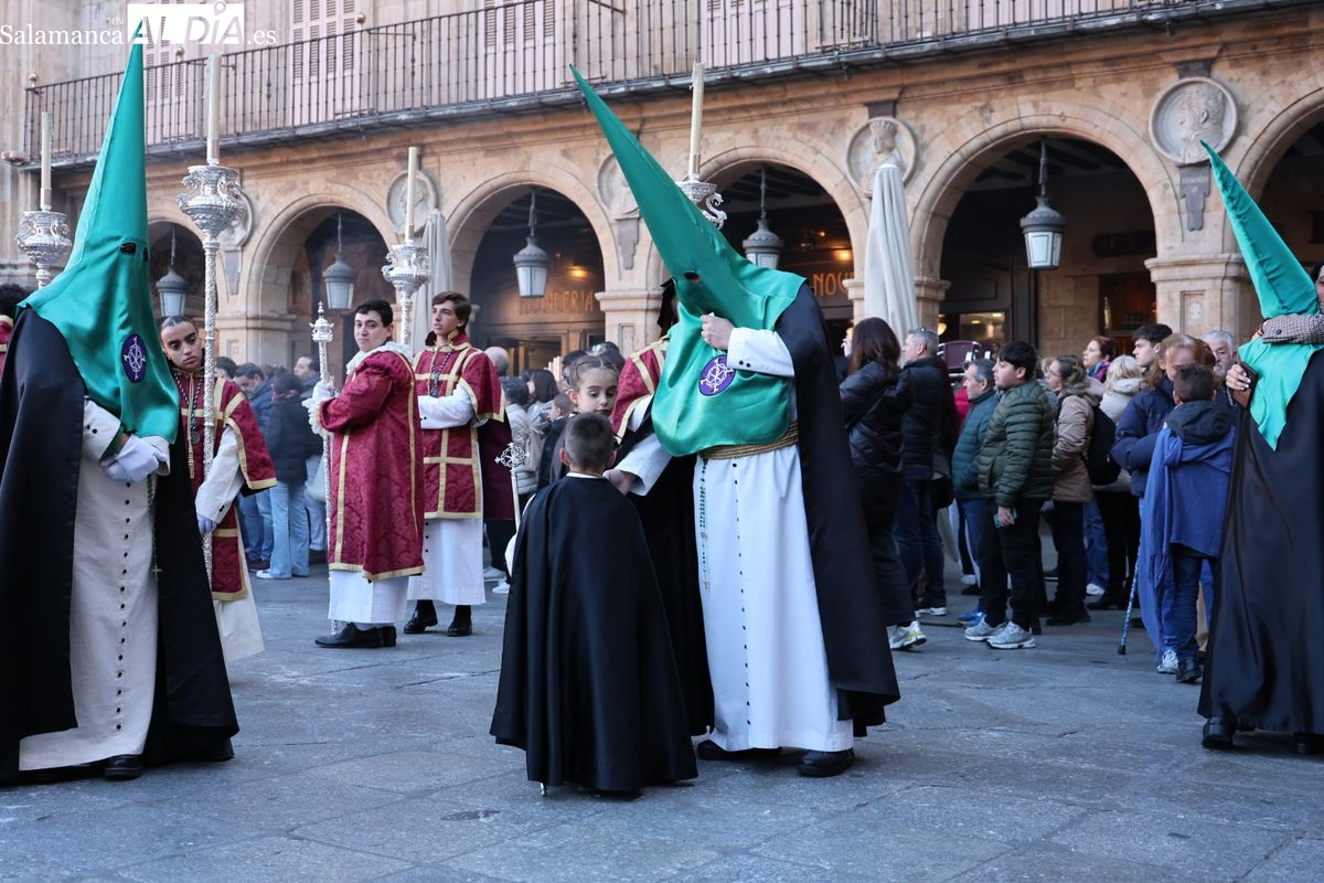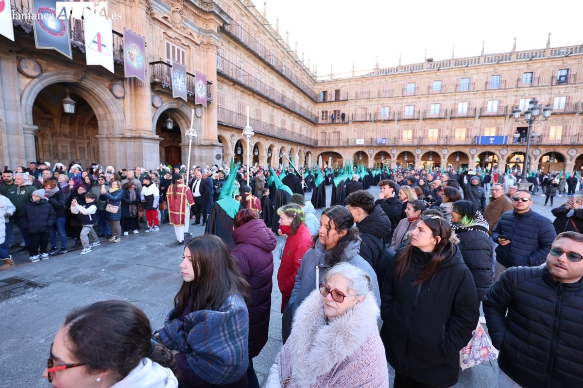 A las 5:00 horas de la mañana, las puertas del Convento de San Esteban se han abierto para dar inicio a una de las procesiones más esperadas de la Semana Santa salmantina. Cientos de fieles se han congregado en los alrededores del templo para acompañar a la Hermandad Dominicana en su recorrido por las calles del centro de la ciudad.
