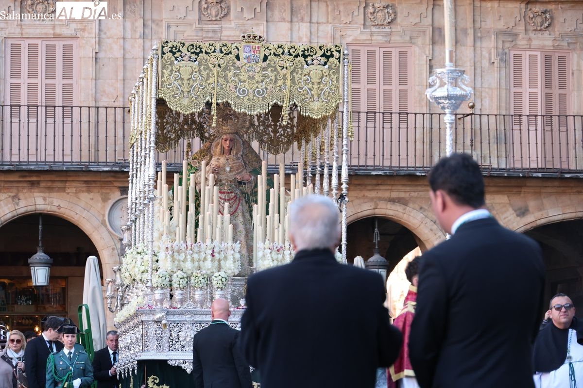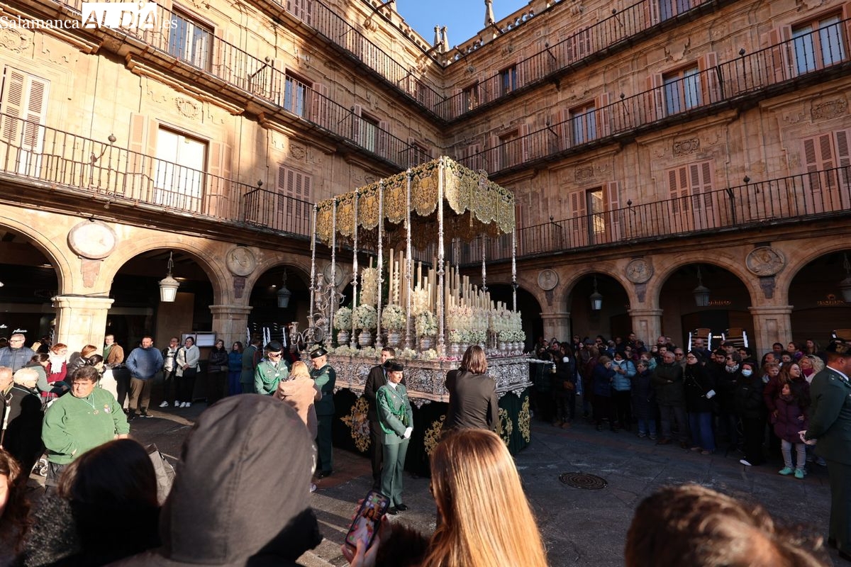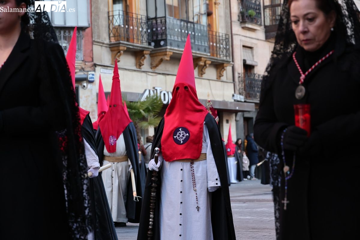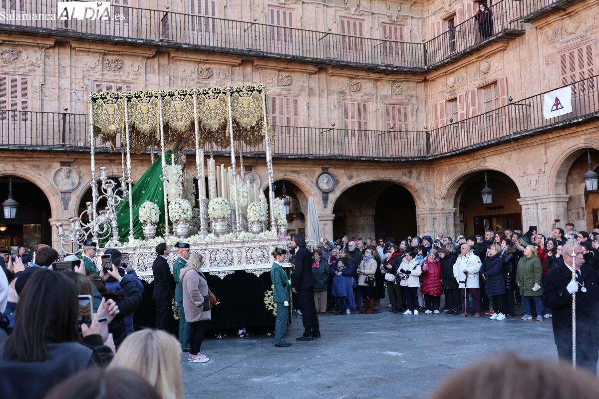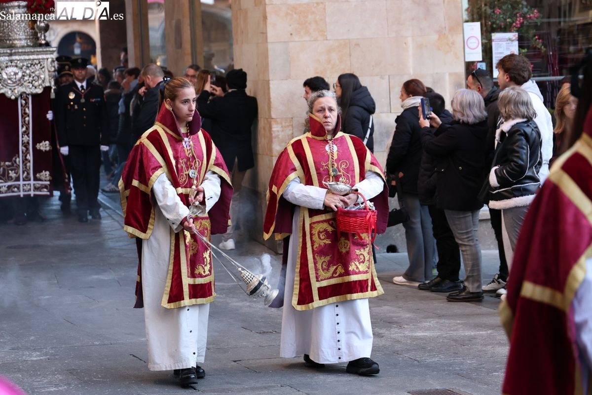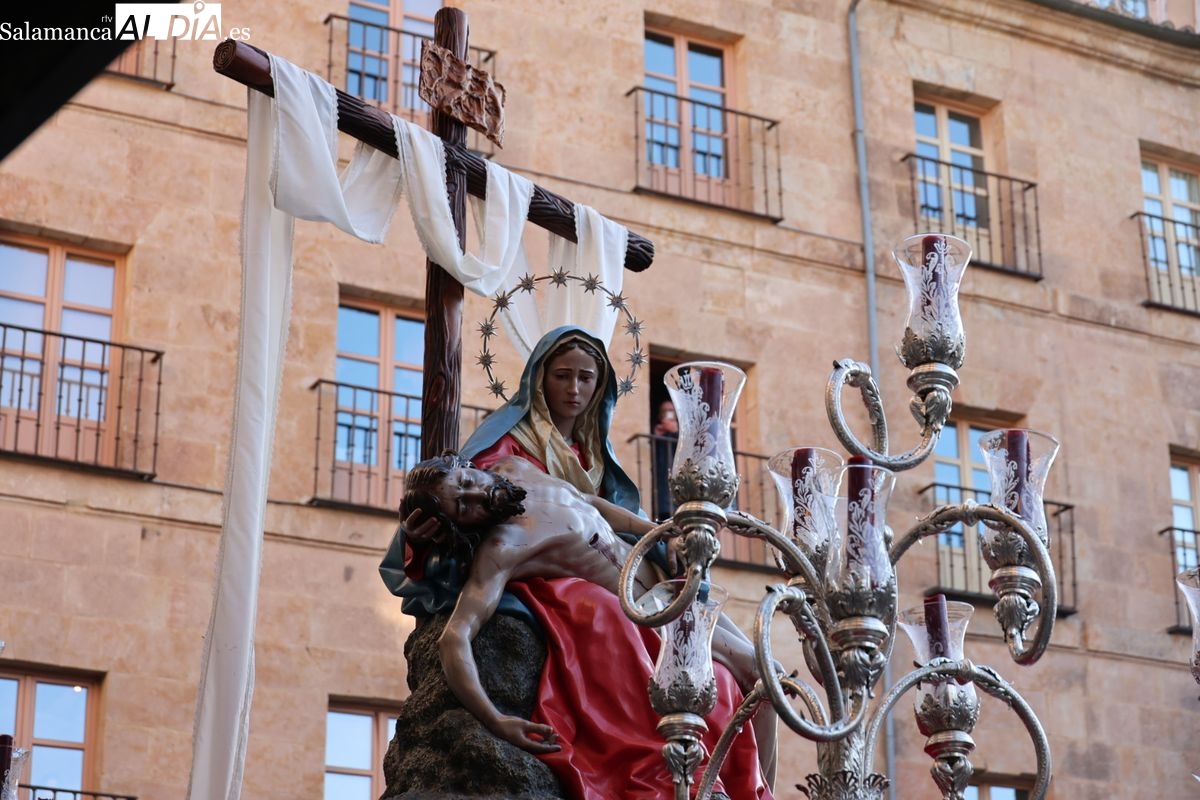 A las 5:00 horas de la mañana, las puertas del Convento de San Esteban se han abierto para dar inicio a una de las procesiones más esperadas de la Semana Santa salmantina. Cientos de fieles se han congregado en los alrededores del templo para acompañar a la Hermandad Dominicana en su recorrido por las calles del centro de la ciudad.