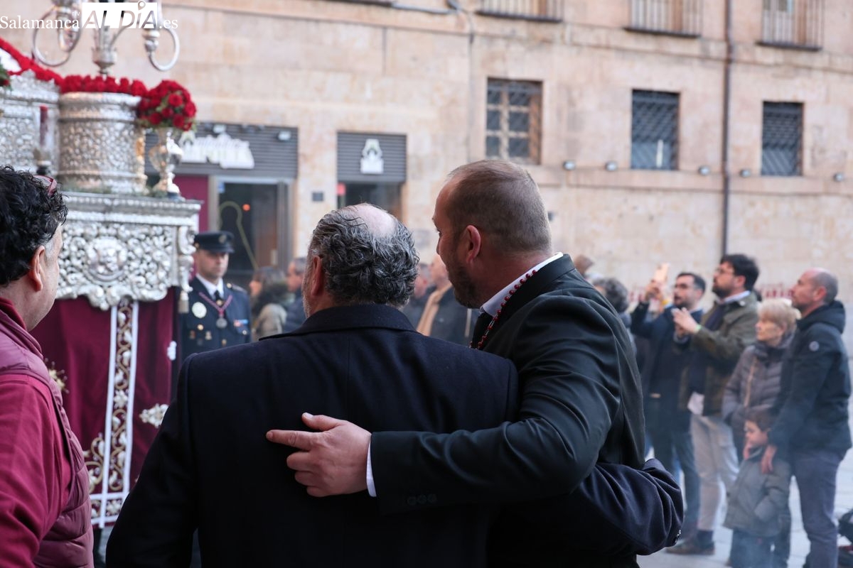 El momento más conmovedor de la jornada se ha vivido al finalizar el recorrido. De regreso al Convento de San Esteban, la hermandad ha querido tener un recuerdo especial para Miguel Ángel Ledesma, antiguo capataz del paso de Jesús de la Pasión, fallecido recientemente.