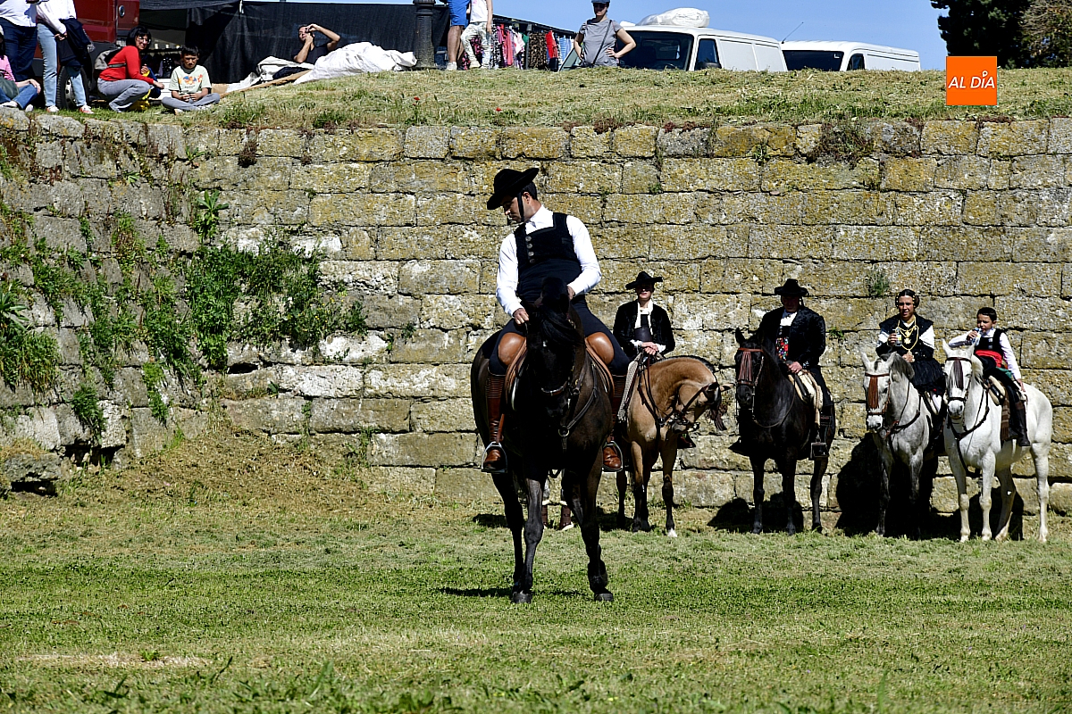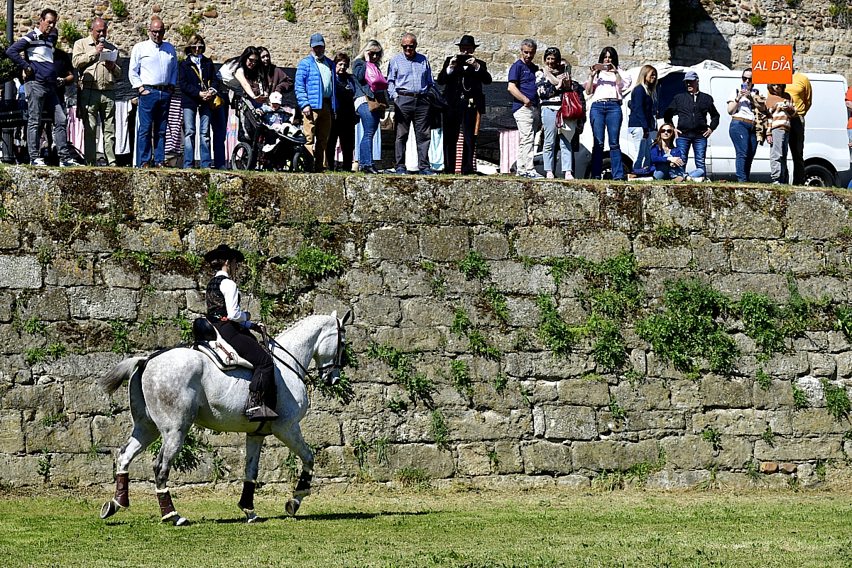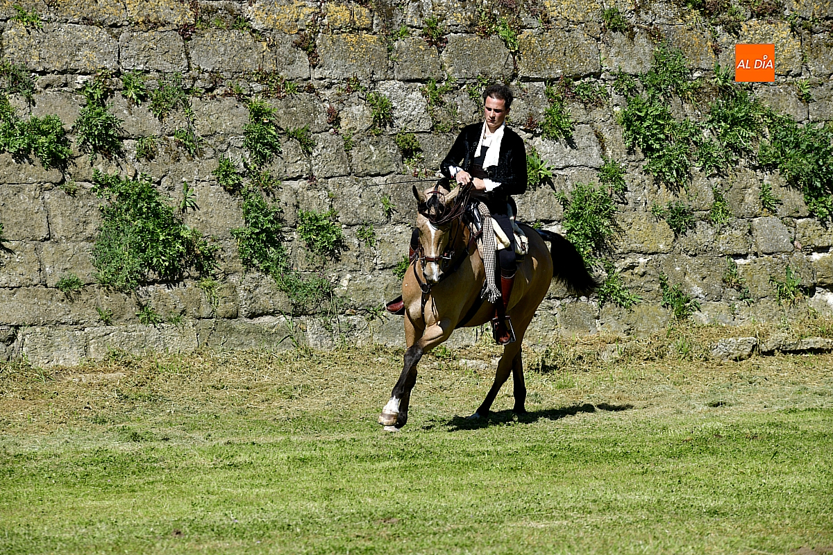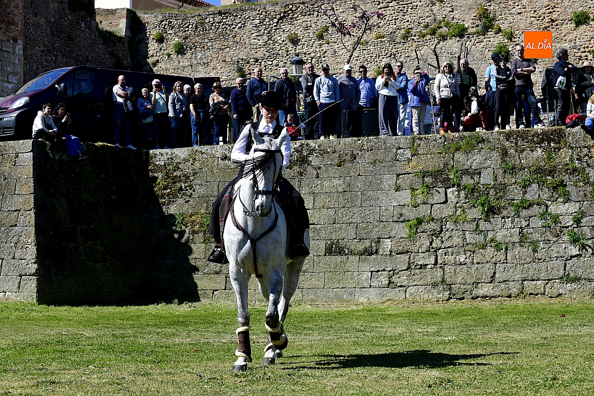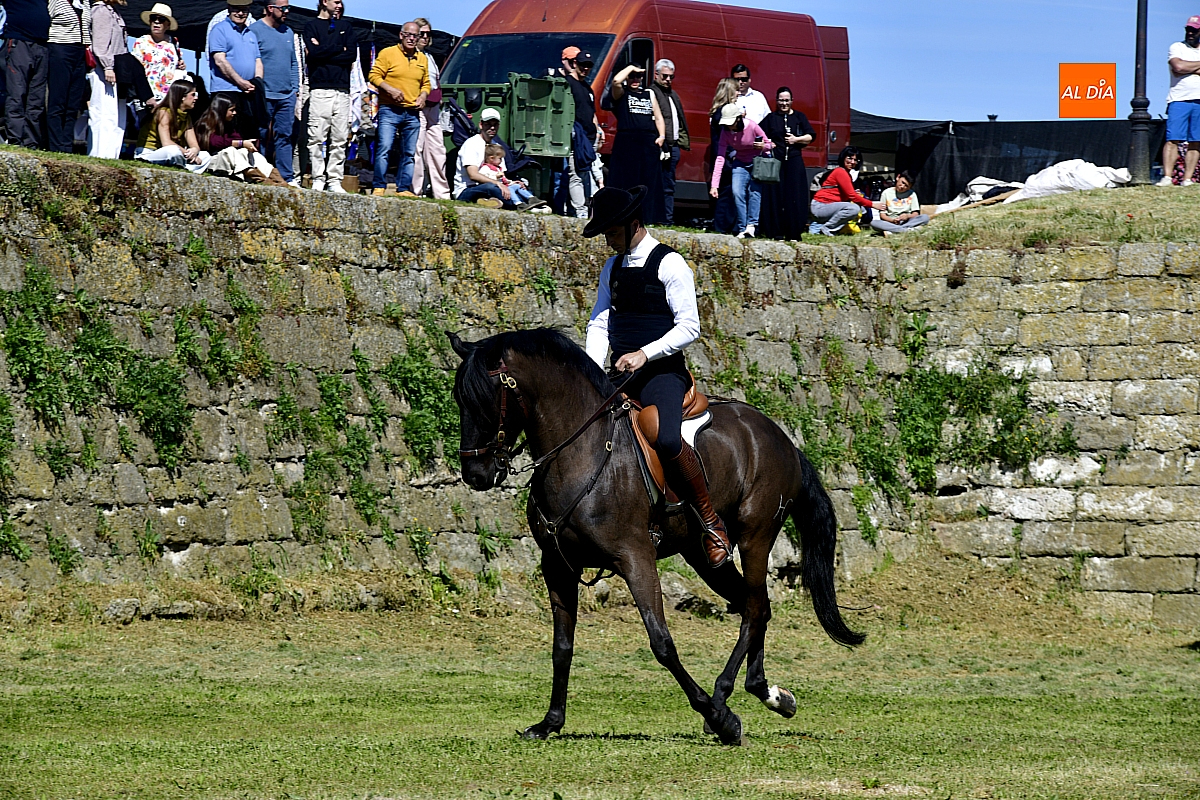 El foso de la Puerta del Sol acogió, a mediodía, uno de los momentos más esperados: la exhibición de doma vaquera charra salmantina. Lejos de ser un mero espectáculo, la demostración se reveló como una expresión depurada de un saber ancestral, en el que caballo y jinete dialogan con precisión y elegancia. El folclorista y experto ecuestre José Ramón Cid fue desgranando para el público las claves de esta disciplina, aportando contexto y profundidad a cada movimiento, a cada giro medido.