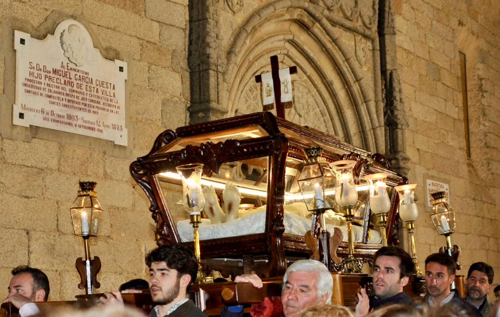 La solemnidad y el profundo respeto protagonizaron la tarde-noche del Viernes Santo en Macotera, donde numerosos vecinos y visitantes abarrotaron las calles para presenciar la tradicional procesión del Santo Entierro. El desfile, uno de los actos más destacados de la Semana Santa local, partió y concluyó en la iglesia parroquial de Nuestra Señora del Castillo, recorriendo la Villa en un ambiente de respeto y emoción.