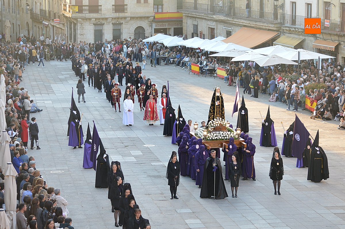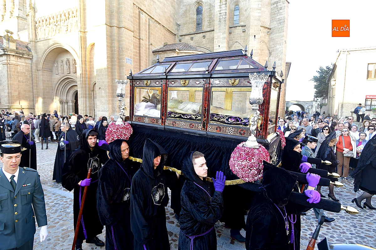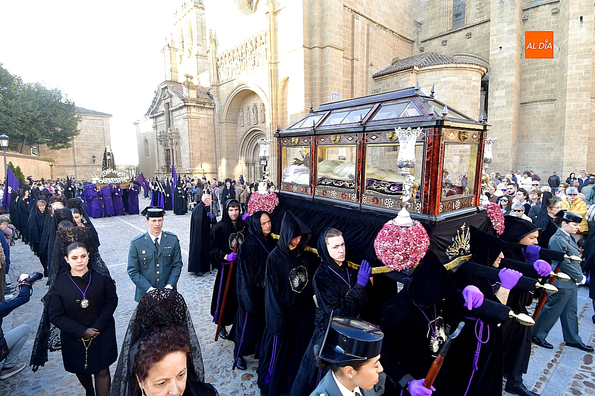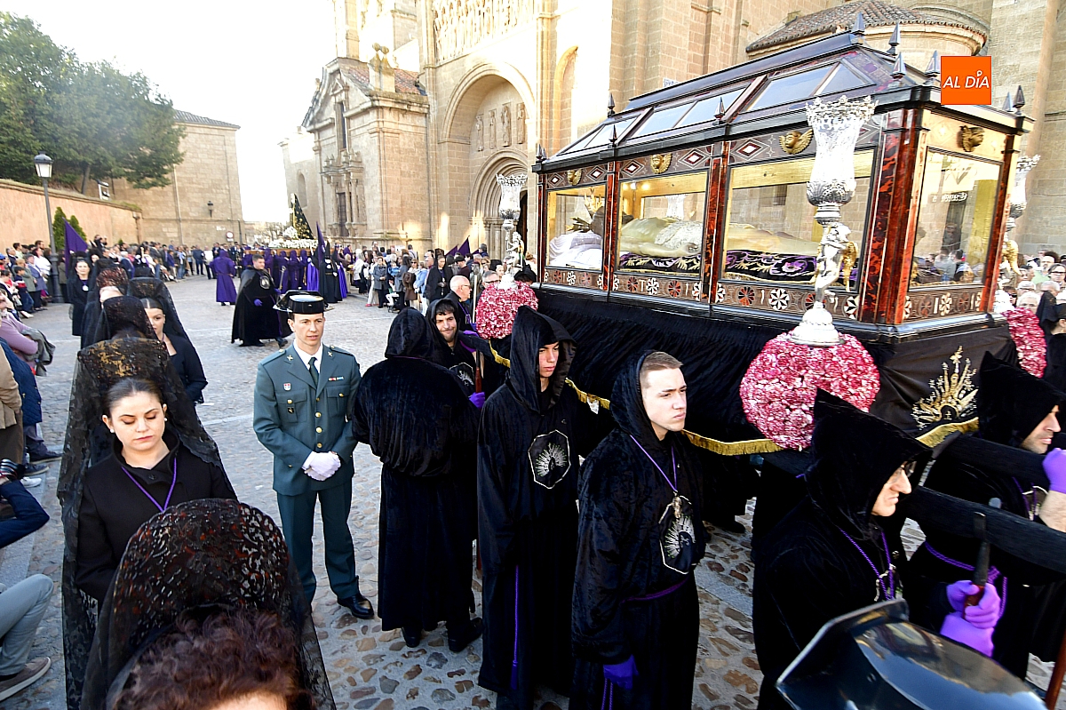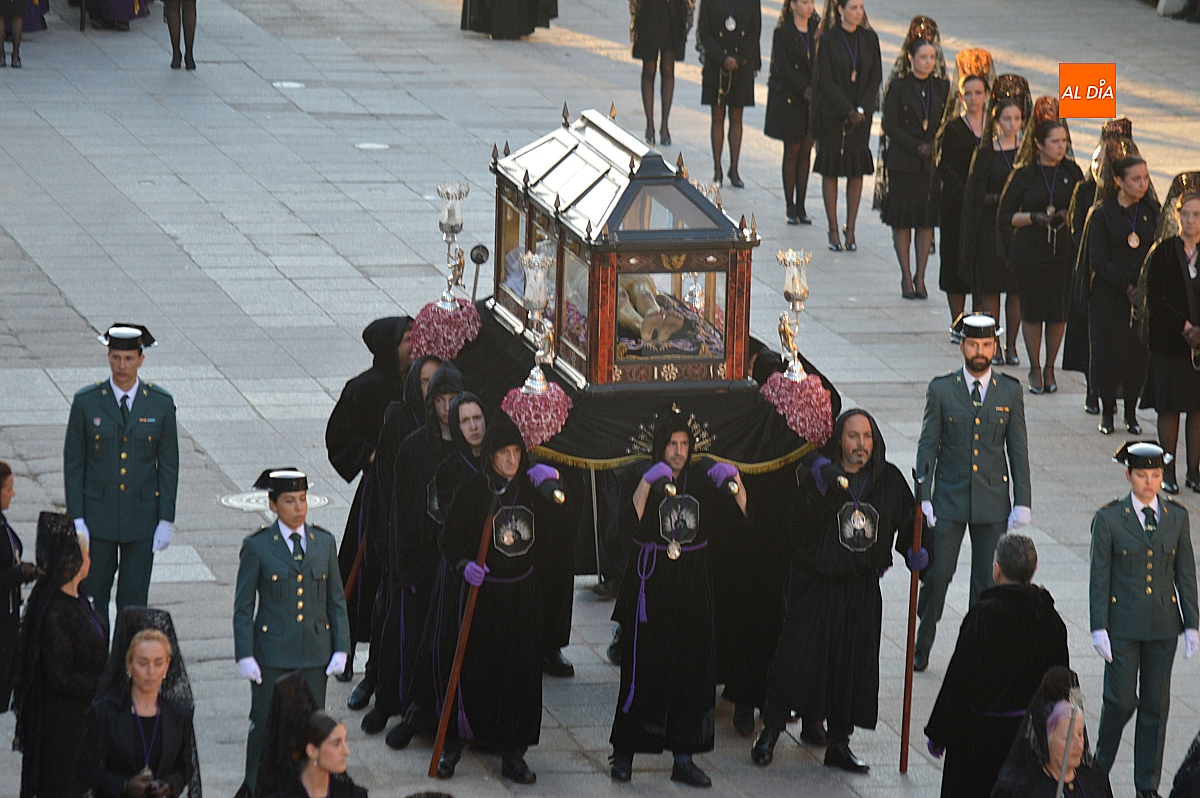 Pese a este contratiempo, apenas perceptible para muchos visitantes, la procesión continuó su desarrollo con la salida del Santo Sepulcro, escoltado por cuatro agentes de la Guardia Civil. Tras la imagen del Cristo Yacente avanzaba la Dolorosa, con el puñal que simboliza el dolor de la madre ante la pérdida del hijo.