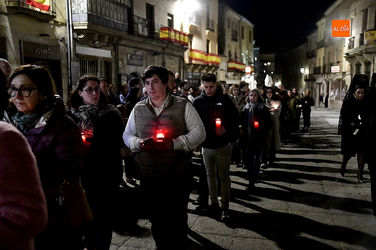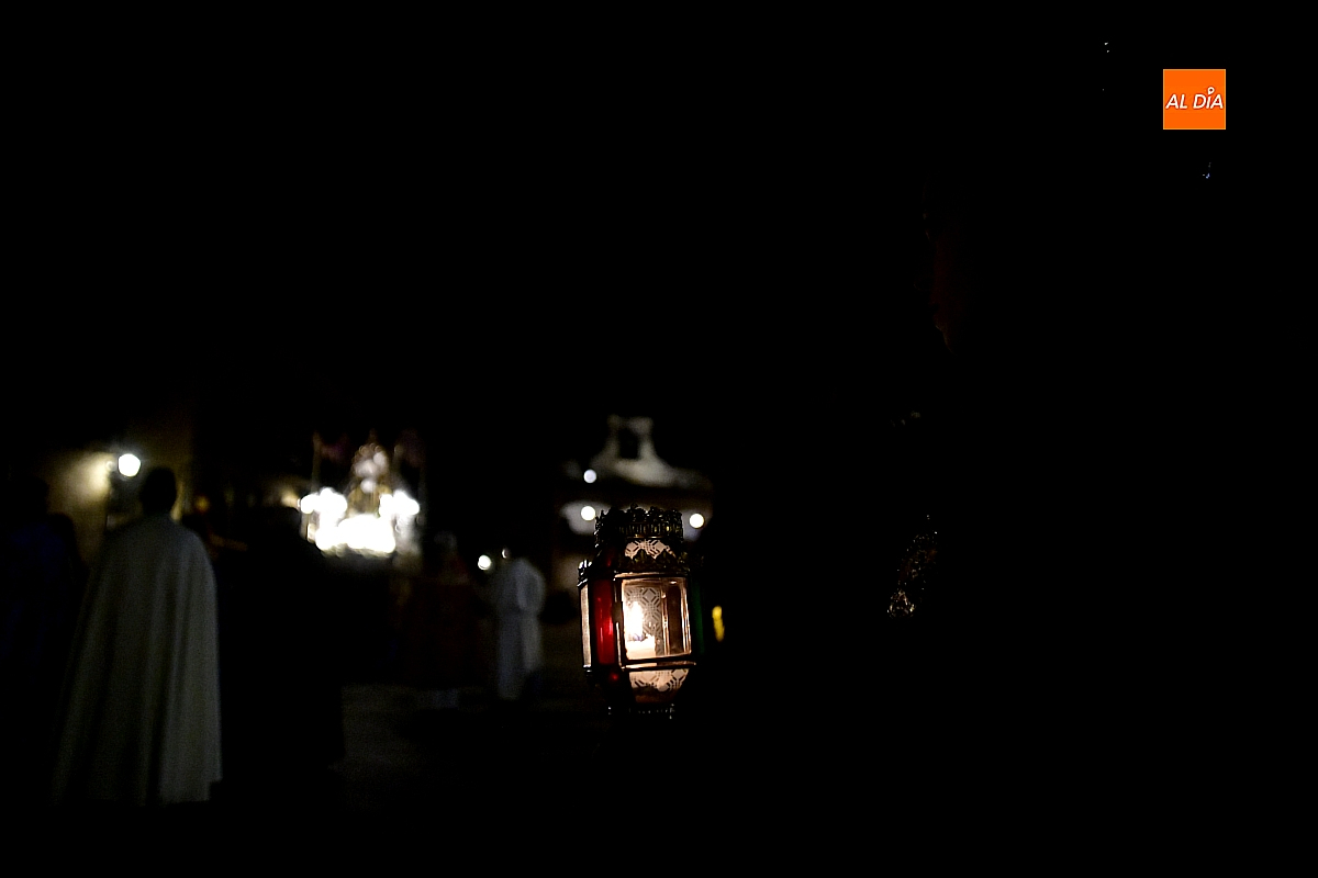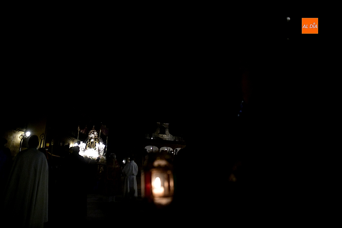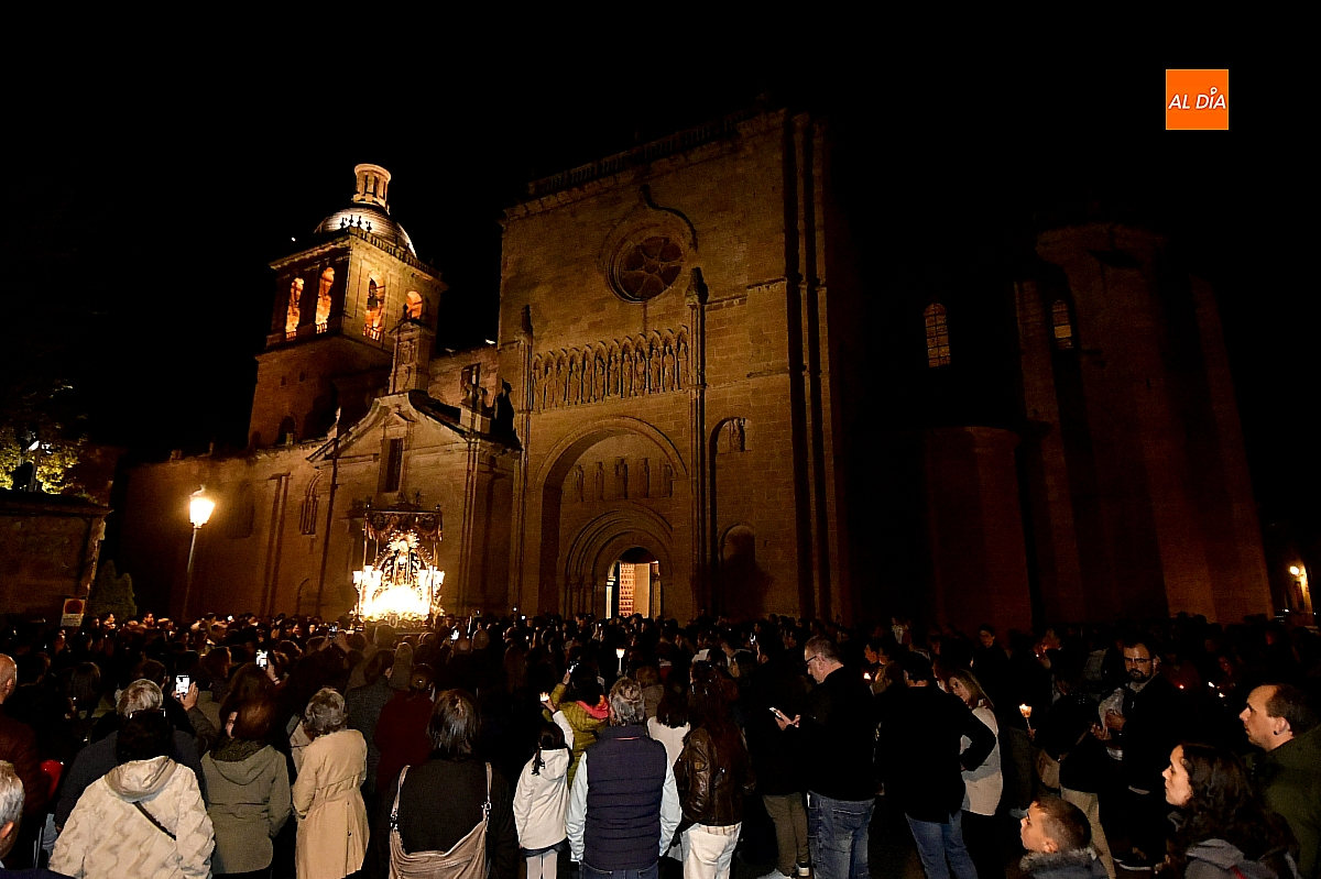 Aunque el programa fijaba la salida a las 22:30 horas, junto con el rezo del rosario y la correspondiente reflexión, no fue hasta pasadas las 23:15 cuando la imagen cruzó el umbral de la Puerta de las Cadenas de la S. I. Catedral. Allí aguardaba cerca de un millar de personas, en su mayoría portando velas, candiles y cirios que se encendieron al inicio de la procesión, componiendo un silencioso y sobrecogedor cortejo de luz.