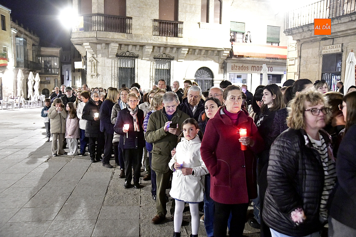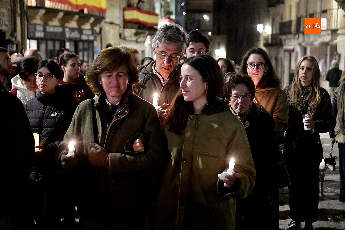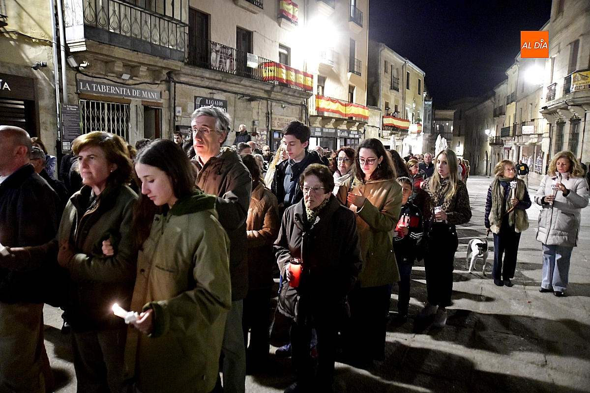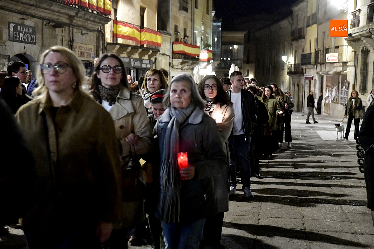 Aunque el programa fijaba la salida a las 22:30 horas, junto con el rezo del rosario y la correspondiente reflexión, no fue hasta pasadas las 23:15 cuando la imagen cruzó el umbral de la Puerta de las Cadenas de la S. I. Catedral. Allí aguardaba cerca de un millar de personas, en su mayoría portando velas, candiles y cirios que se encendieron al inicio de la procesión, componiendo un silencioso y sobrecogedor cortejo de luz.