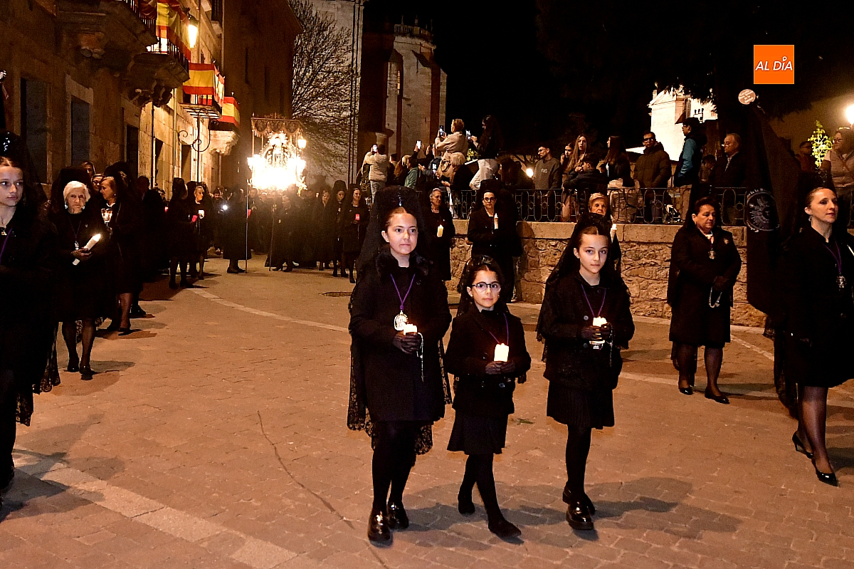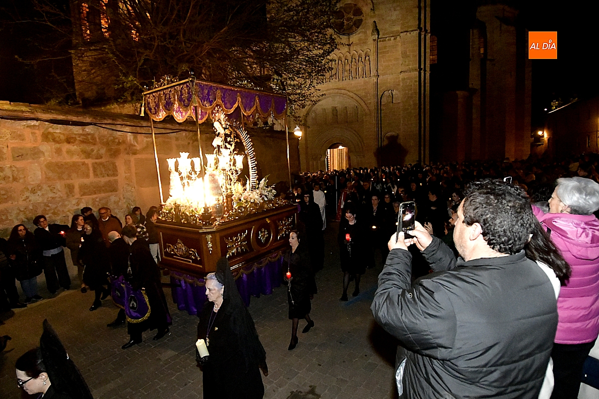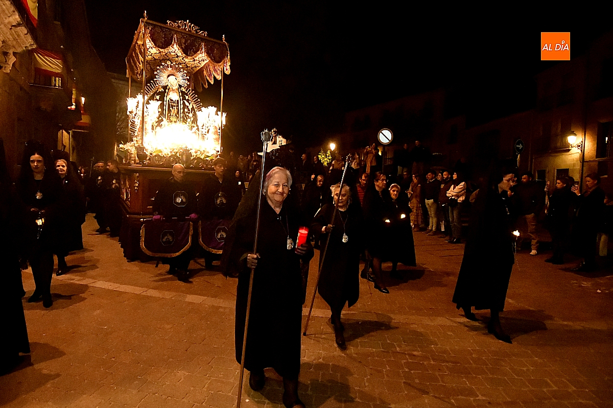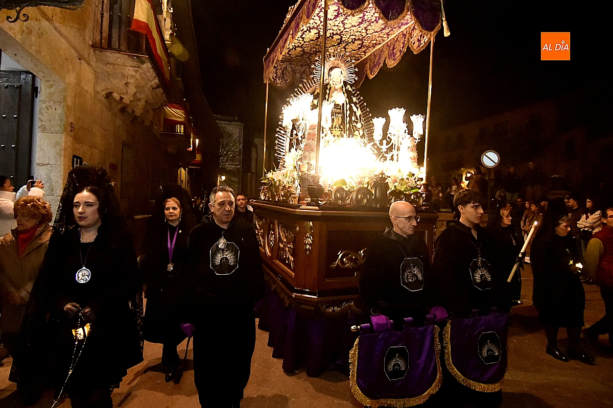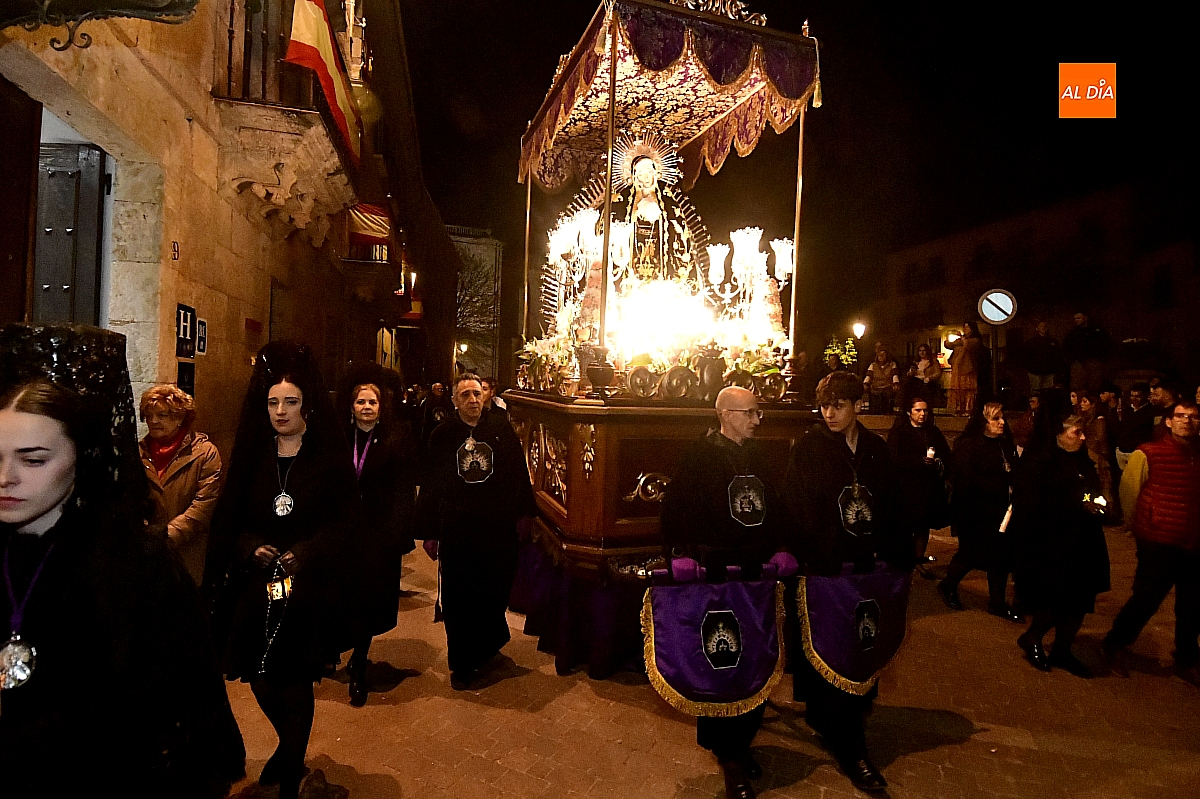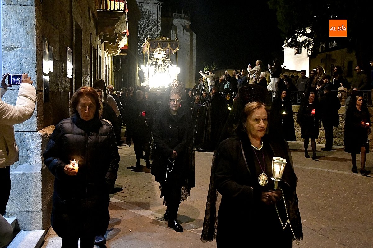 La noche, templada y serena, volvió a reunir a fieles de todas las edades en torno a la Virgen de la Soledad, en una de las estampas más íntimas y concurridas de la Semana Santa mirobrigense.