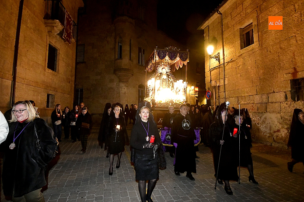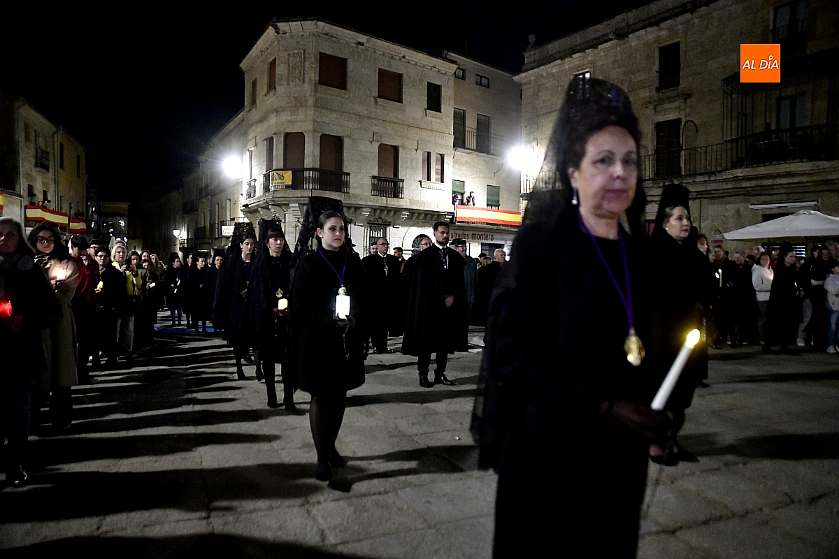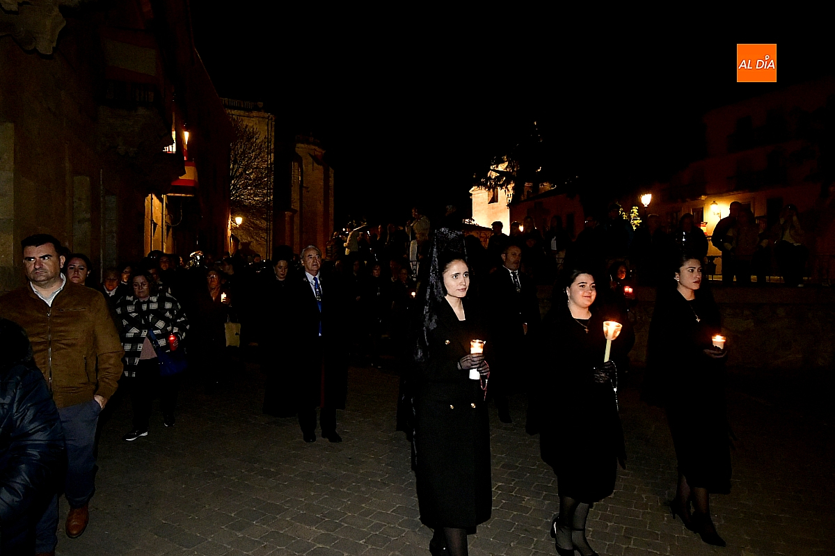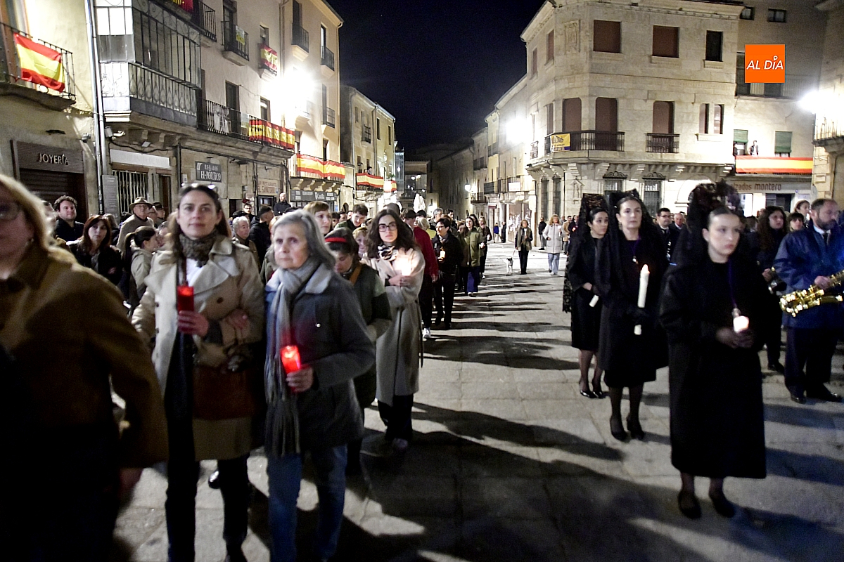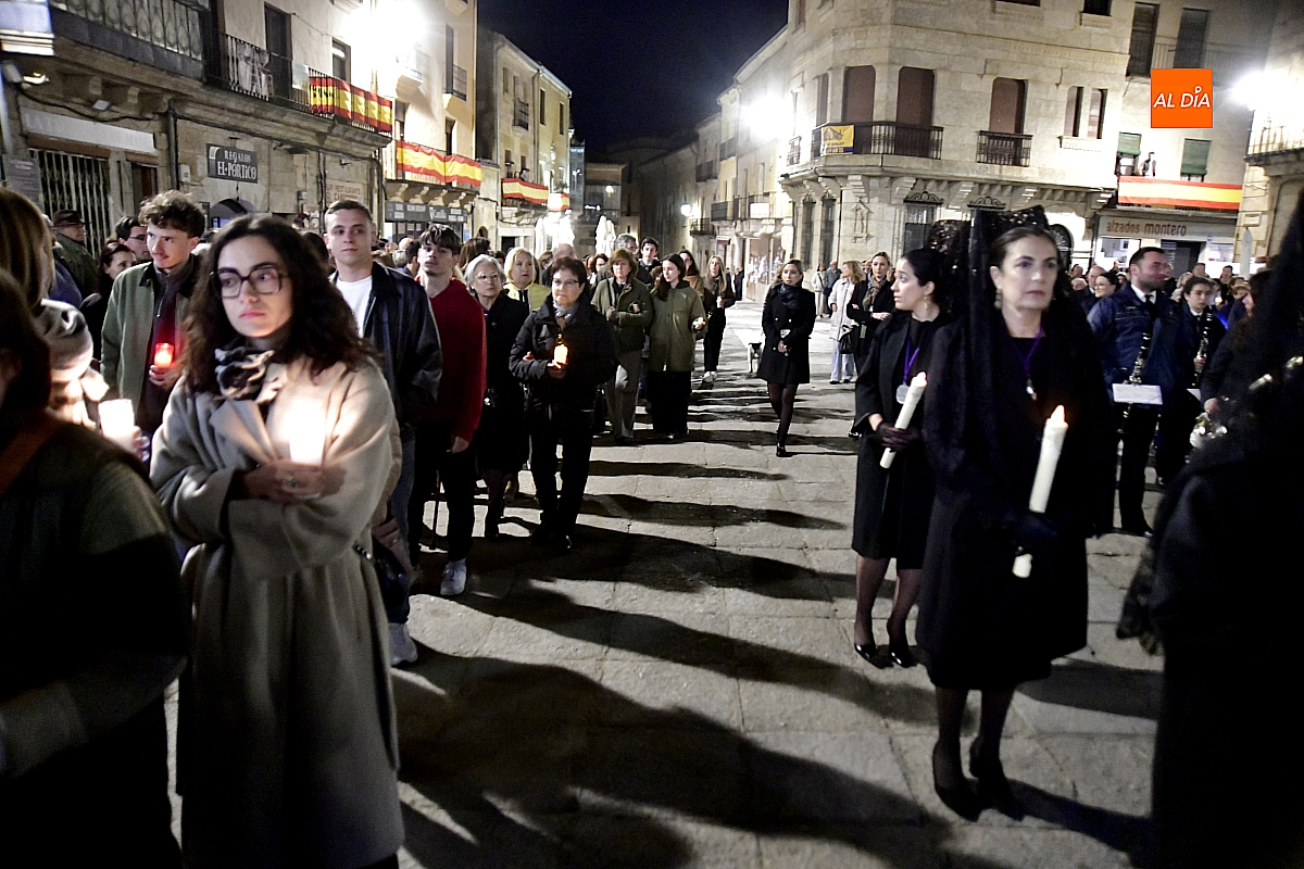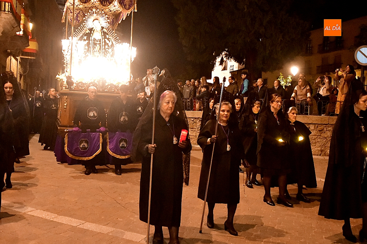 La noche, templada y serena, volvió a reunir a fieles de todas las edades en torno a la Virgen de la Soledad, en una de las estampas más íntimas y concurridas de la Semana Santa mirobrigense.